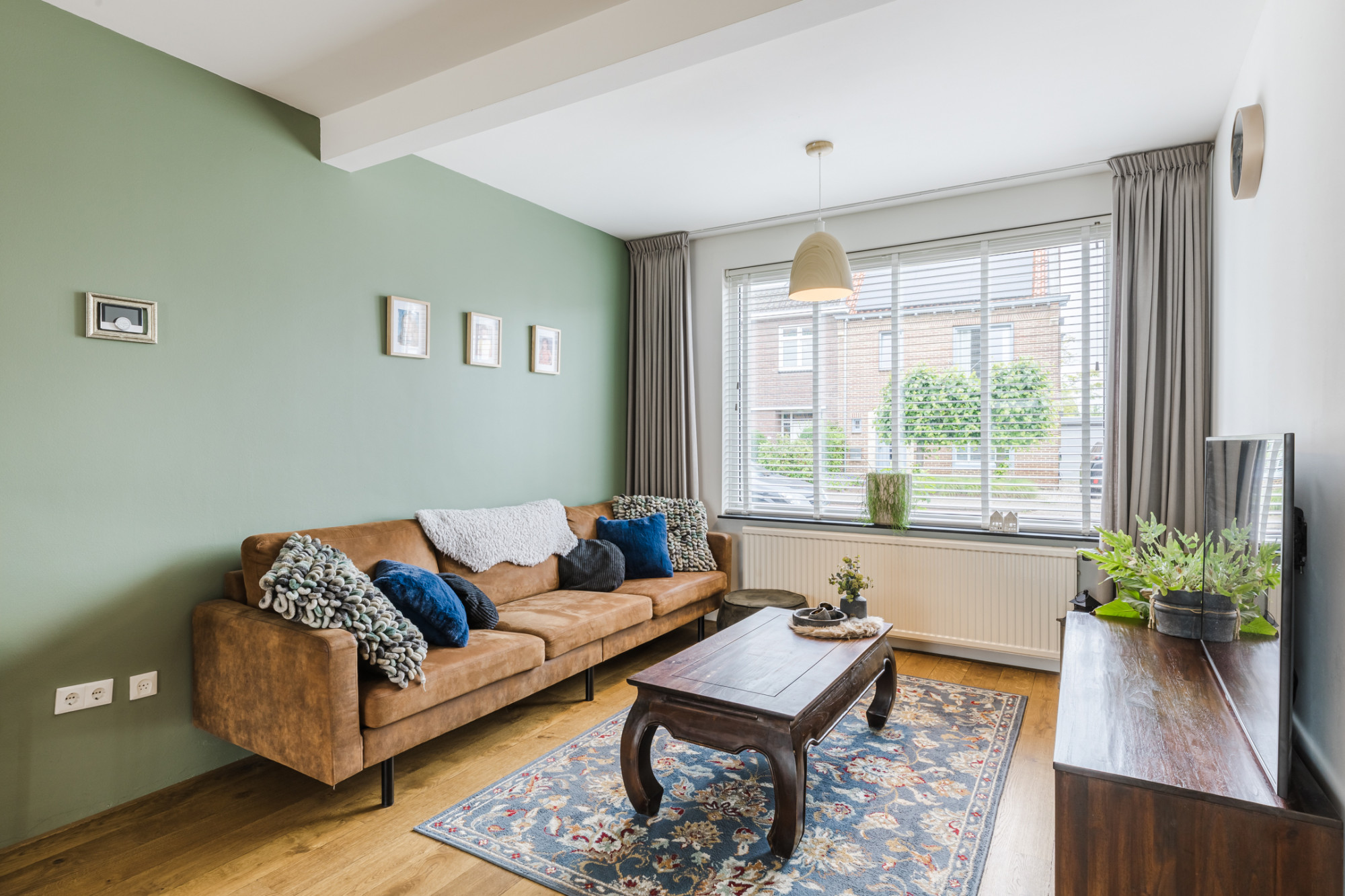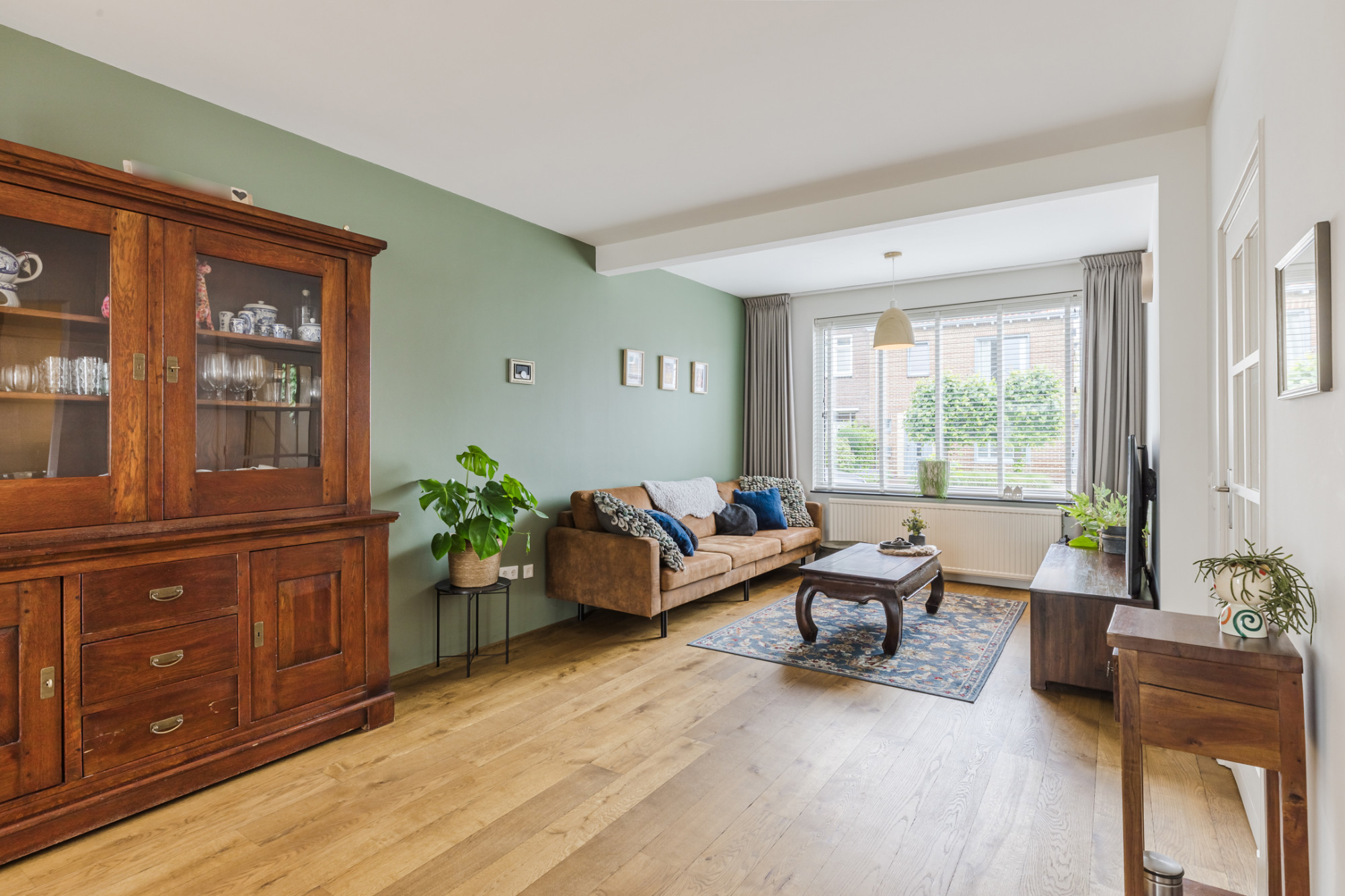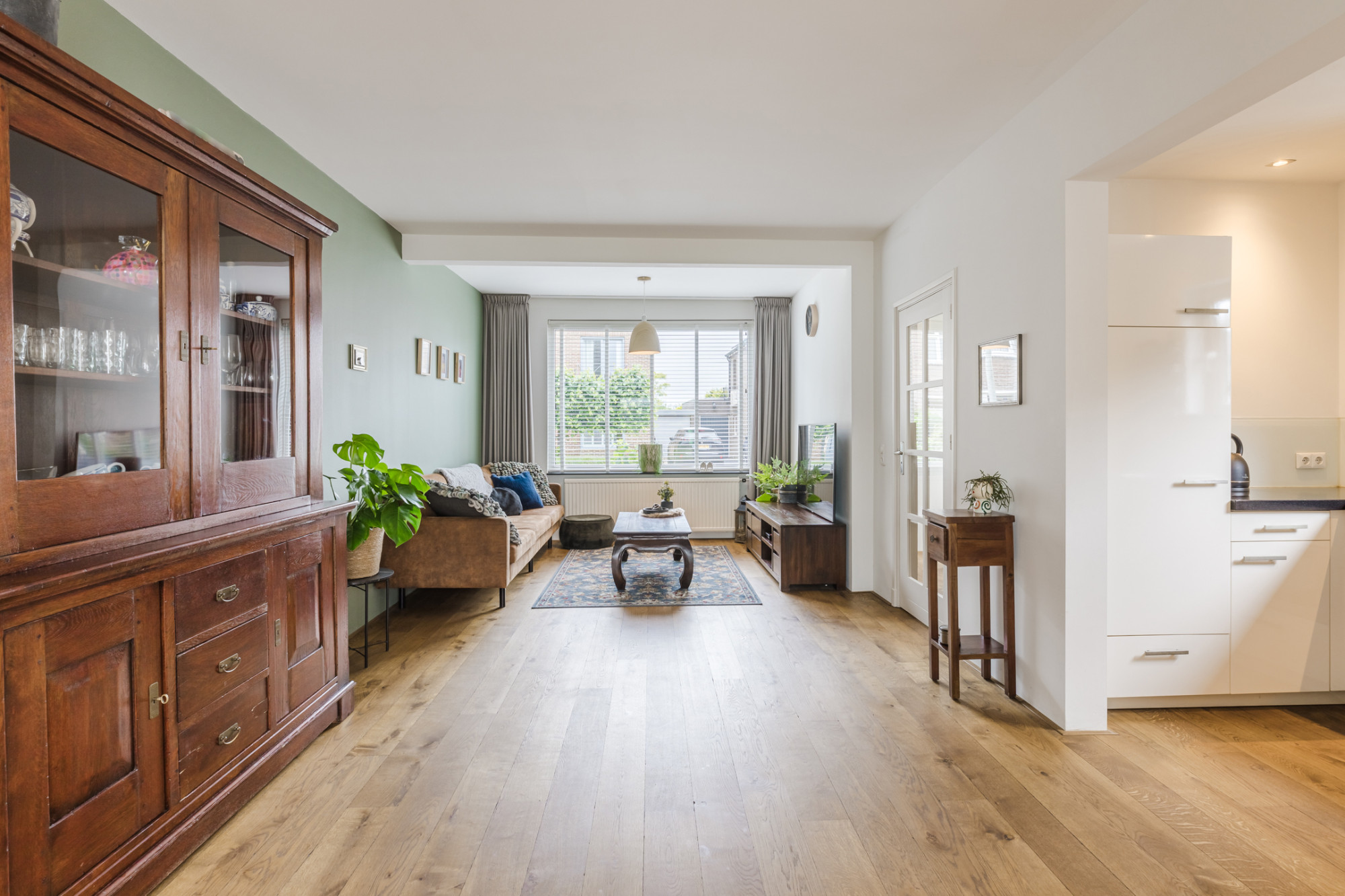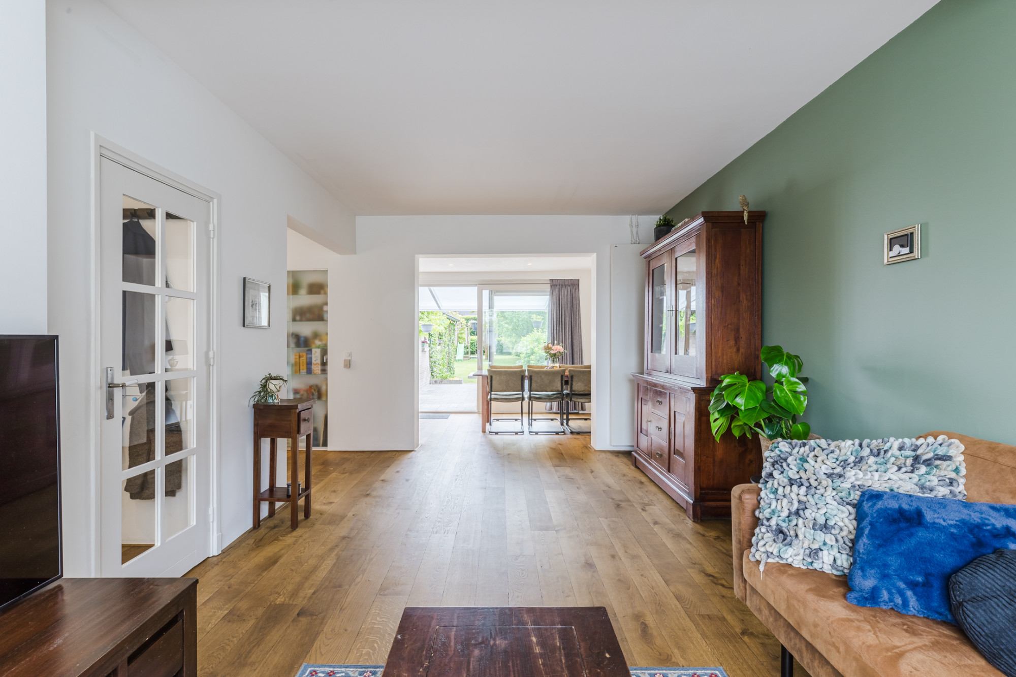 Woonkamer met houten planken vloer.