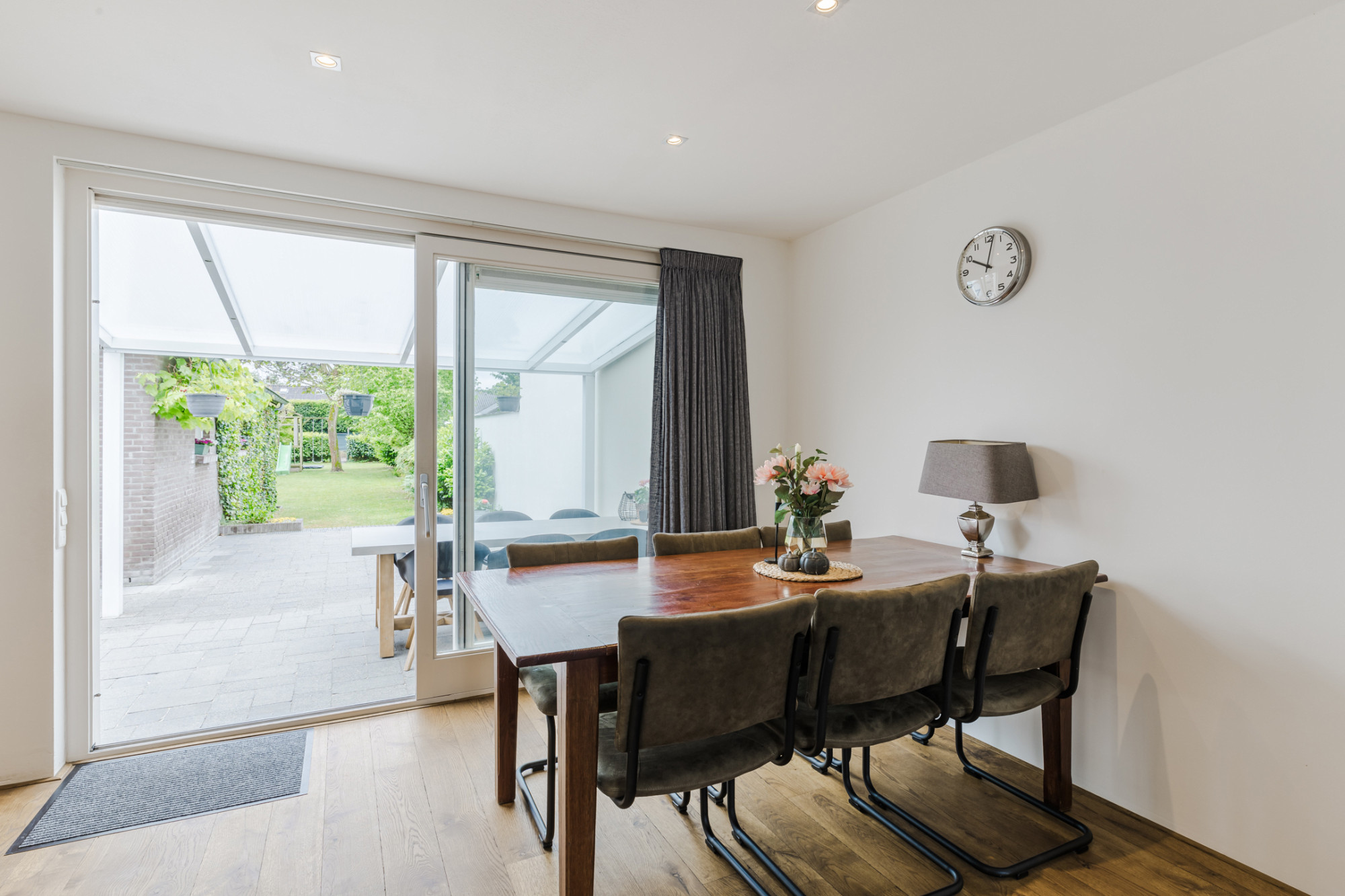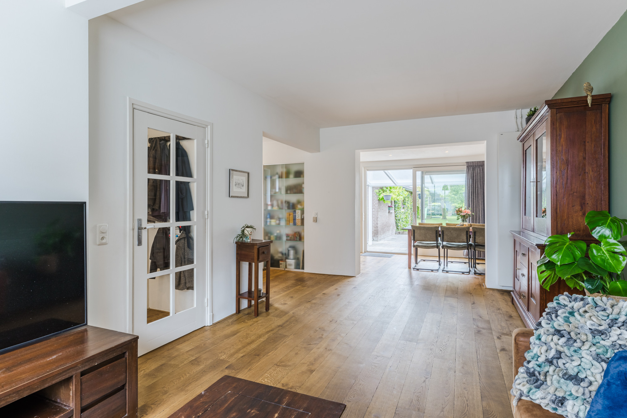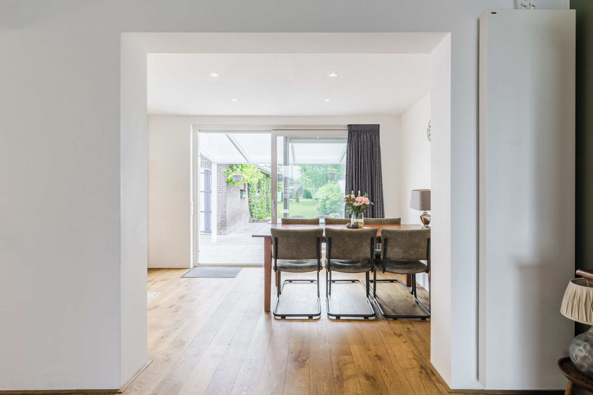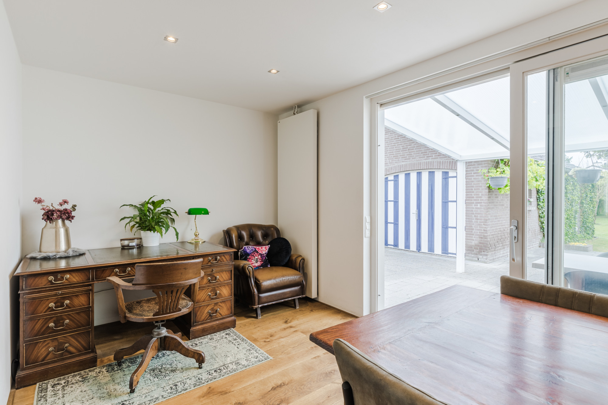 Aanbouw met houten planken vloer en schuifpui met toegang naar het overdekte terras.