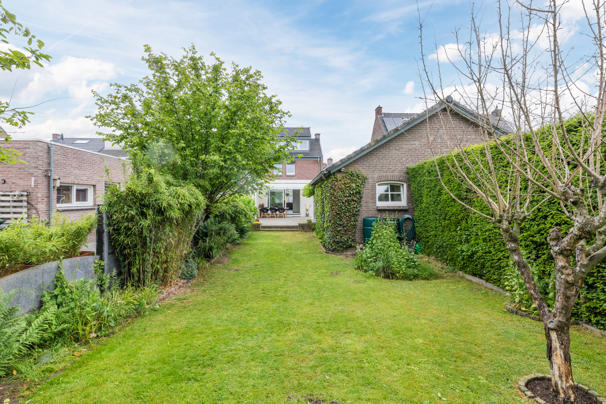 De achtertuin is een waar groen paradijs: diep en zorgvuldig aangelegd met volwassen bomen, hagen, gazon en sierlijke beplanting. De tuin biedt optimale privacy en rust.