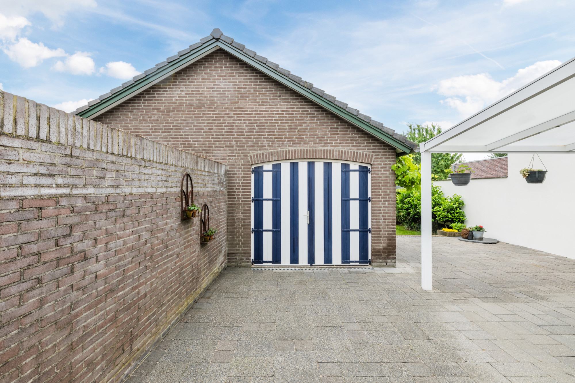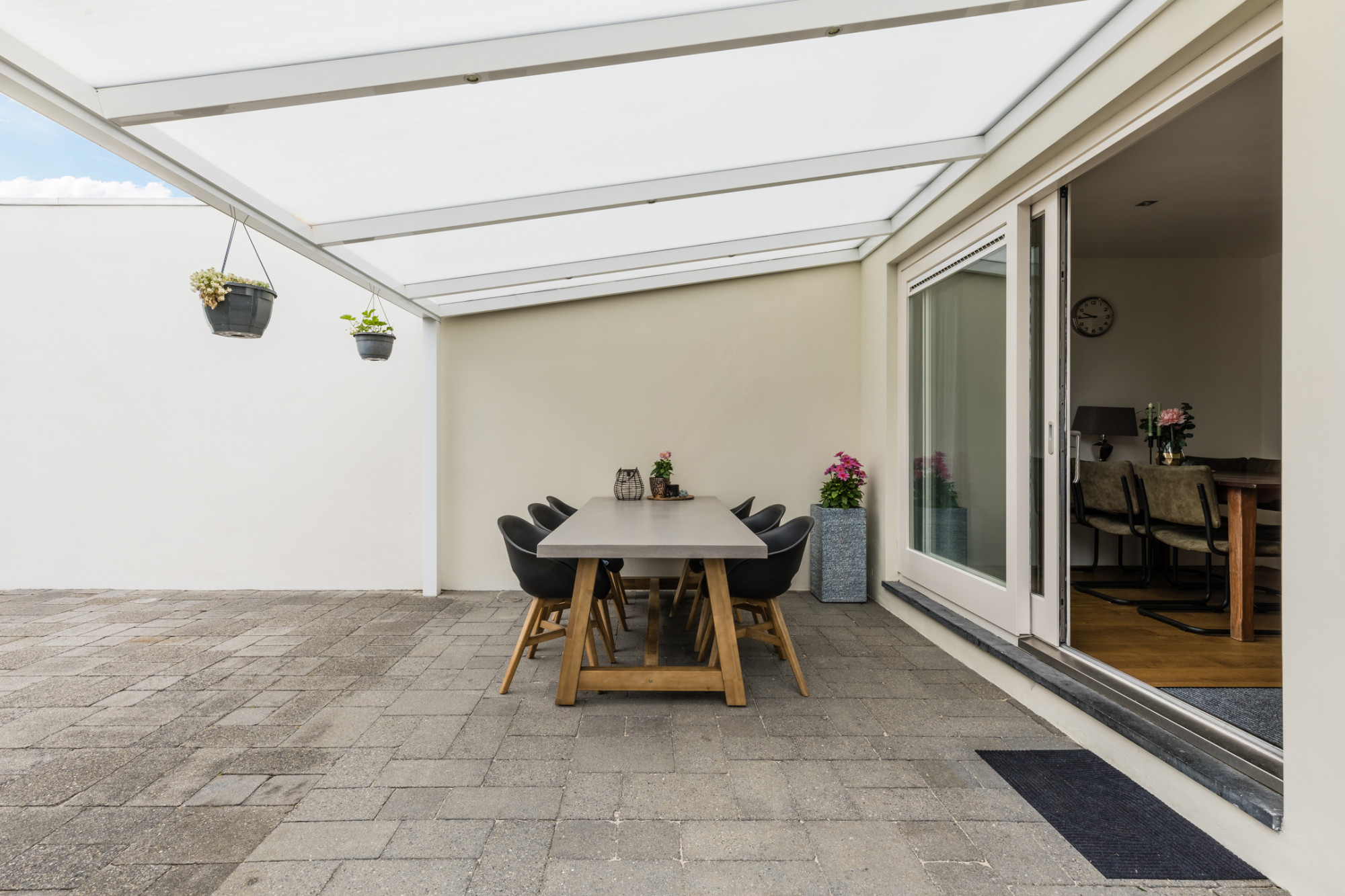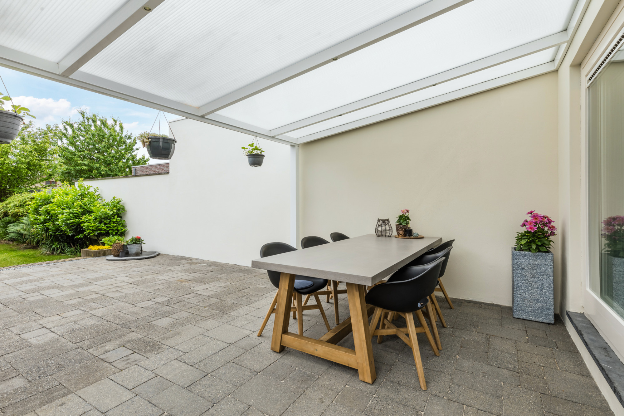 Terras met aluminium overkapping en voorzien van sierbestrating.