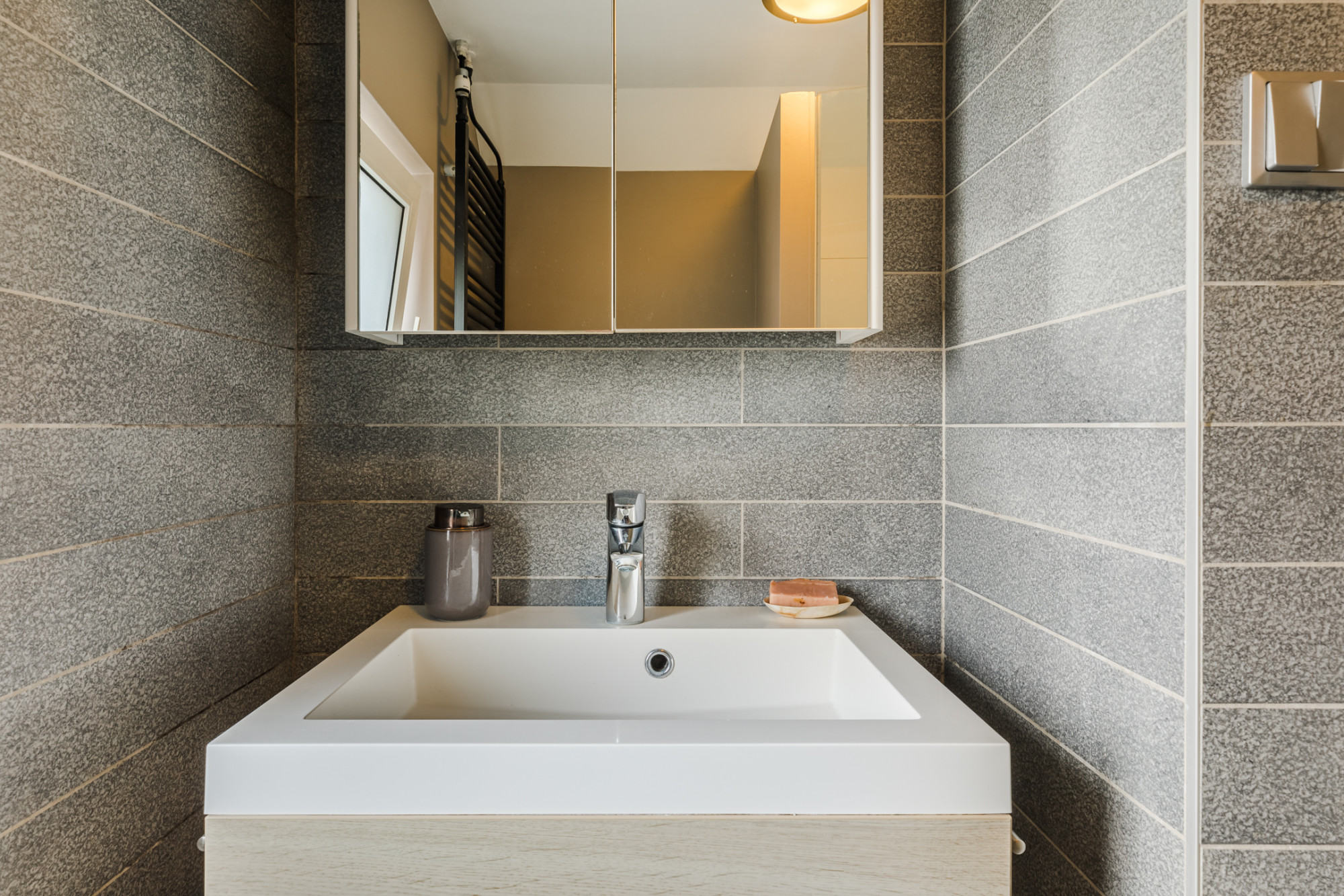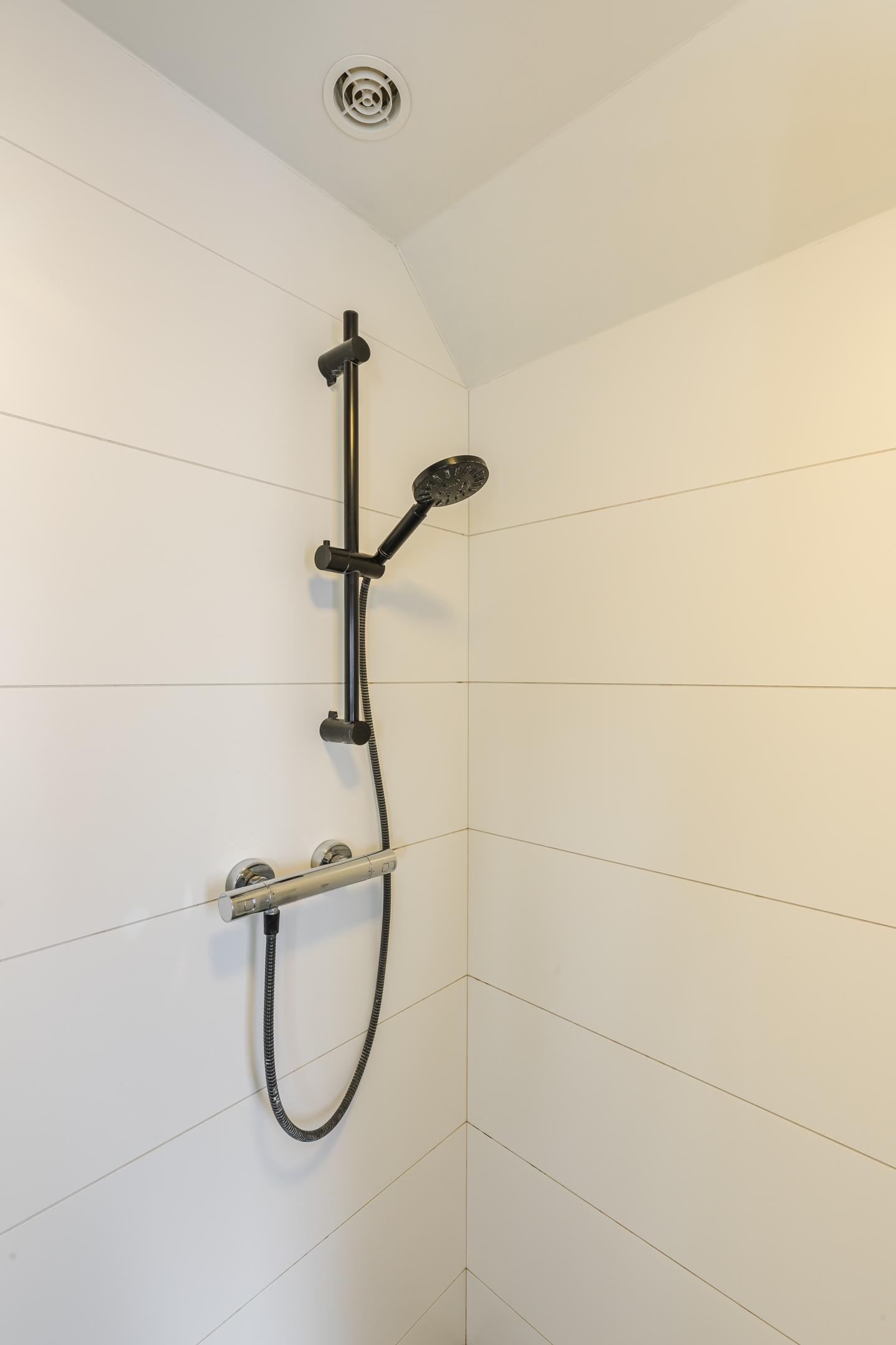 De gemoderniseerde badkamer is netjes en tijdloos afgewerkt en beschikt over een inloopdouche, een wastafelmeubel en een toilet.