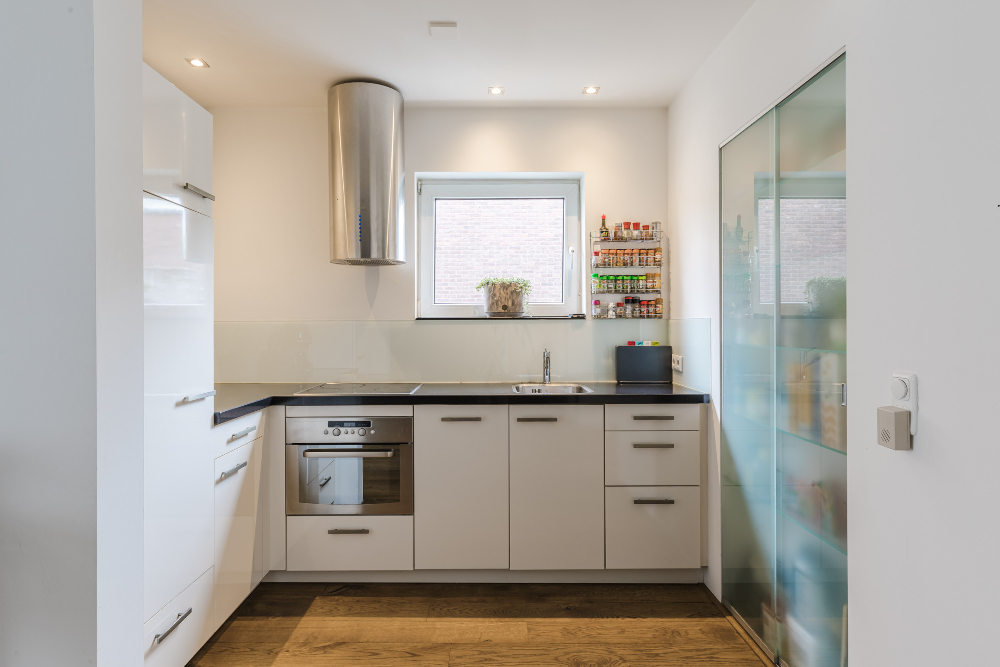 Half open keuken met aanbouwopstelling v.v. vaatwasser, koelkast, keramische kookplaat en afzuigkap.
