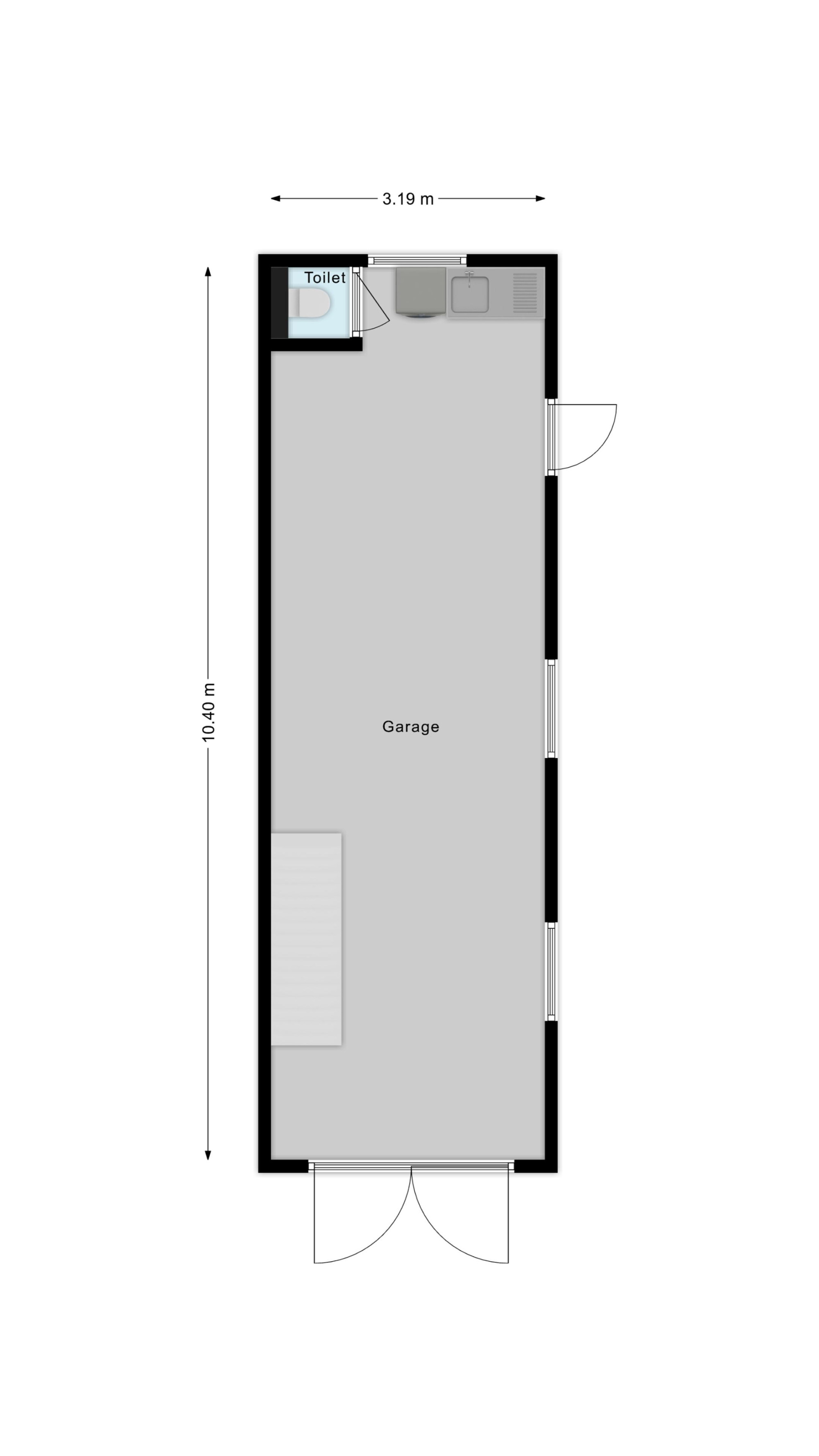 Royale garage met een grondoppervlakte van ca. 33 m2 én met vaste trap naar garagezolder, toilet en keukenblok.