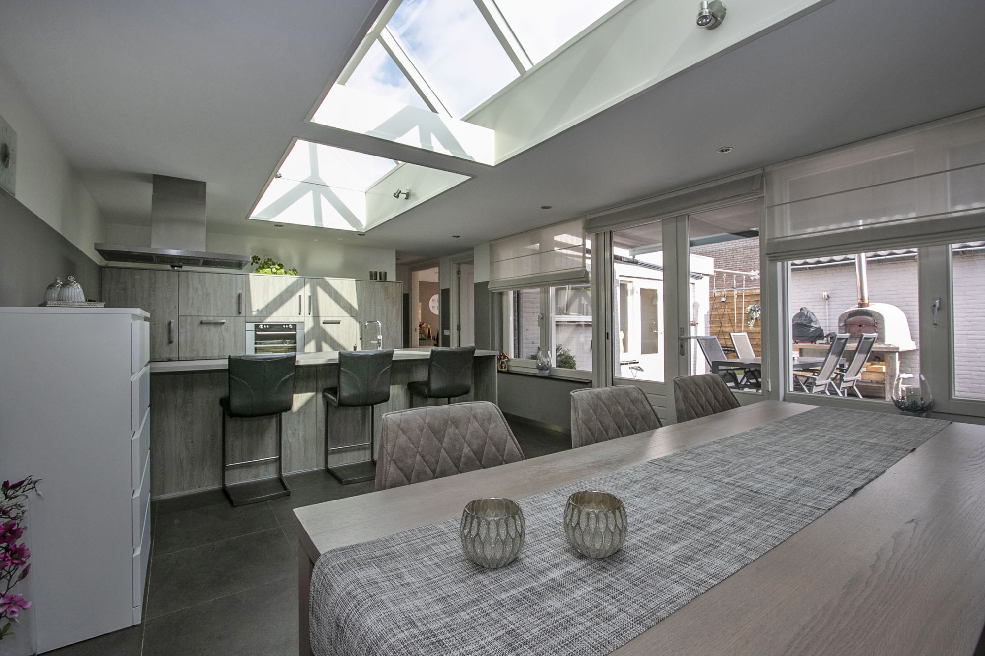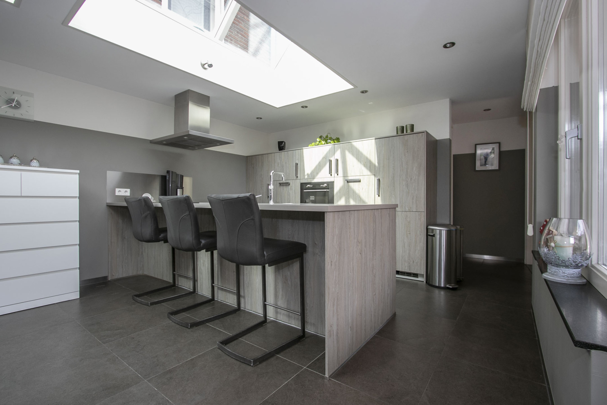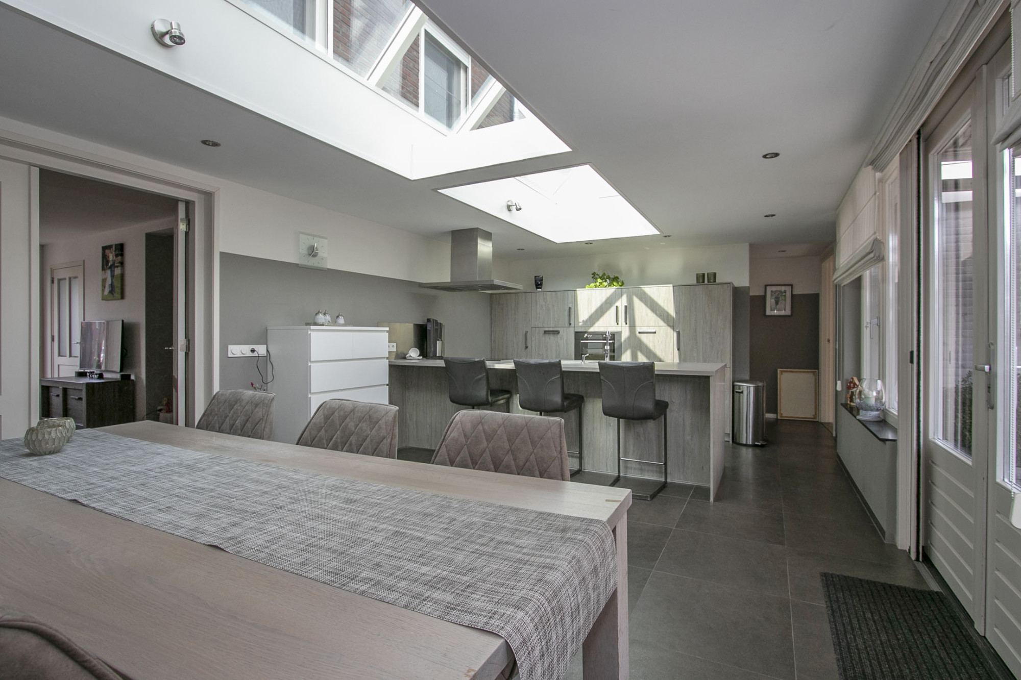 In de ruime leefkeuken is een luxe lichtstraat geplaatst die de keuken voorziet van veel natuurlijk daglicht. De keuken bestaat uit een groot kookeiland met een XL inductiekookplaat, afzuigkap, koelkast, vriezer, vaatwasser, combi-oven en een Quooker. Aan het kookeiland kun je gezellig samen zitten terwijl er gekookt wordt. Ook is er nog voldoende plek in de leefkeuken voor een grote eettafel. Een ideale plek om gezellig met vrienden en familie tijd door te brengen! Tevens is deze ruimte ook voorzien van een airco.