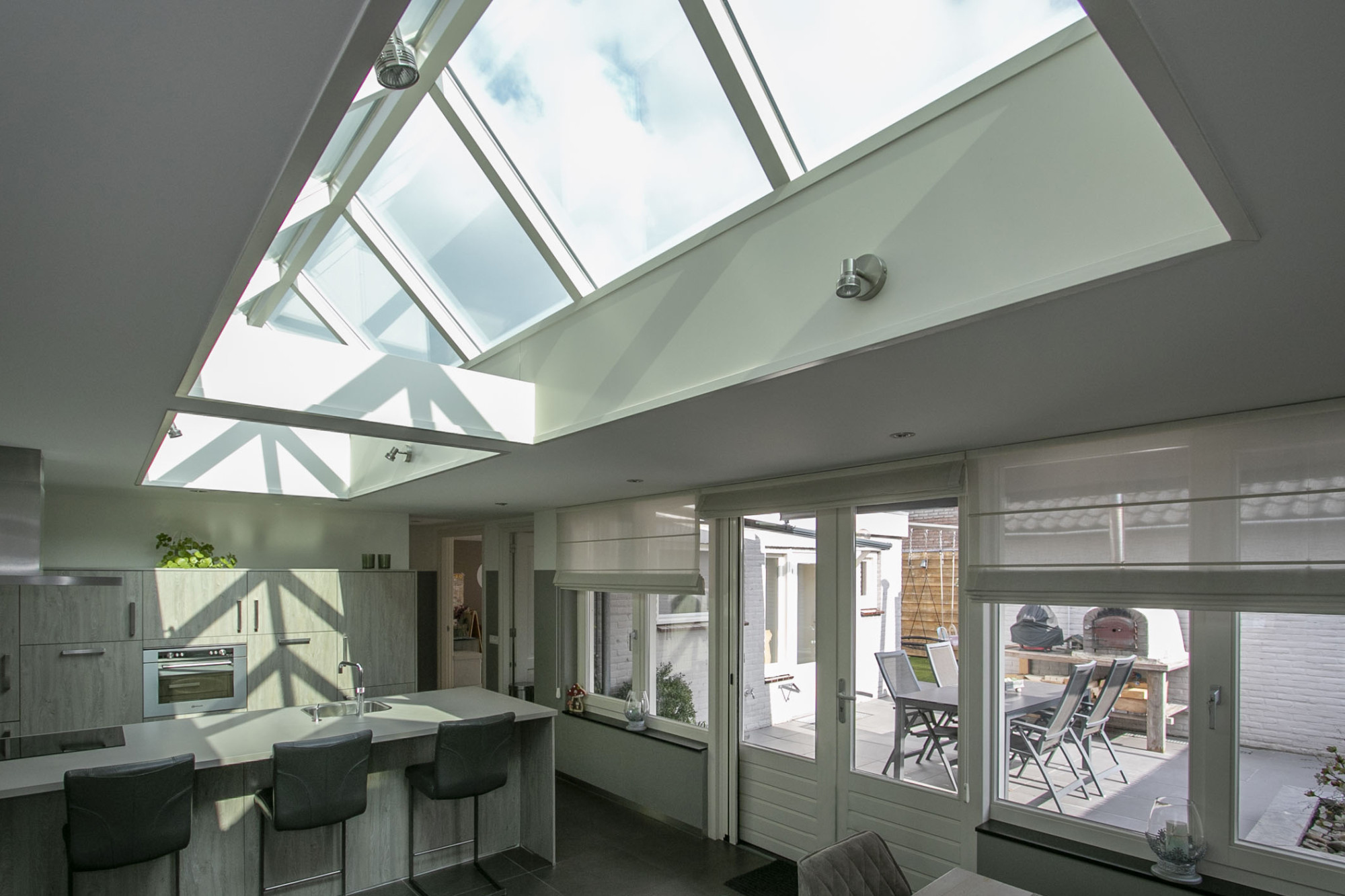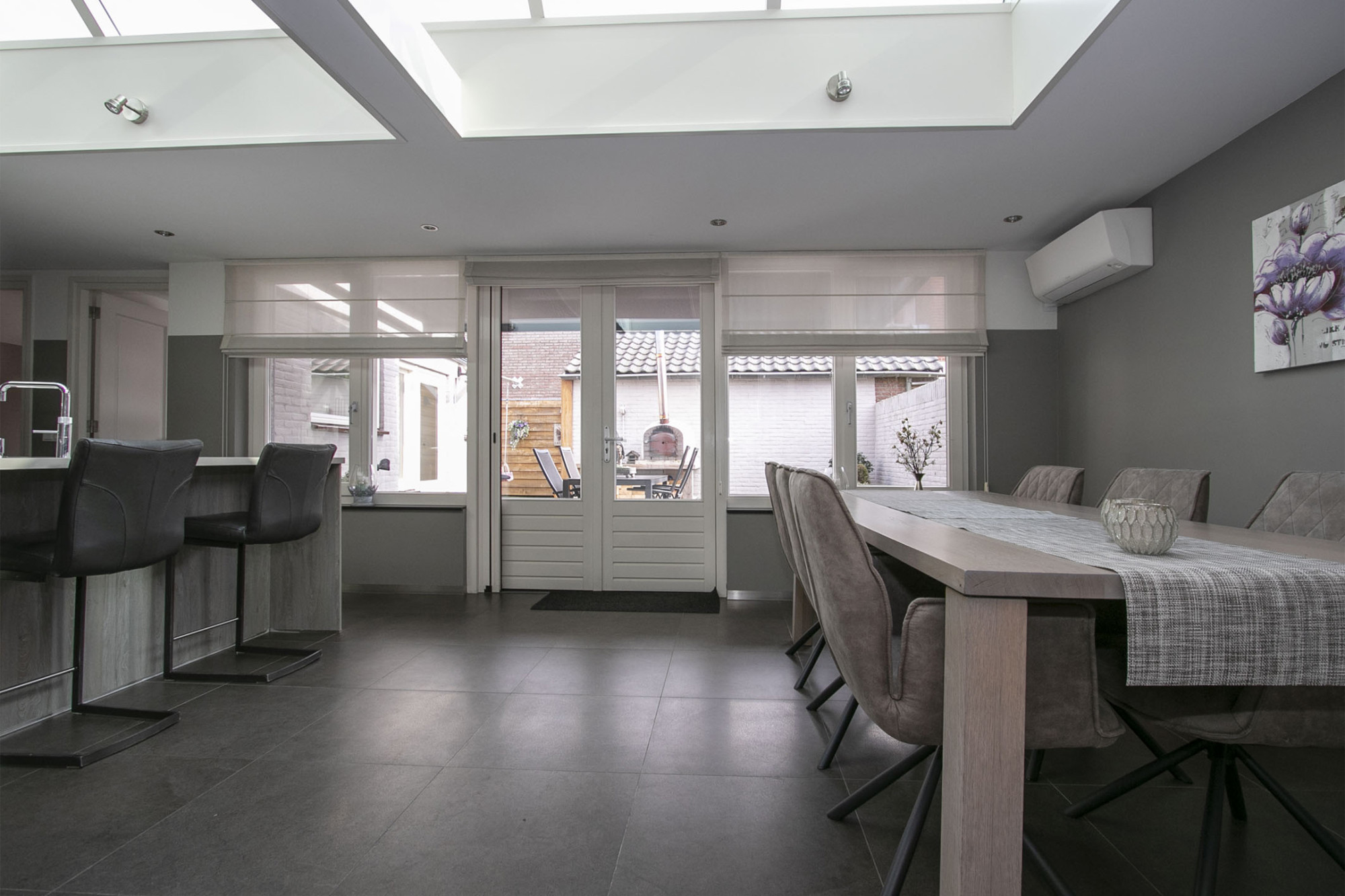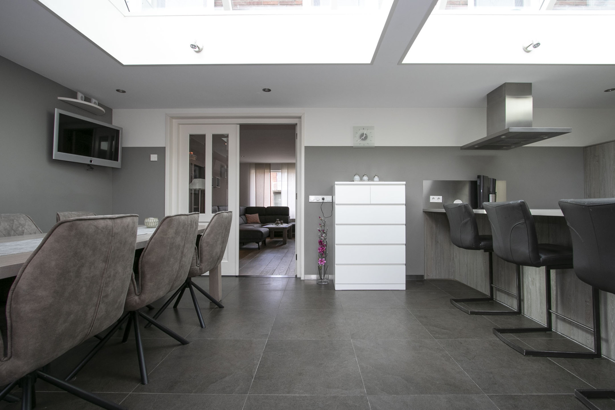 In de ruime leefkeuken is een luxe lichtstraat geplaatst die de keuken voorziet van veel natuurlijk daglicht. De keuken bestaat uit een groot kookeiland met een XL inductiekookplaat, afzuigkap, koelkast, vriezer, vaatwasser, combi-oven en een Quooker. Aan het kookeiland kun je gezellig samen zitten terwijl er gekookt wordt. Ook is er nog voldoende plek in de leefkeuken voor een grote eettafel. Een ideale plek om gezellig met vrienden en familie tijd door te brengen! Tevens is deze ruimte ook voorzien van een airco.