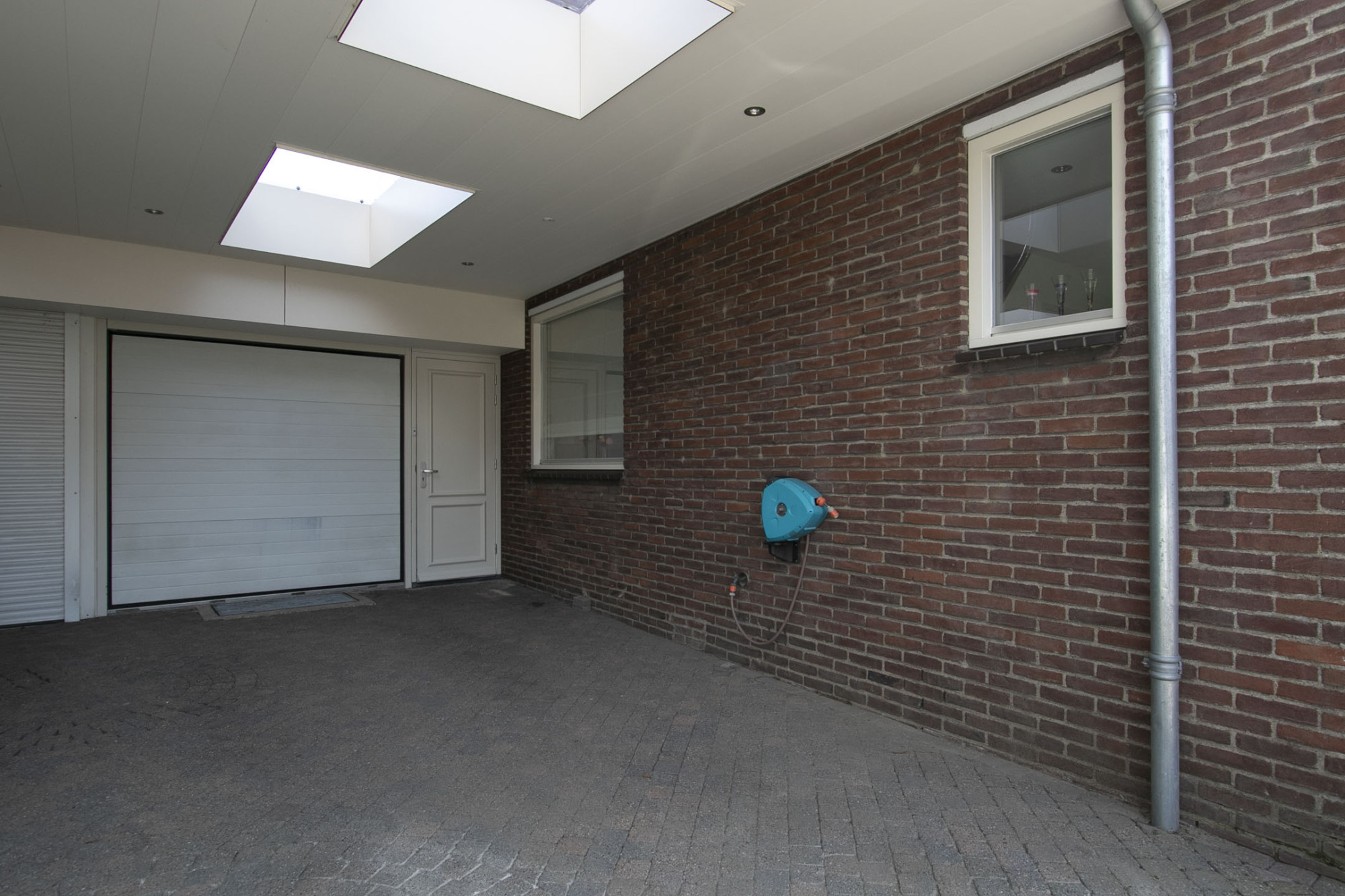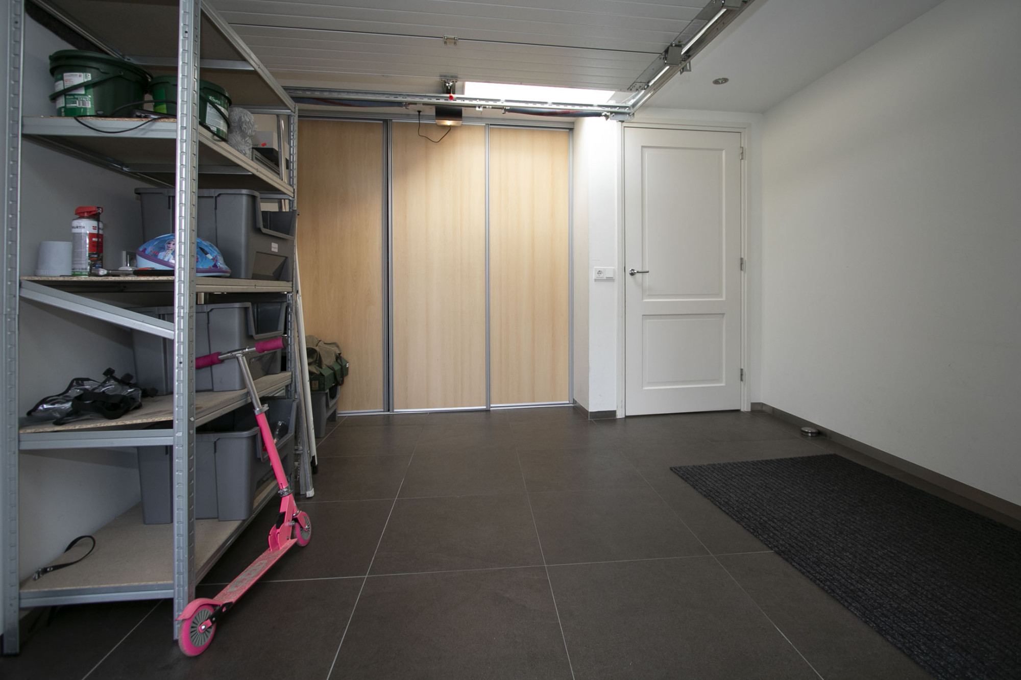 De garage/berging is voorzien van een sectionaalpoort en aparte loopdeur. Een grote schuifwandkast zorgt voor praktische opbergruimte. Aansluitend de carport met twee lichtkoepels waar de auto’s prima droog staan.
