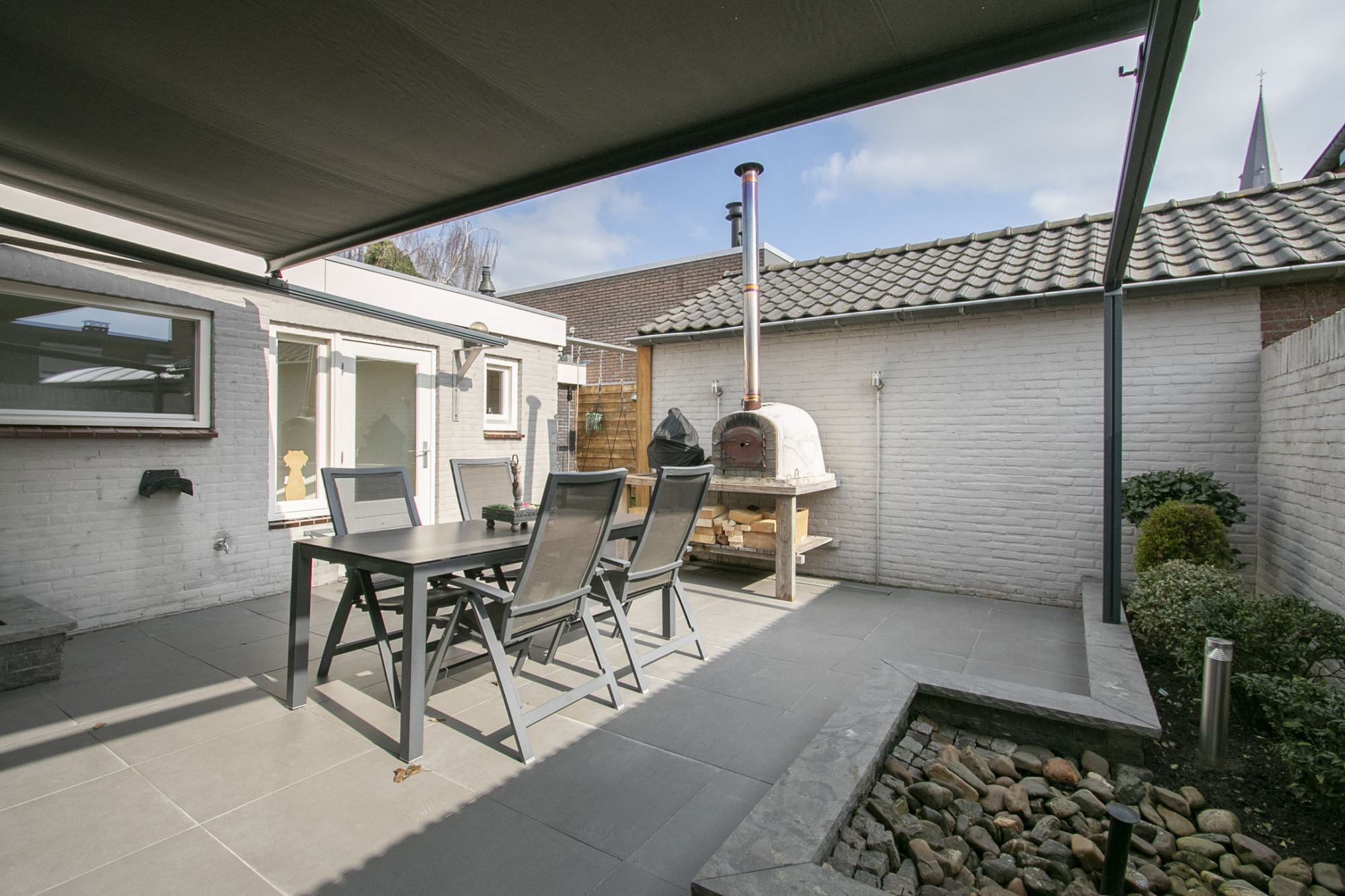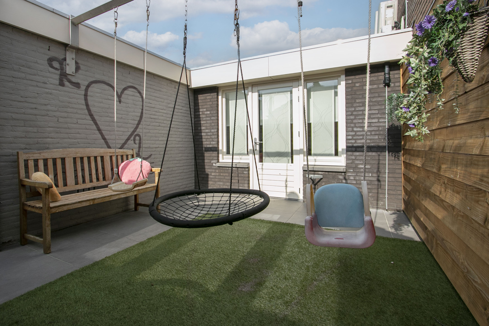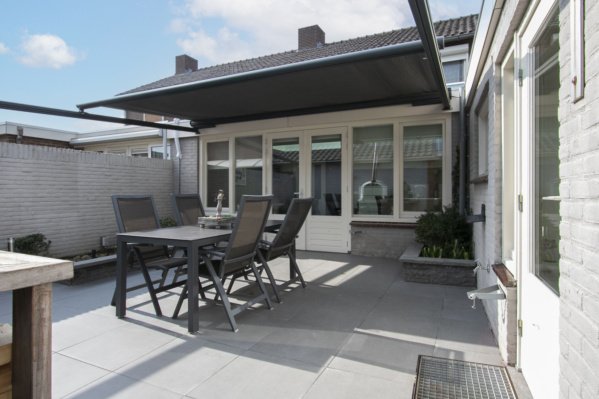 De fraai aangelegde tuin is voorzien van een betegeld terras met gemetselde hardstenen plantenborders. Het terras heeft een elektrisch zonnescherm en bij het achterste tuingedeelte is een strook kunstgras aangelegd. De houten muurdelen maken van dit gedeelte een knus geheel. De tuindeur en ramen van de huidige kantoorruimte kijken uit op dit gedeelte.