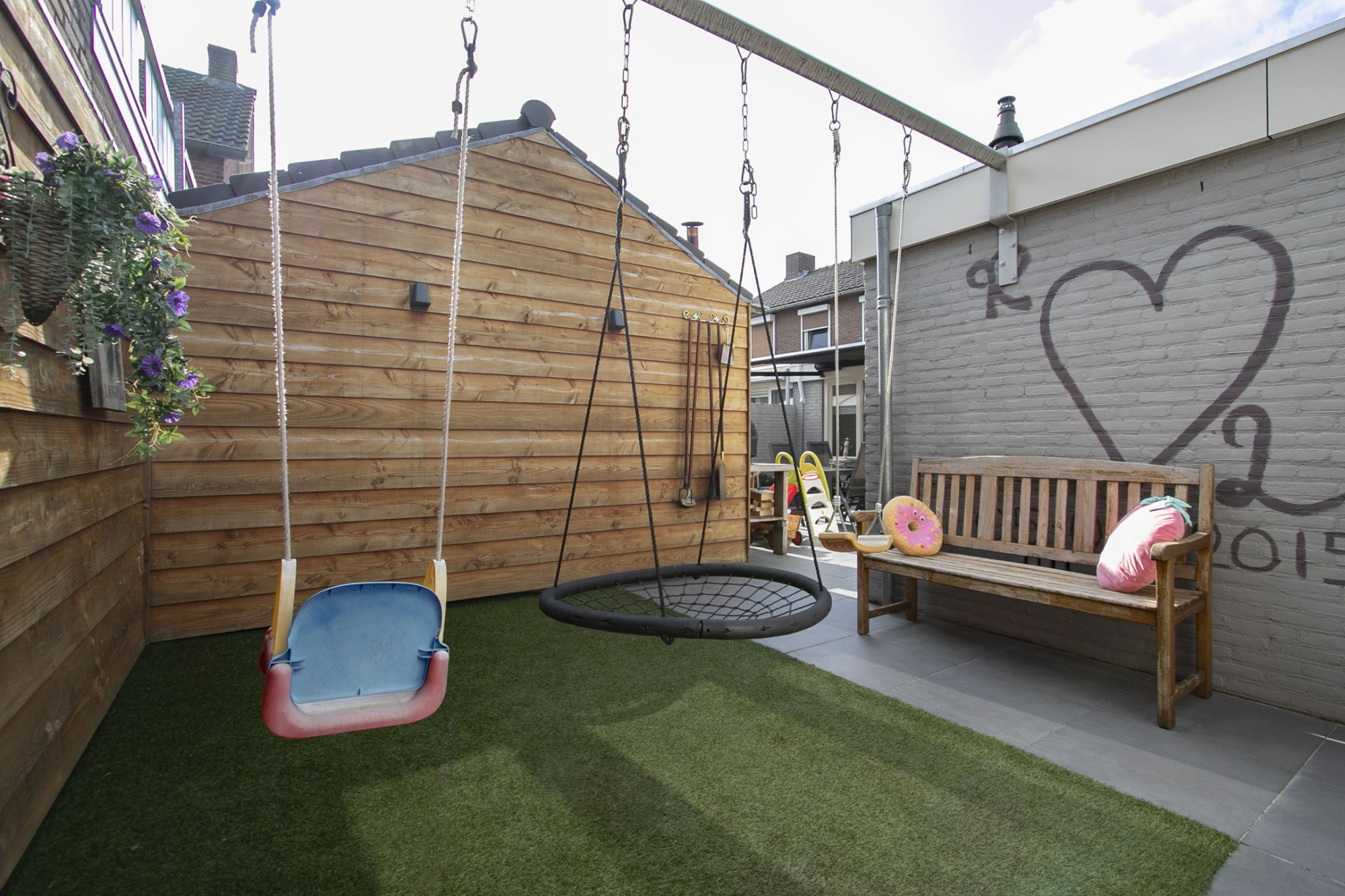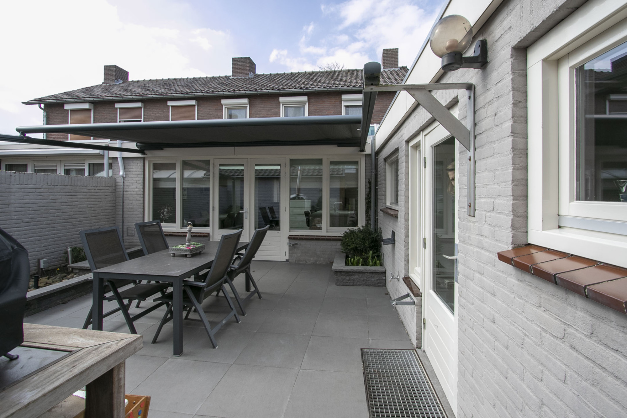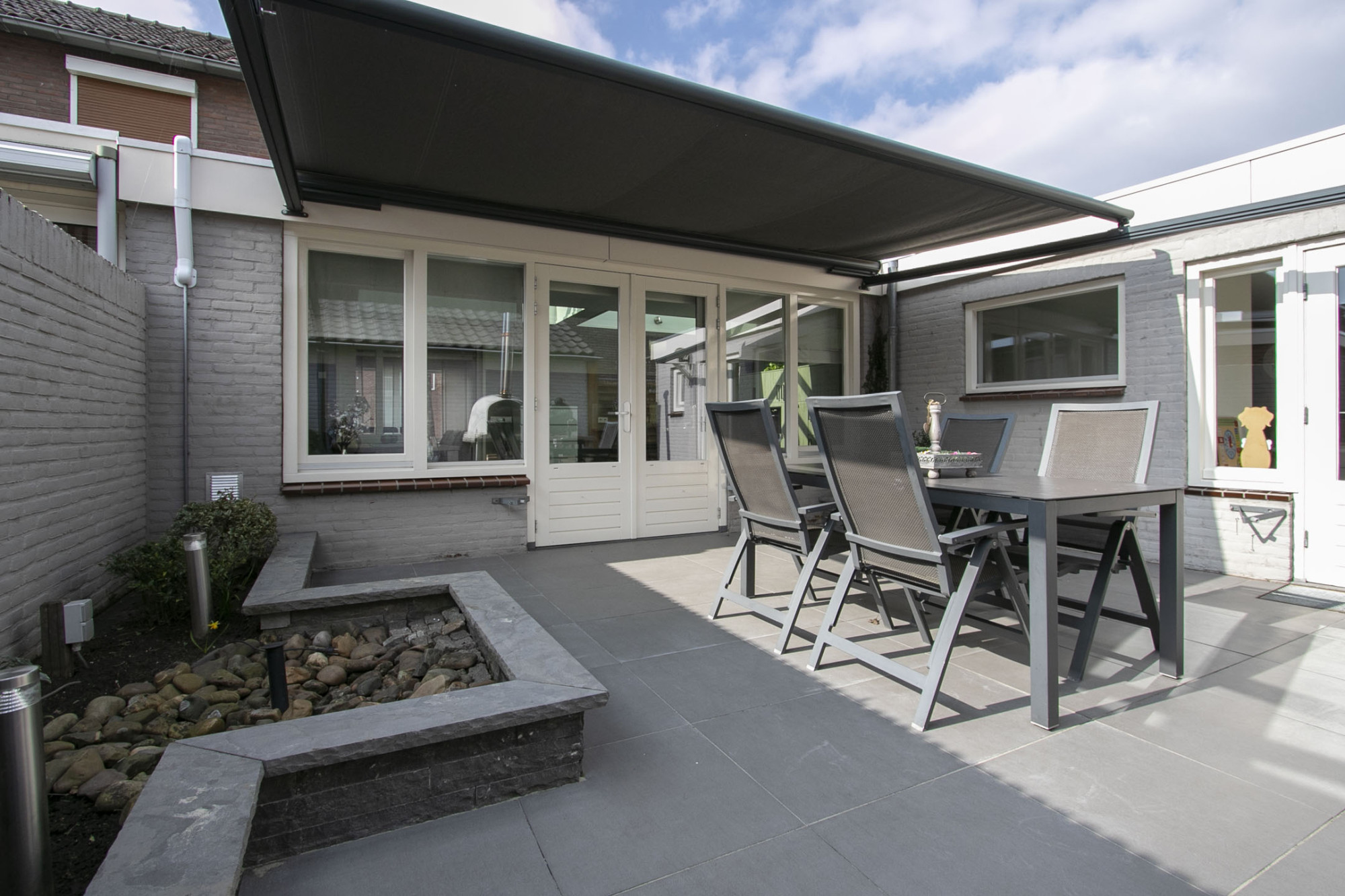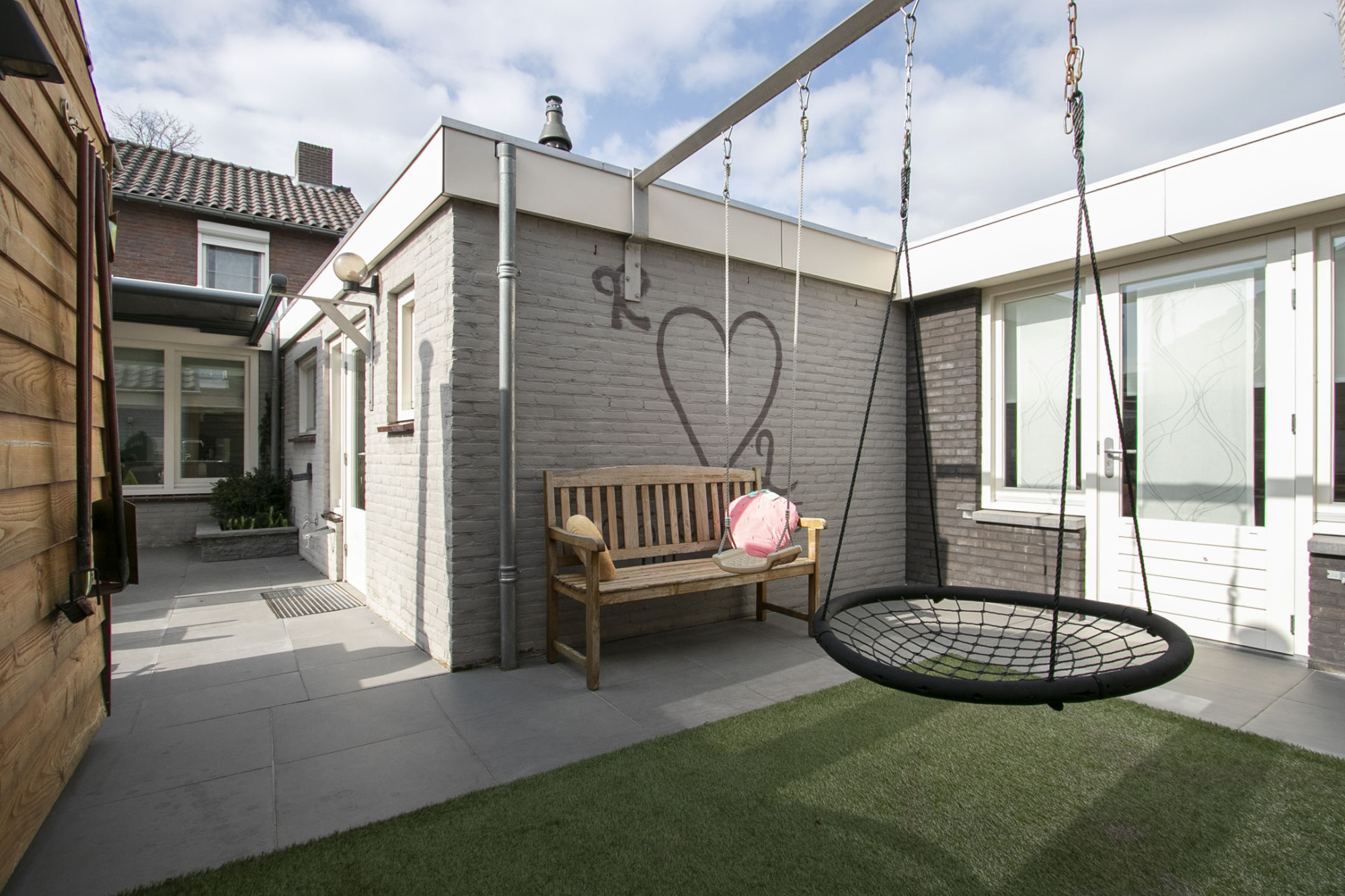 De fraai aangelegde tuin is voorzien van een betegeld terras met gemetselde hardstenen plantenborders. Het terras heeft een elektrisch zonnescherm en bij het achterste tuingedeelte is een strook kunstgras aangelegd. De houten muurdelen maken van dit gedeelte een knus geheel. De tuindeur en ramen van de huidige kantoorruimte kijken uit op dit gedeelte.