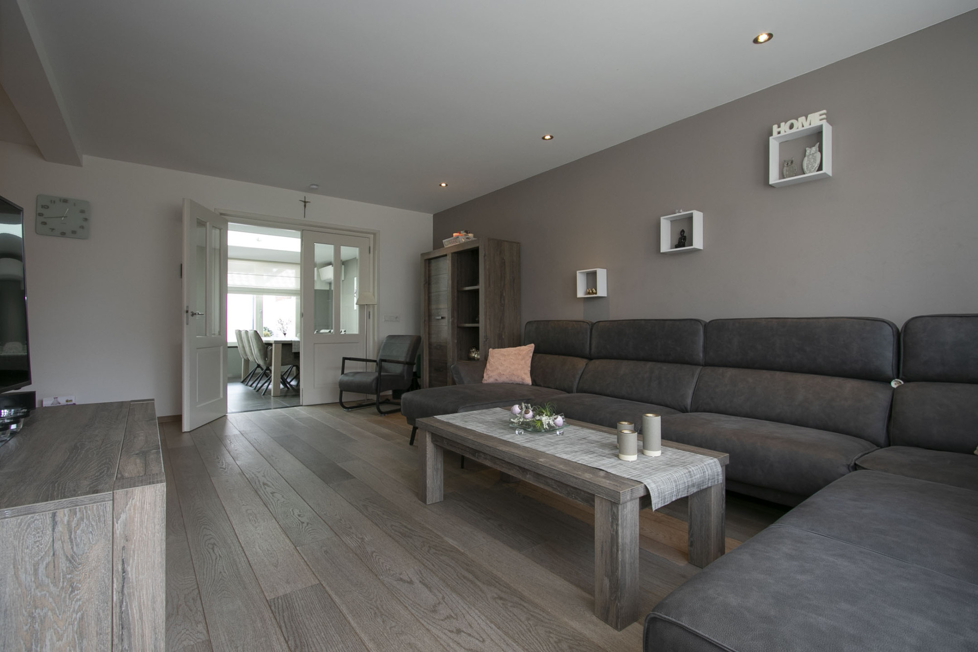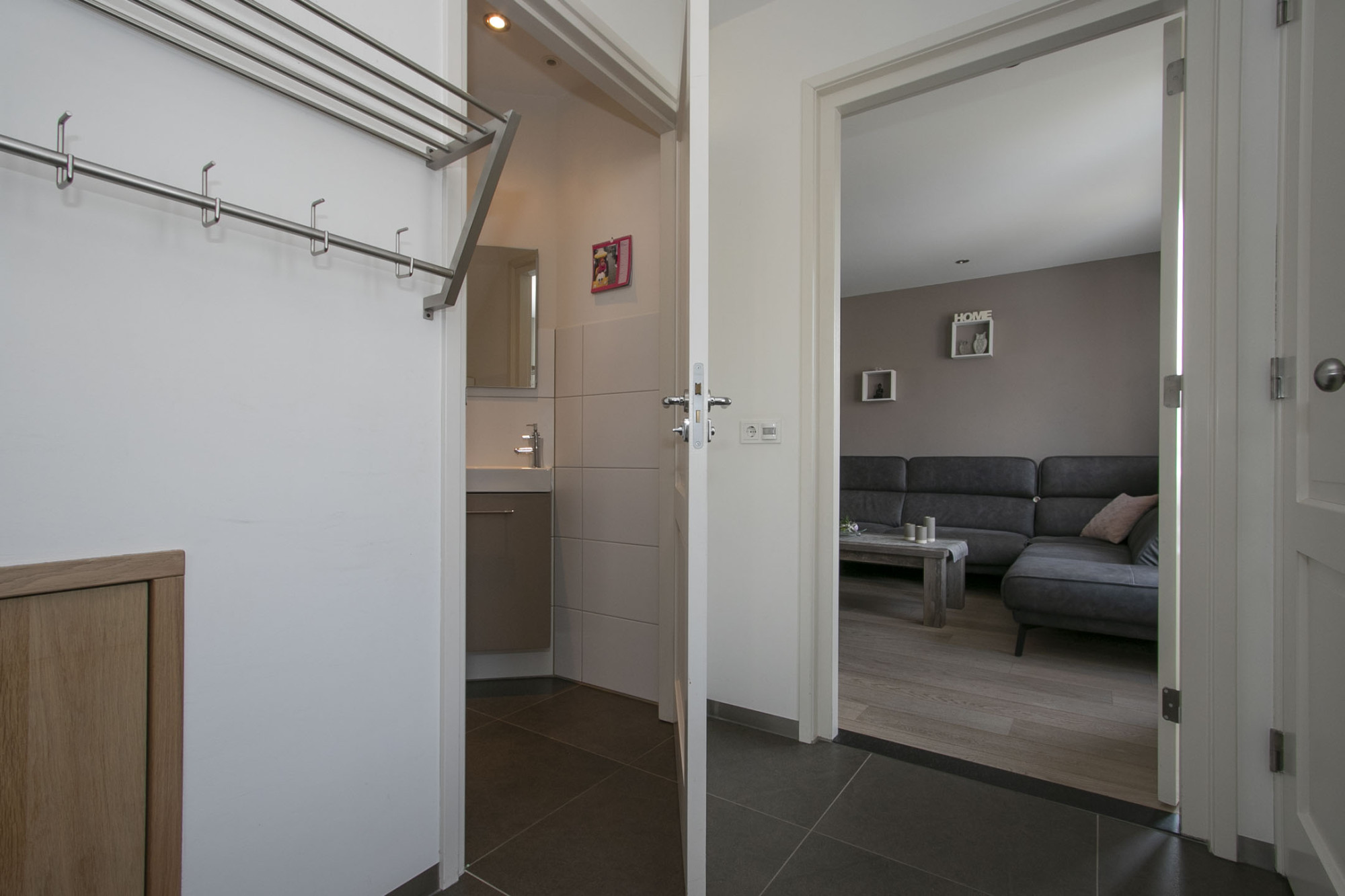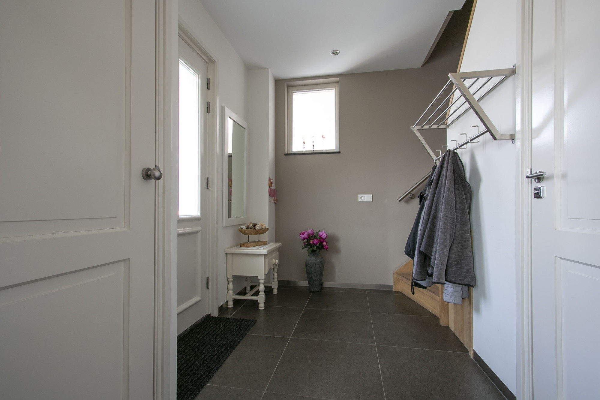 Bij binnenkomst de gemoderniseerde hal met gastentoilet, meterkast en luxe houtentrap naar de eerste verdieping. De hal is afgewerkt met een mooie antracieten tegelvloer en strak gestuukte wanden. Er ligt vloerverwarming op de gehele begane grond. Doorgang naar de woonkamer met houtenvloer en dubbele deuren naar de grote leefkeuken.