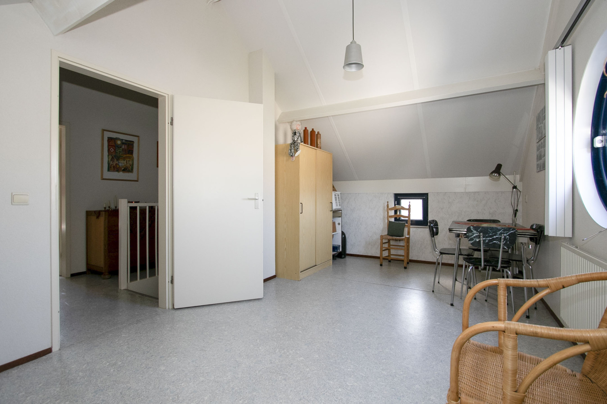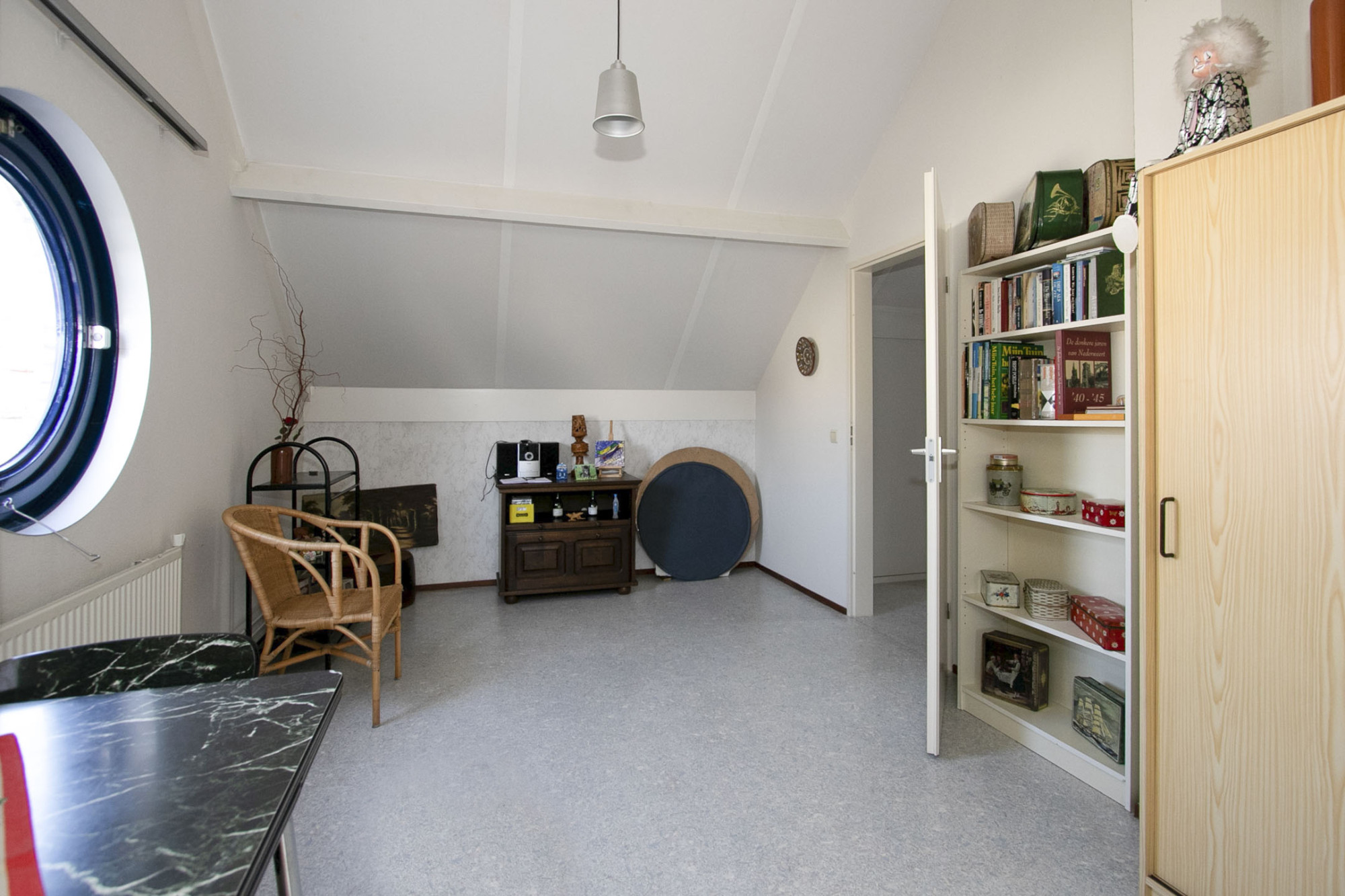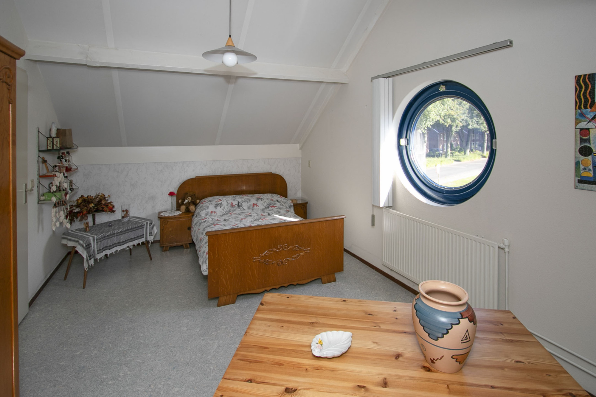 De ruime overloop brengt je naar twee grote slaapkamers die beiden een mooi rond raam hebben. De ramen zijn voorzien van een voorzetraam.