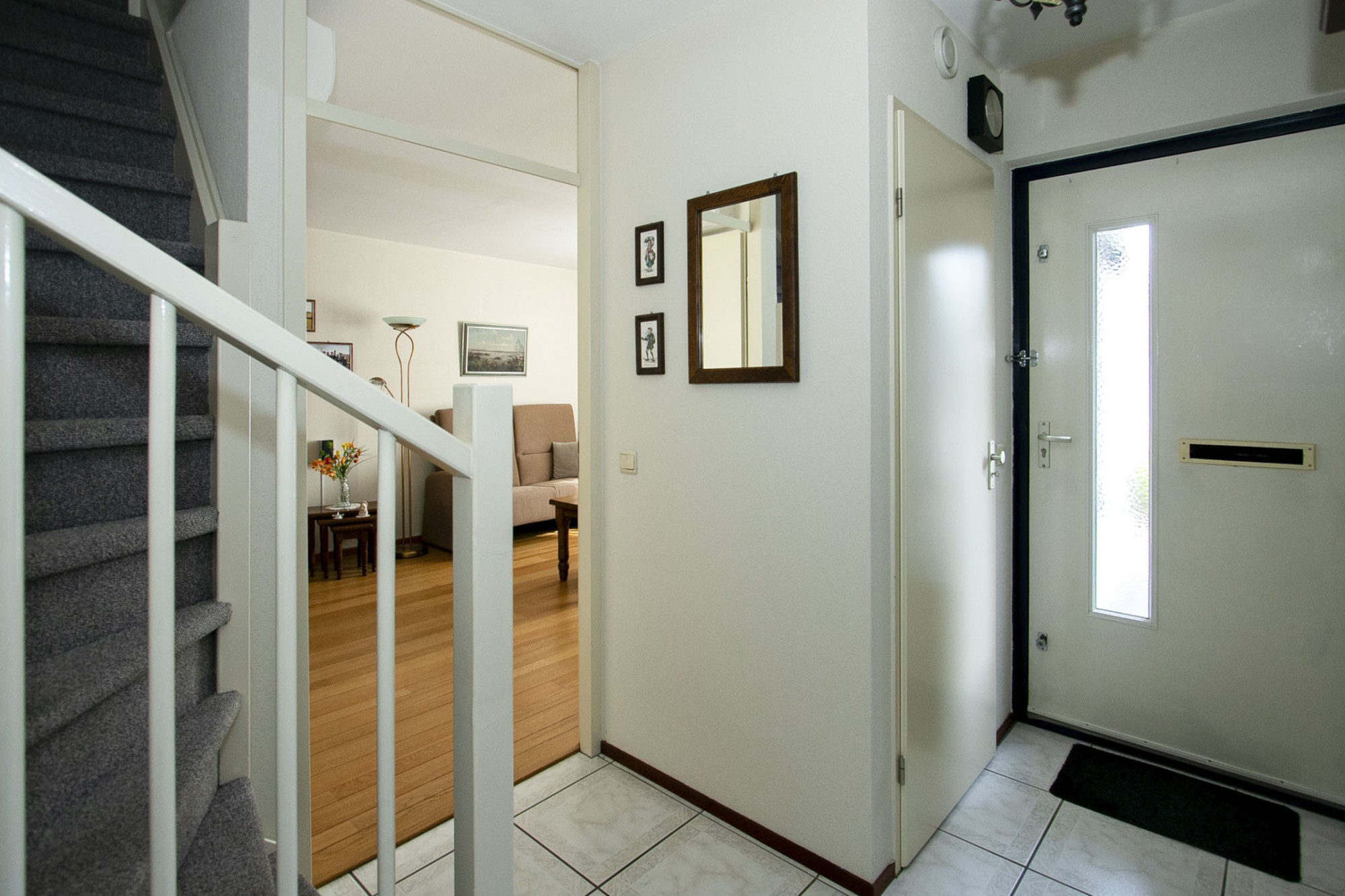 De entree ligt aan de voorzijde van de woning, samen met een mooi aangelegde voortuin en eigen oprit. Via de entree bereik je de ontvangsthal die voorzien is van een meterkast, toiletruimte en de trap naar de eerste verdieping.