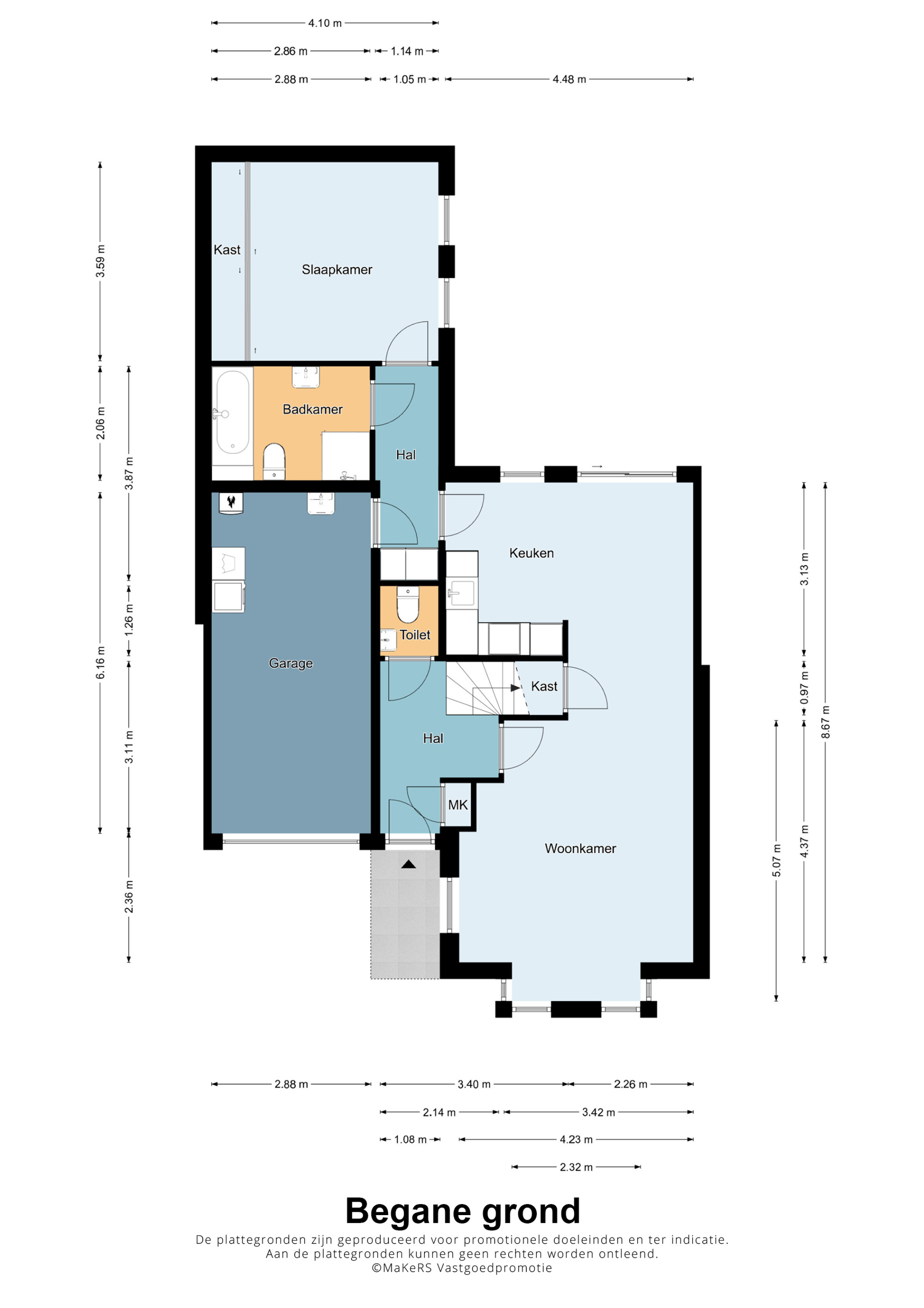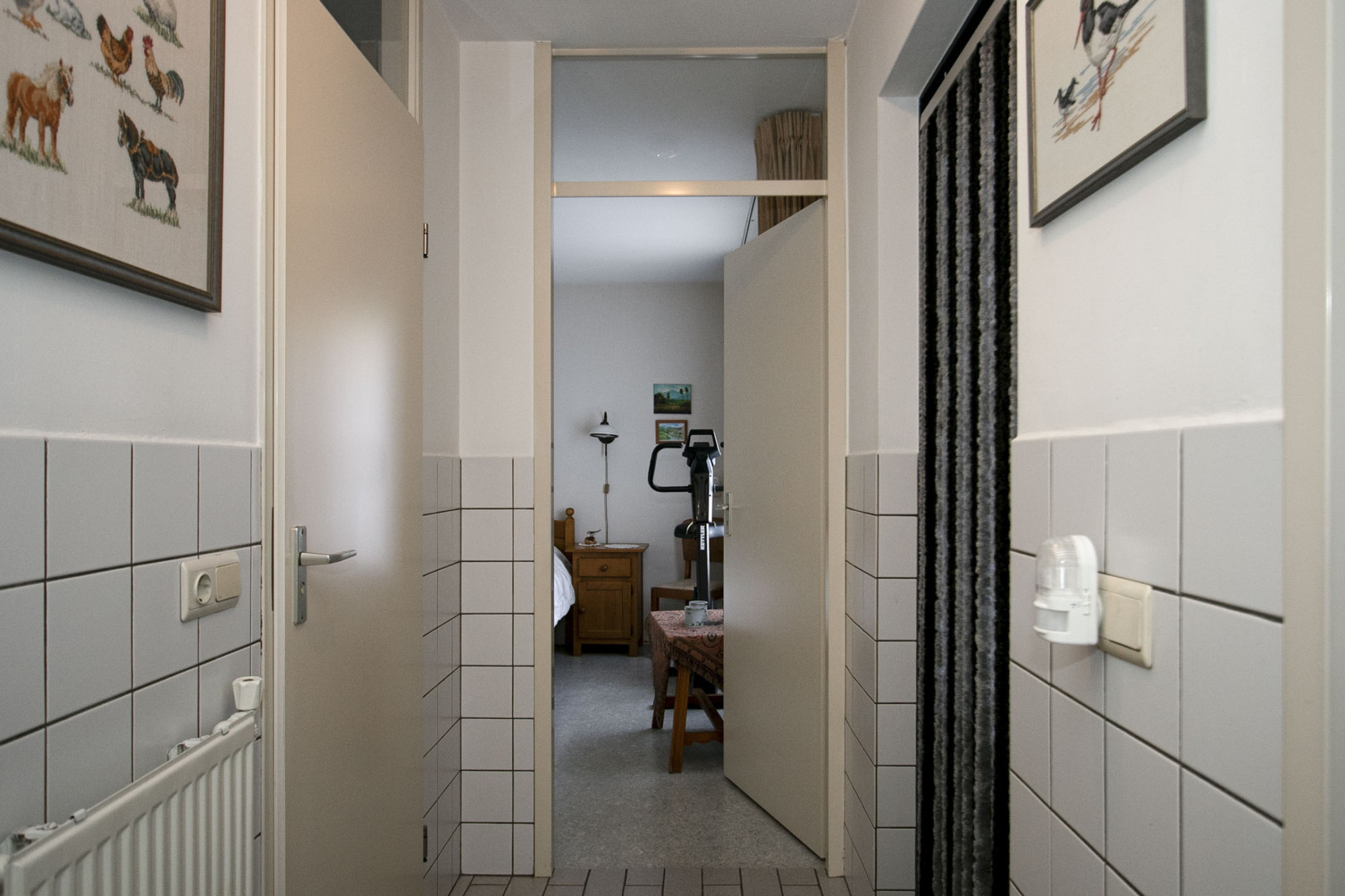 De aangrenzende hal brengt je naar de inpandige garage, slaapkamer en badkamer op de begane grond.