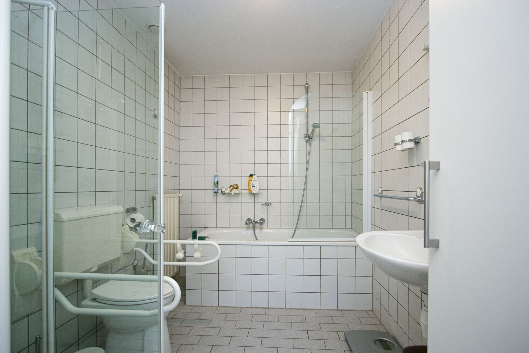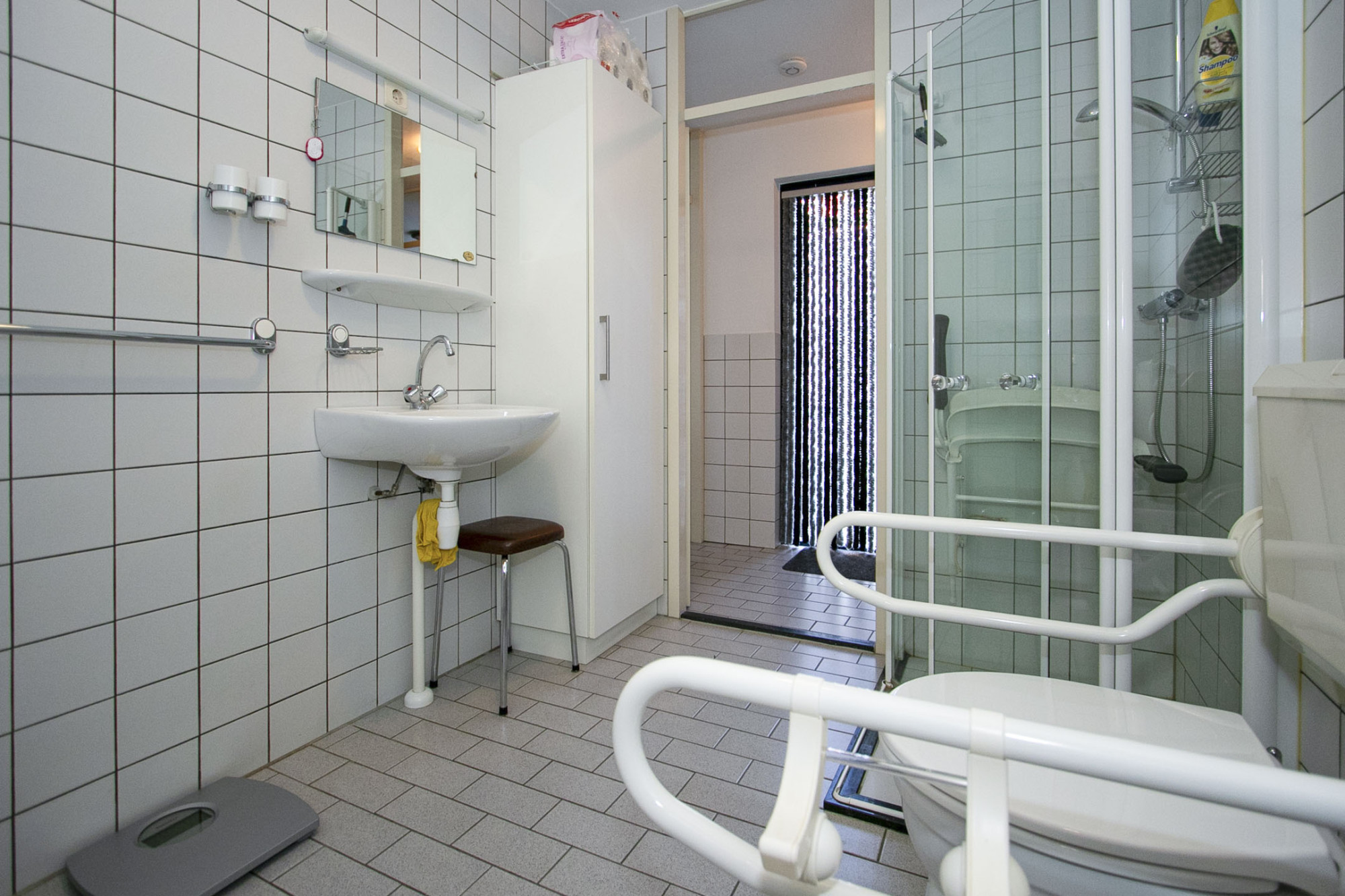 De badkamer is ruim van opzet en van alle gemakken voorzien. Zo zijn er een inloopdouche, een ligbad met een tweede douche, een toilet en een wastafel.