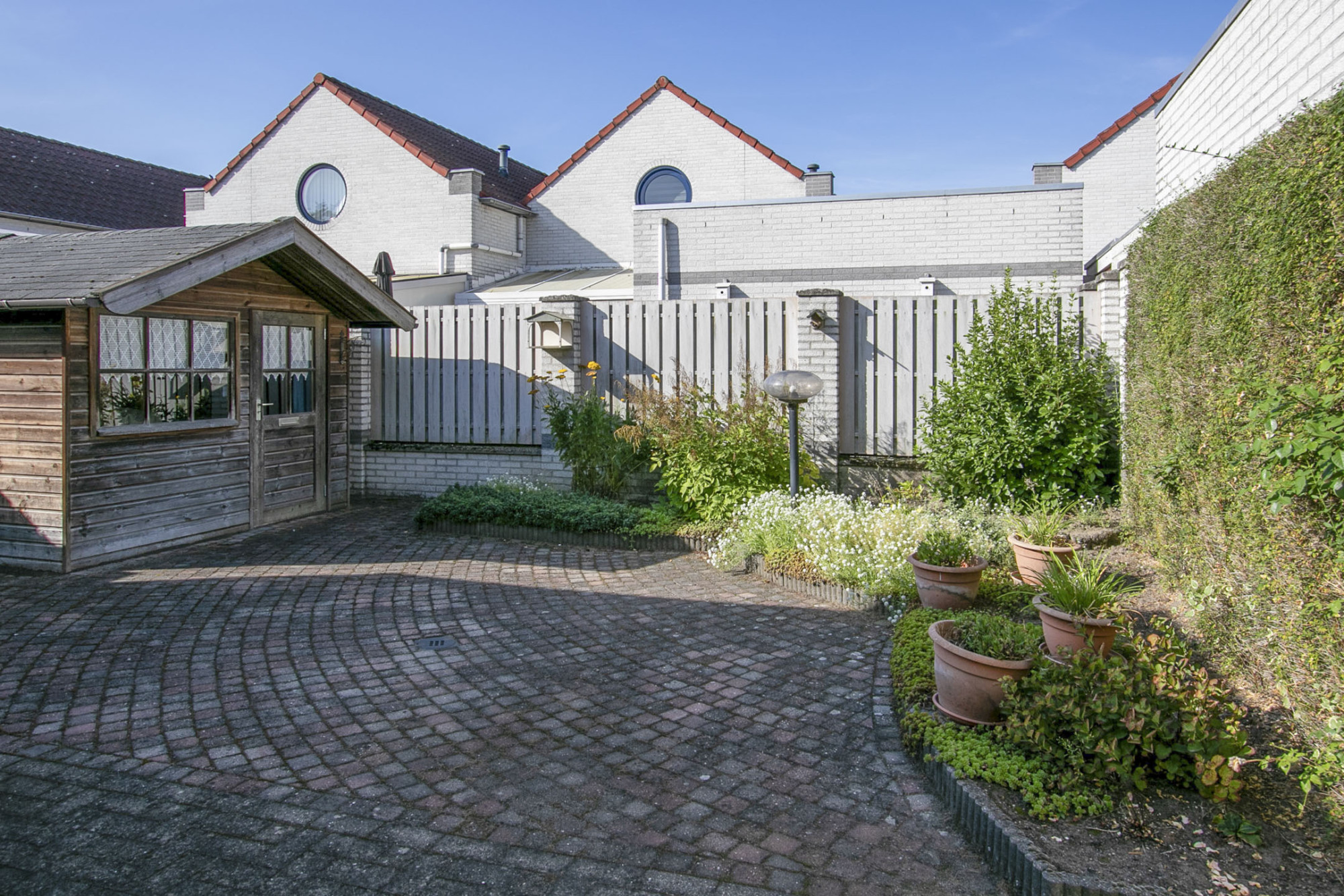 In de tuin staat een praktisch tuinhuis voor het houden van tuingereedschap en spullen.