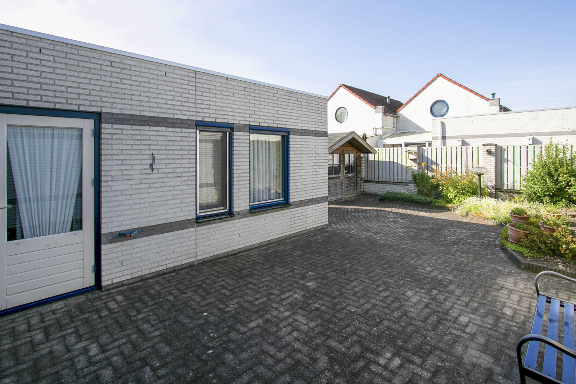 De buitenruimte bij deze woning bestaat uit een mooie voortuin met beplanting en een onderhoudsvrije patiotuin op het zuidwesten. Aan de achtergevel zit een elektrisch bedienbaar zonnescherm.