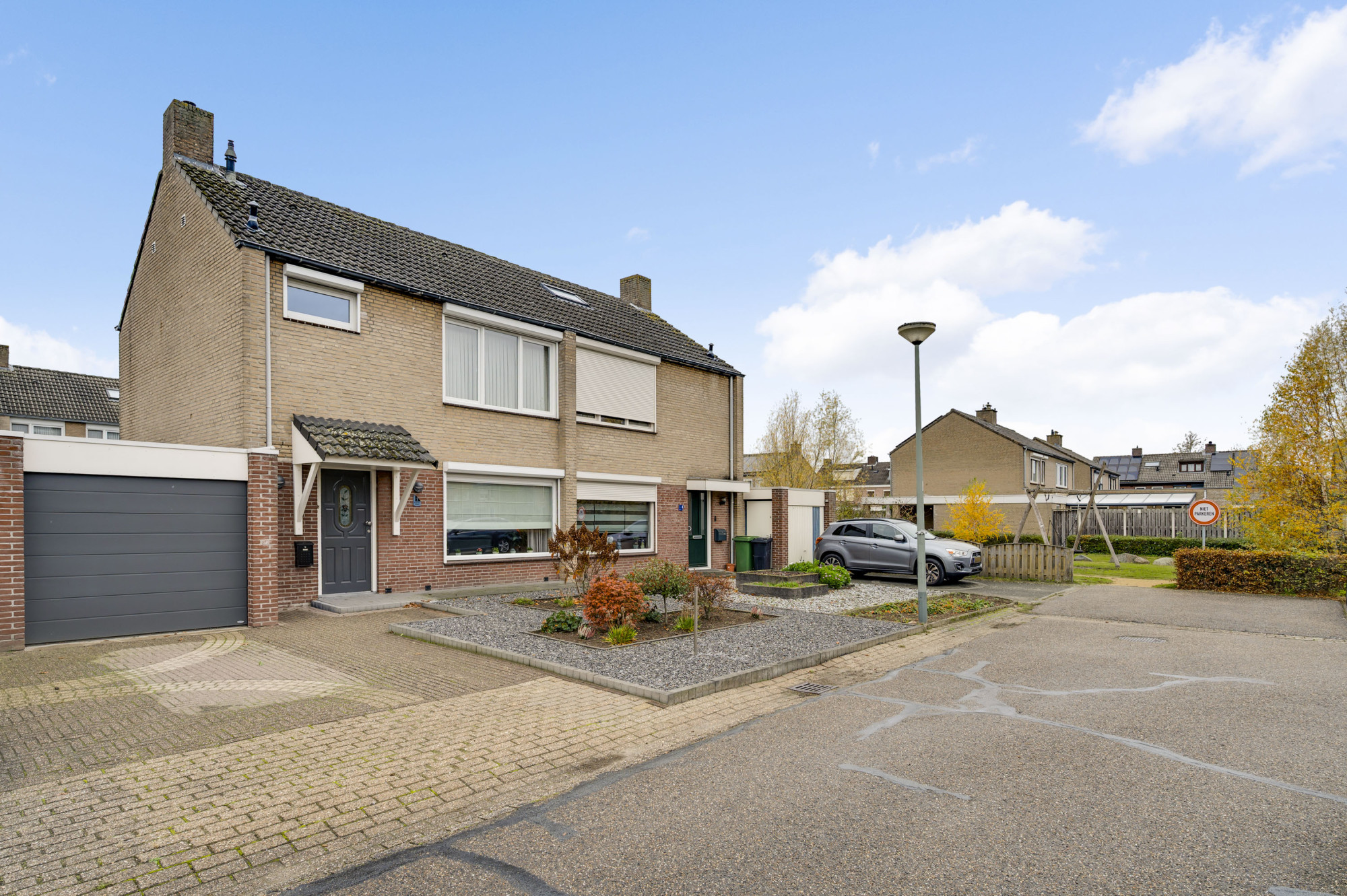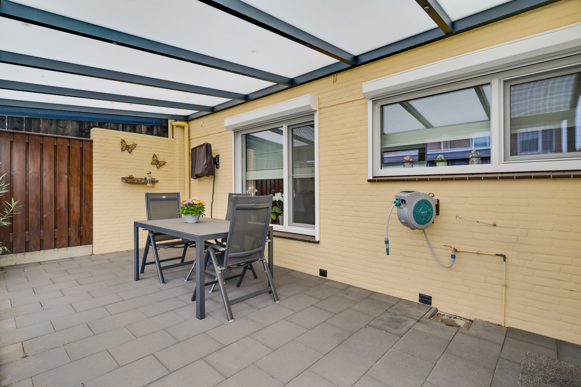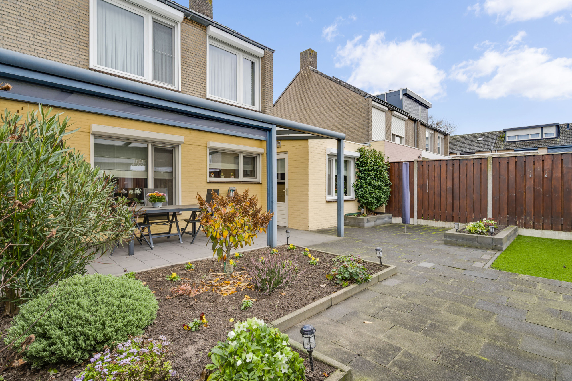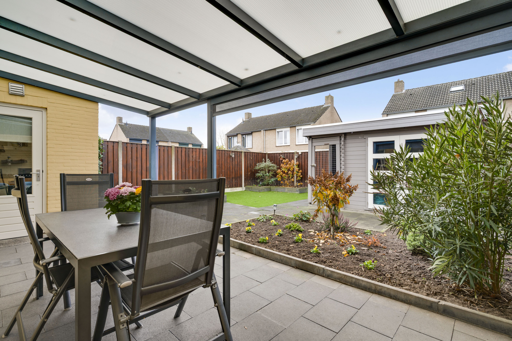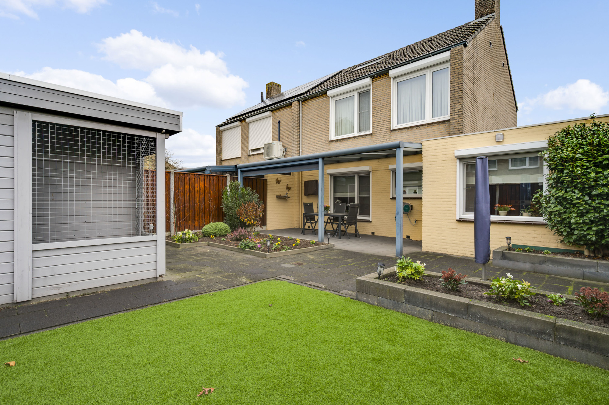 De voortuin is onderhoudsvriendelijk aangelegd en de oprit biedt toegang tot de inpandige garage. De achtertuin is een echte meerwaarde van deze woning: zonnig, verzorgd en gunstig gelegen op het zuidwesten. Dankzij de mooie overkapping met zonnescherm, het kunstgazon en de houten berging is dit een plek waar u het hele jaar door kunt genieten — ideaal voor lange zomeravonden of gezellige momenten met vrienden en familie.