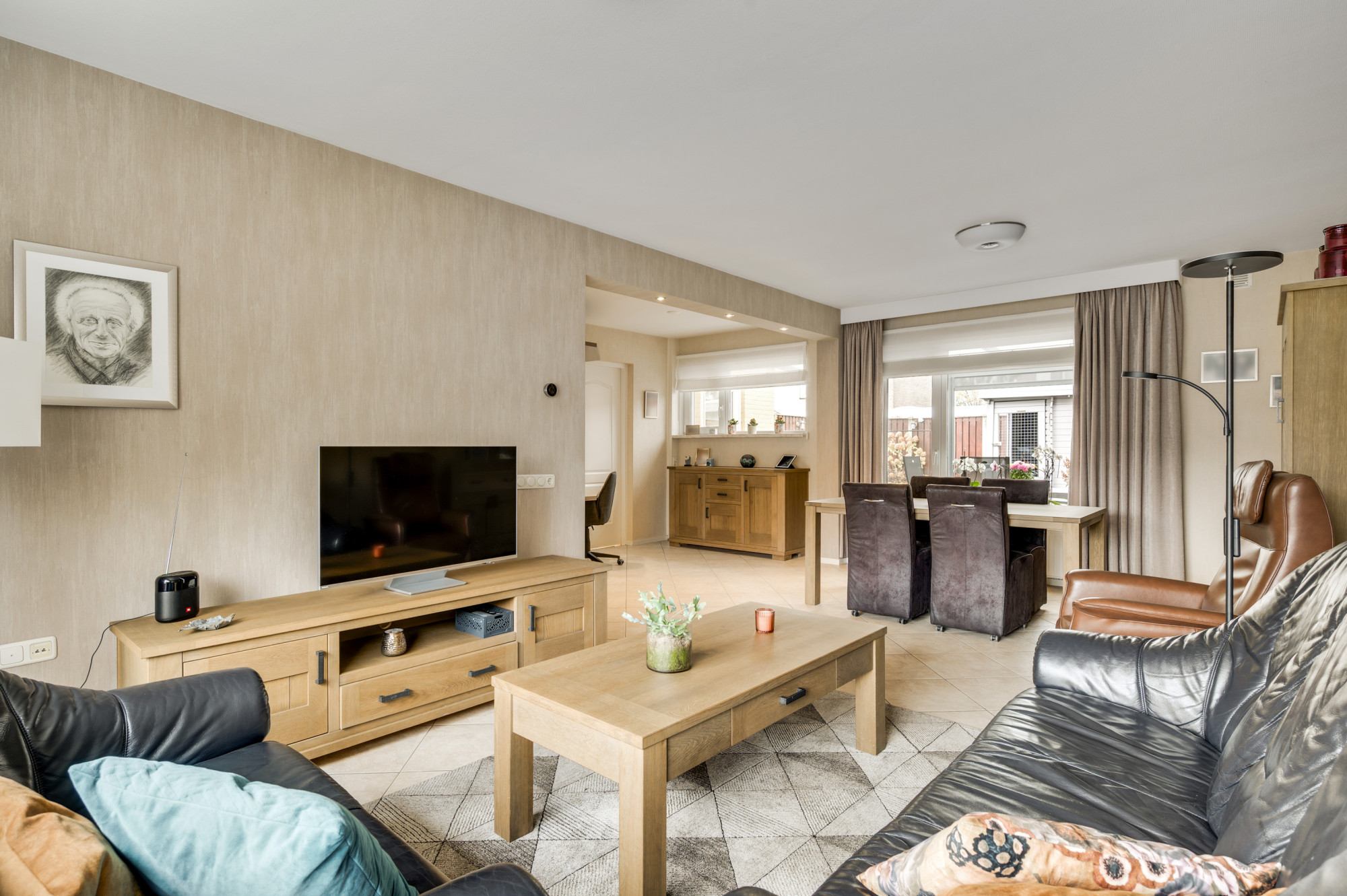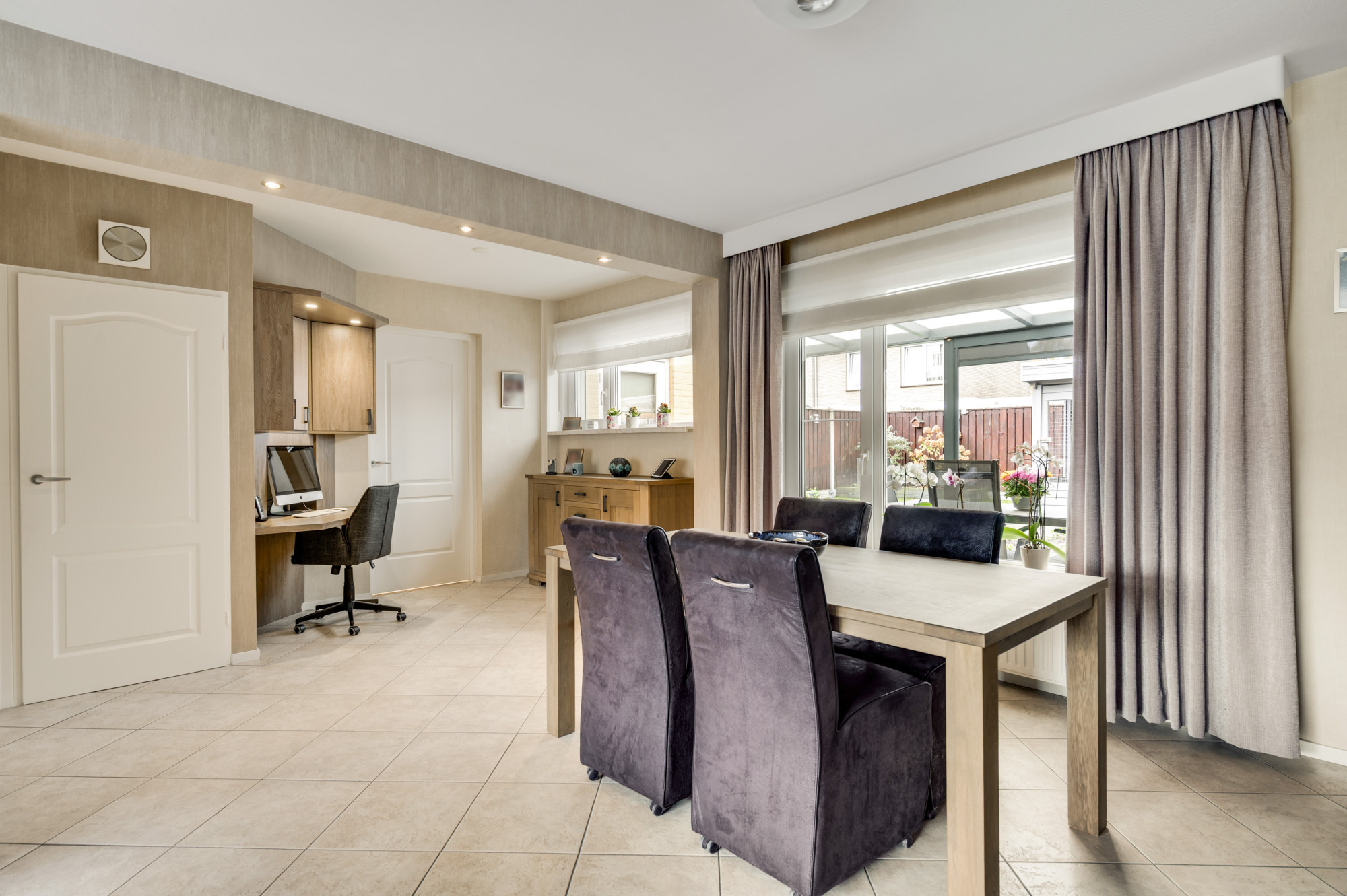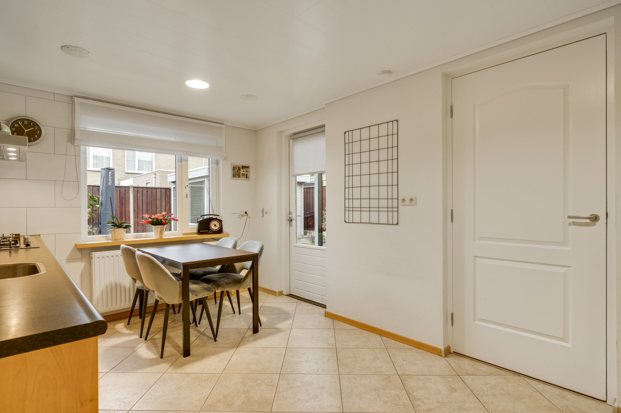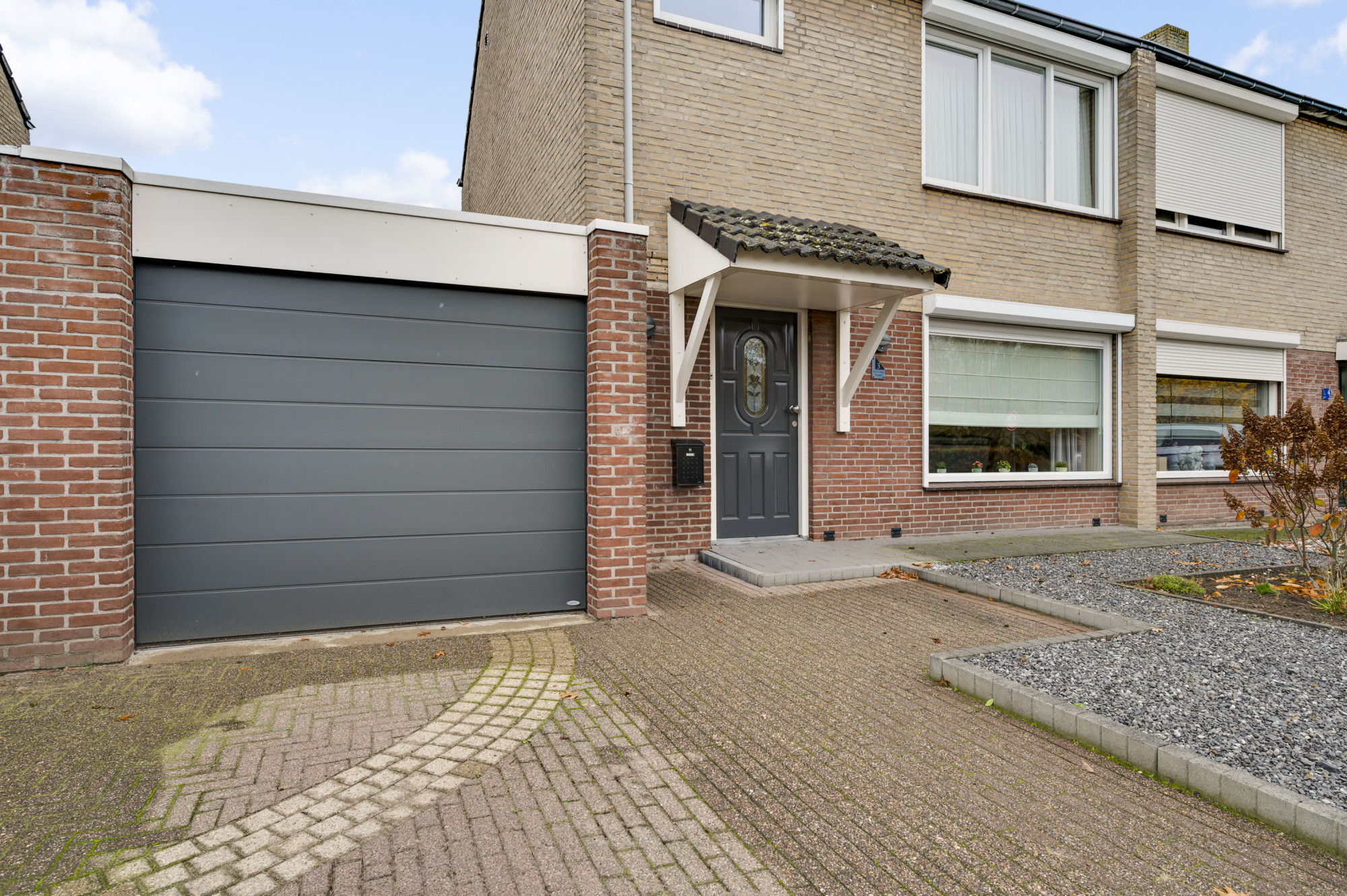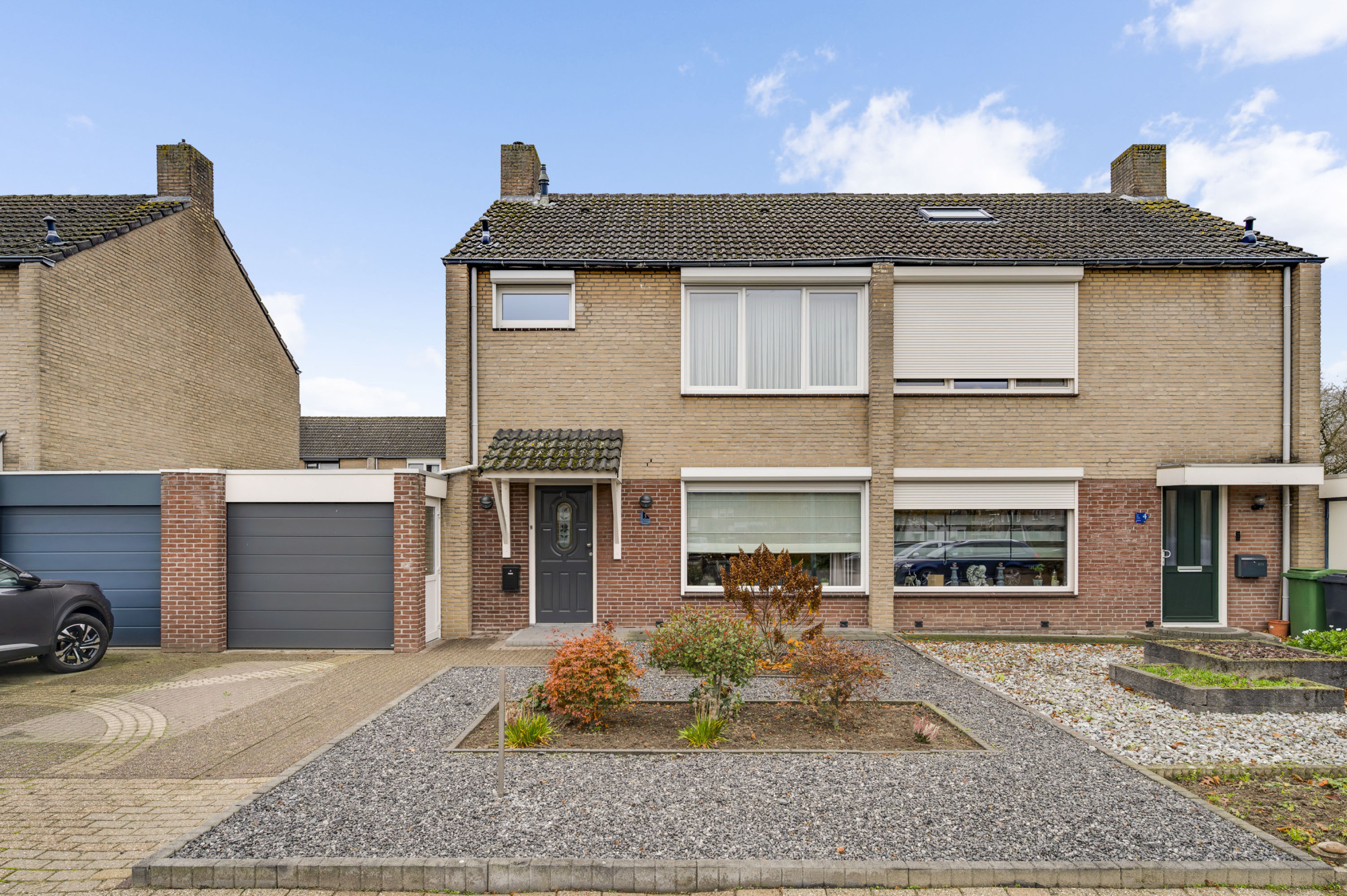 De voortuin is onderhoudsvriendelijk aangelegd en de oprit biedt toegang tot de inpandige garage. De achtertuin is een echte meerwaarde van deze woning: zonnig, verzorgd en gunstig gelegen op het zuidwesten. Dankzij de mooie overkapping met zonnescherm, het kunstgazon en de houten berging is dit een plek waar u het hele jaar door kunt genieten — ideaal voor lange zomeravonden of gezellige momenten met vrienden en familie.