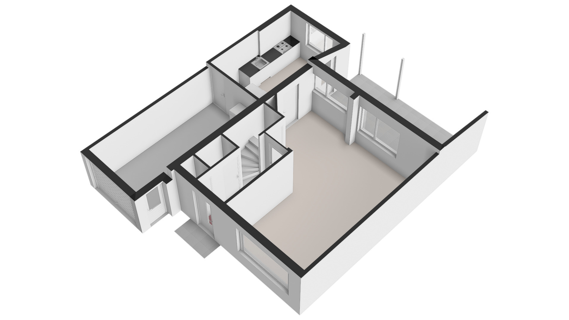 Via de voordeur bereikt u de hal met meterkast, toiletruimte met fonteintje en de trapopgang naar de eerste verdieping. De lichte L-vormige woonkamer is ruim opgezet en biedt een prettig uitzicht op de voorgelegen groenvoorziening. Een praktische trapkast zorgt voor extra opbergruimte. Aangrenzend bevindt zich de aanbouw waar de riante leefkeuken is gerealiseerd. De keuken is opgesteld in twee delen en voorzien van hoogwaardige inbouwapparatuur: een 5-pits gasfornuis, afzuigkap, koelkast, combi-oven, magnetron en een vaatwasser. Vanuit de keuken bereikt u zowel de inpandige garage als de achtertuin. De garage is uitgerust met een elektrische kantelpoort, loopdeur naar de oprit, water, elektra, verwarming en de aansluitingen voor witgoed. Een ideale ruimte voor hobby’s, opslag of het stallen van de auto. De begane grond is voorzien van een tegelvloer.