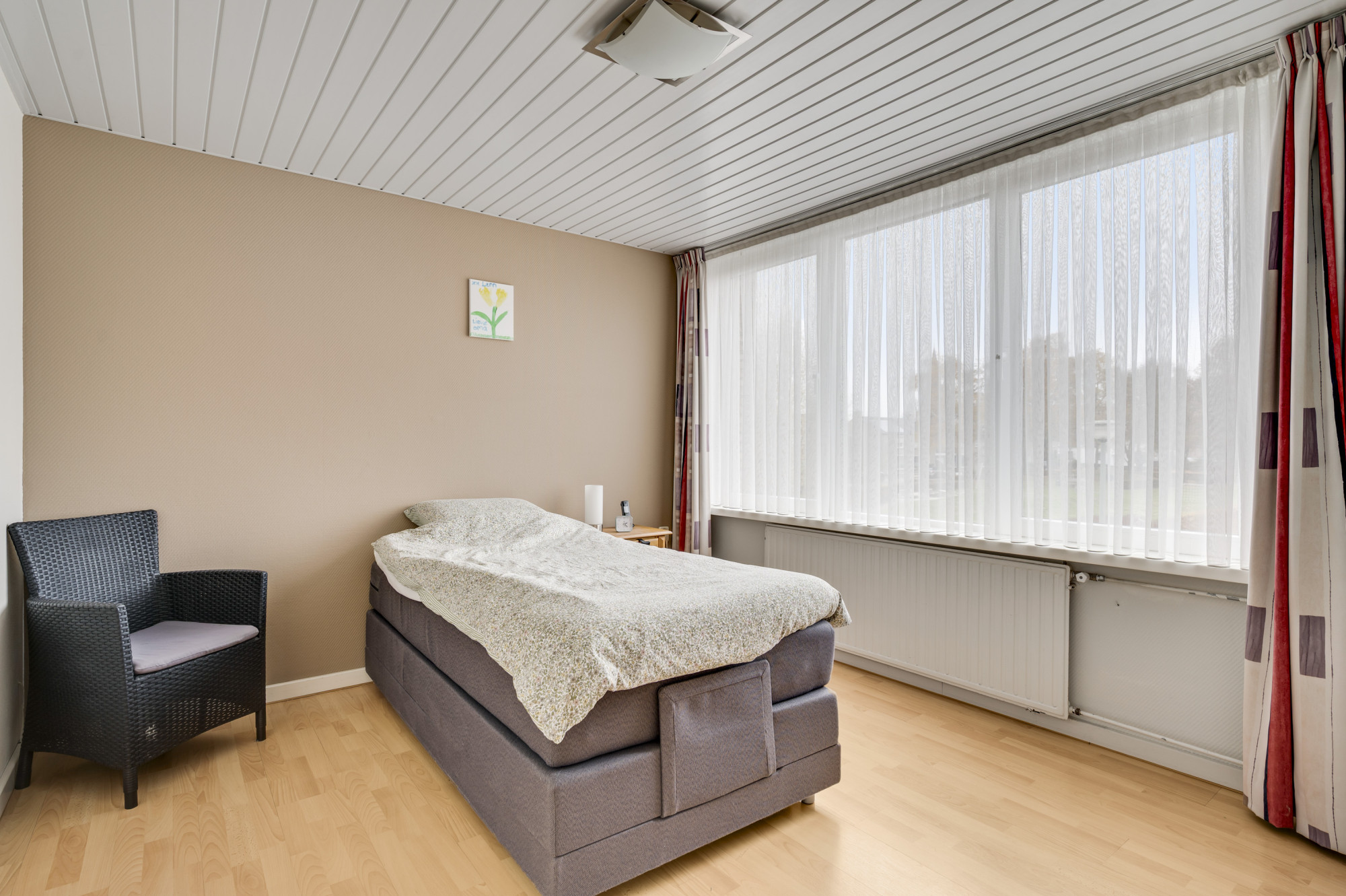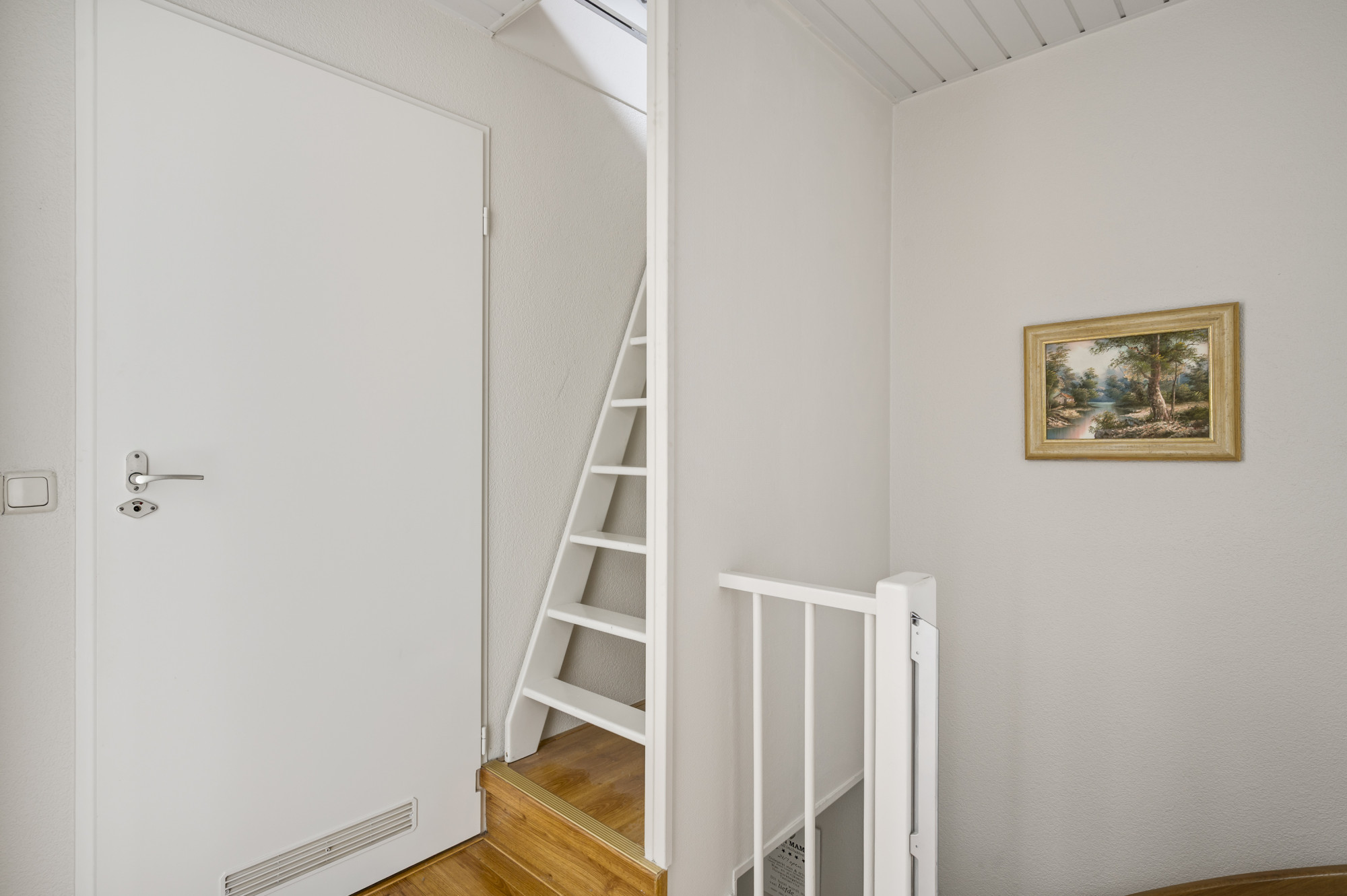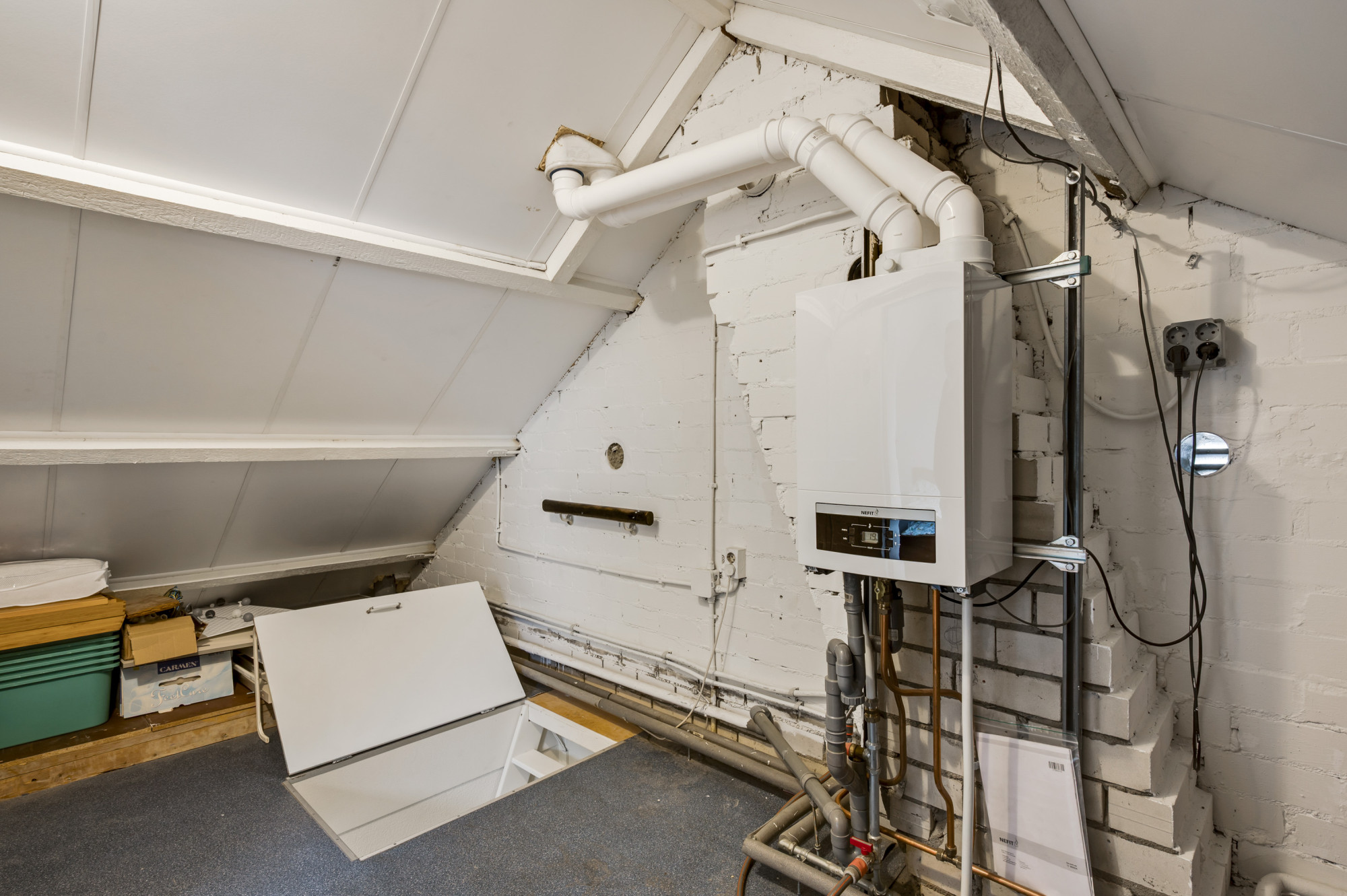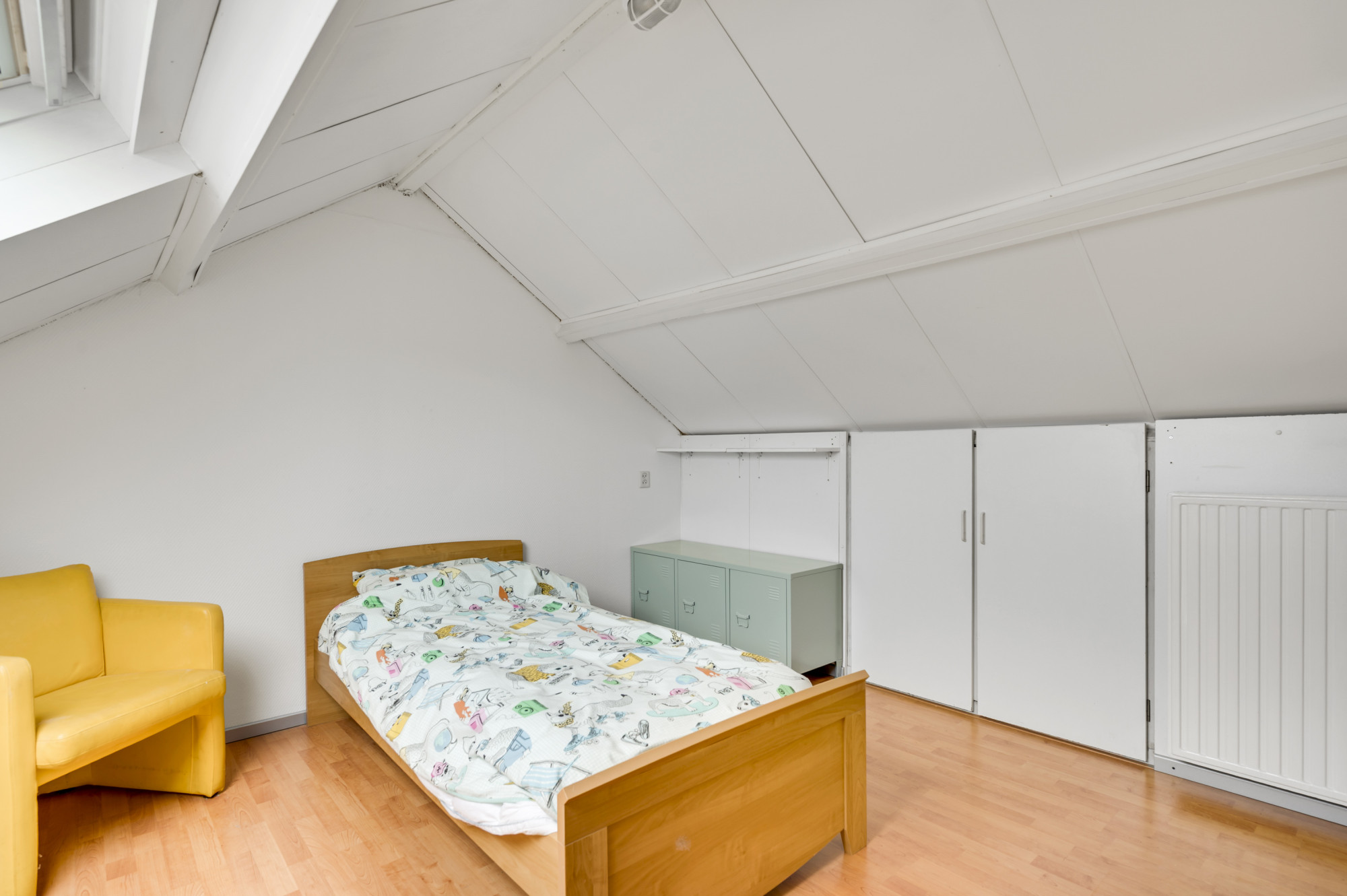 Via een vaste steektrap bereikt u de tweede verdieping. Hier bevindt zich een voorportaal met de opstelling van de cv-ketel (Nefit Proline HR, eigendom, ca. 2020) en toegang tot de vierde slaapkamer. Deze kamer is voorzien van een dakraam en extra bergruimte. Een perfect inzetbare verdieping voor een extra slaapkamer, werk- of hobbyruimte.