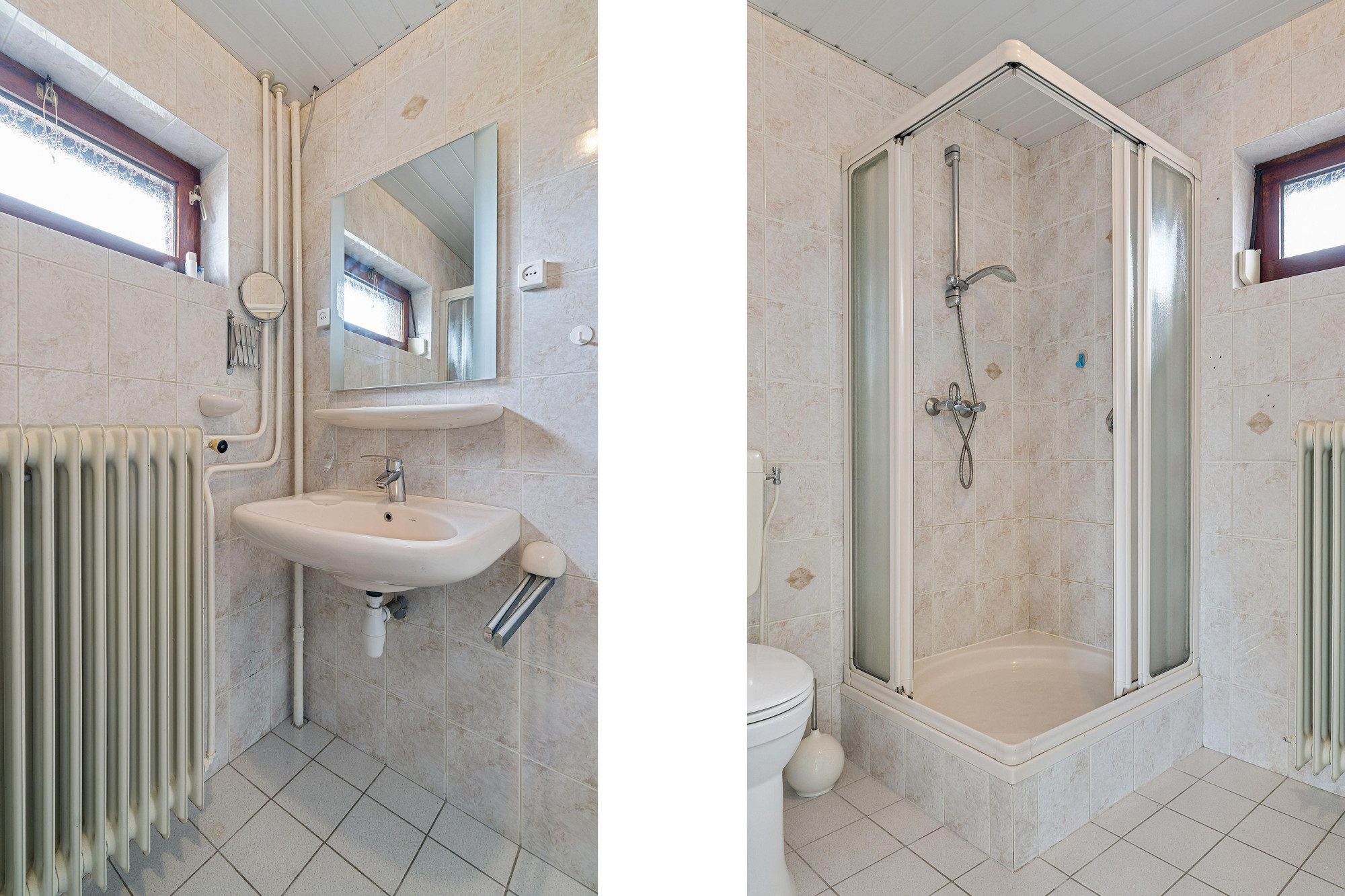 Volledig betegelde badkamer(2.5mx1.85m) met douche, vaste wastafel en 2e toilet.