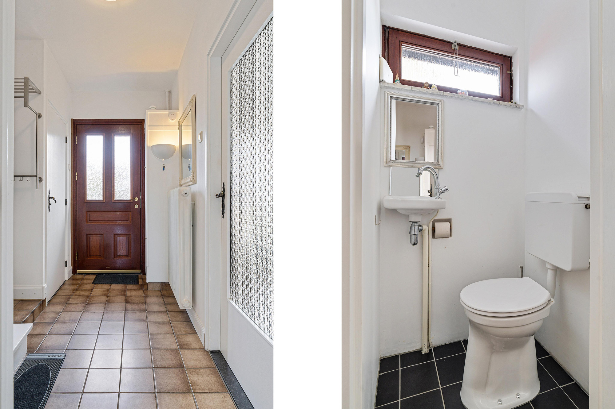 Entree met tegelvloer, meterkast en volledig betegeld modern toilet met fonteintje.