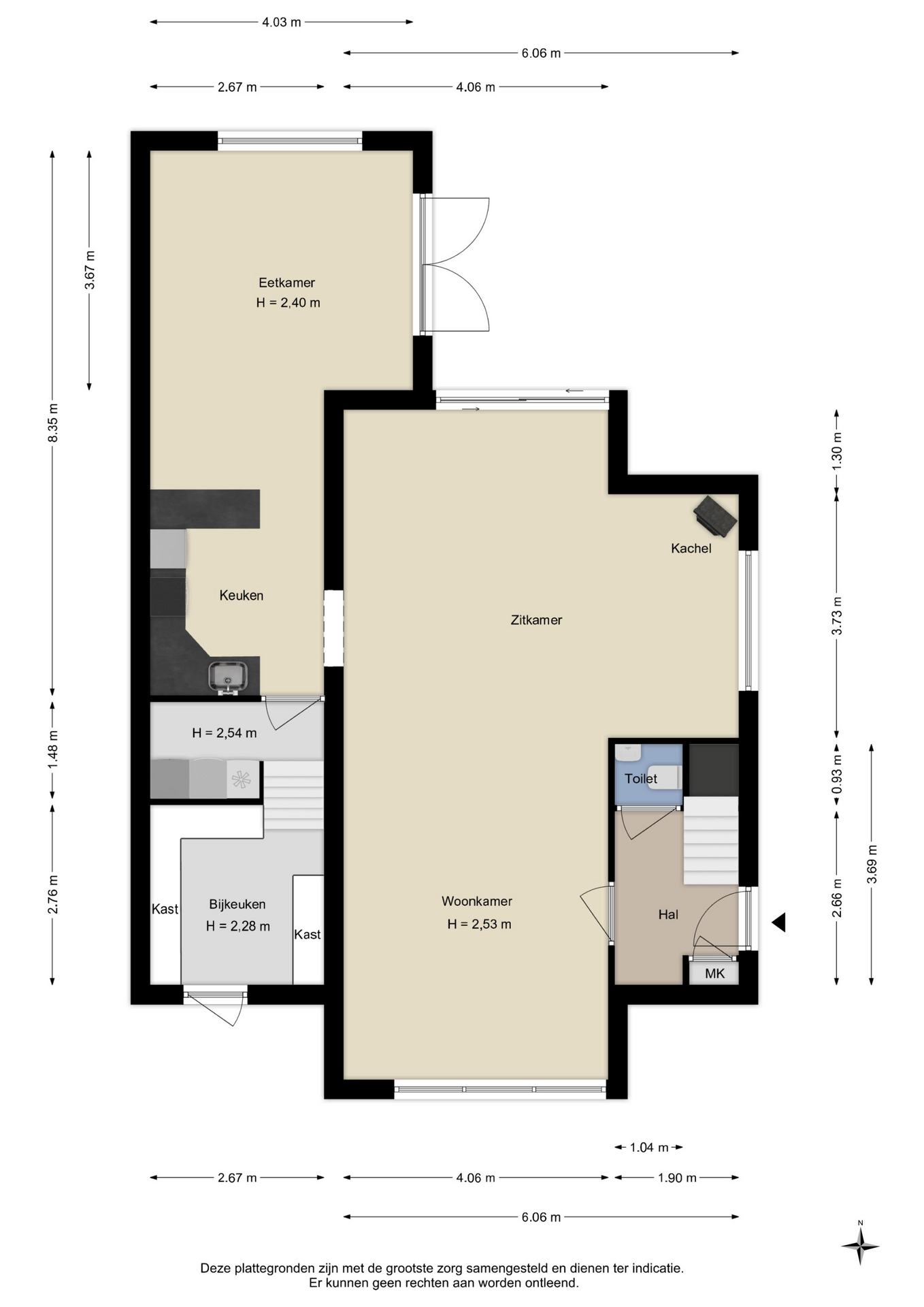 Alle door ons kantoor verstrekte informatie omtrent onroerende zaken, moet beschouwd worden als een uitnodiging om in onderhandeling te treden, en is geheel vrijblijvend! Alle vermelde maten en afmetingen zijn slechts bij benadering. Aan deze beperkte informatie kunnen geen rechten worden ontleend. Indien in enige documentatie of op enige website informatie staat die niet overeen komt met de werkelijkheid, dan geldt de feitelijke situatie waarin de woning zich bevindt, zoals koper deze tijdens de bezichtiging heeft kunnen waarnemen, en wordt de woning in deze feitelijke situatie/staat verkocht. Een (eventueel) bijgevoegde plattegrond dient uitsluitend als globale indicatie/visualisatie. Hieraan kunnen uitdrukkelijk geen rechten worden ontleend.