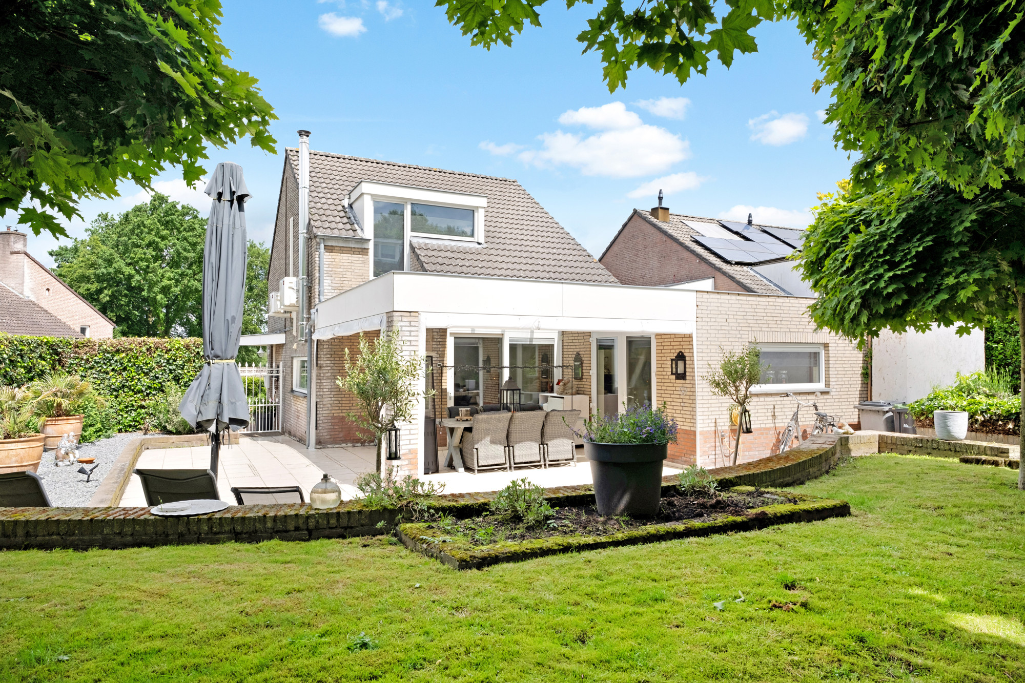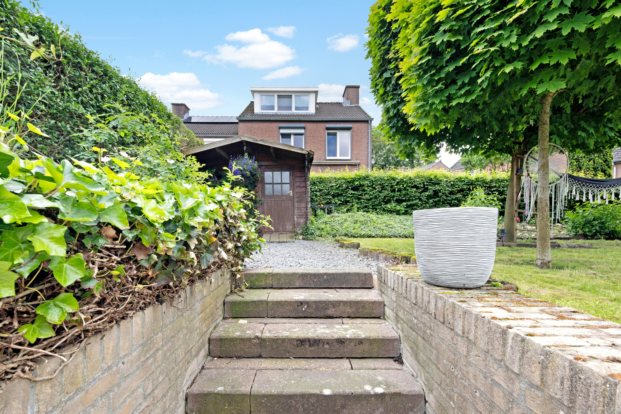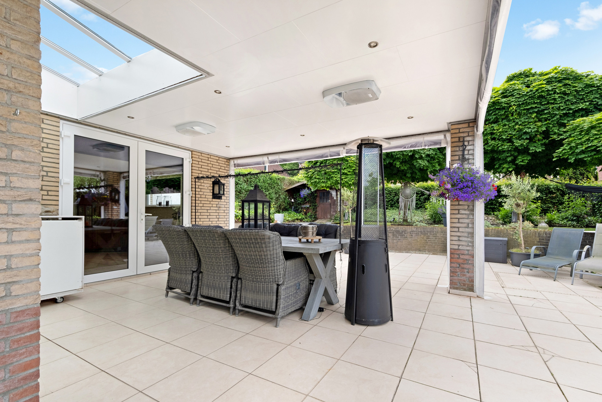 De mooi aangelegde tuin biedt bijzonder veel privacy door de natuurlijke begroeiing. Zowel in de zomer als winter kunt u genieten van de royale overkapping met lichtstraat. Ook is er een houten berging aanwezig.