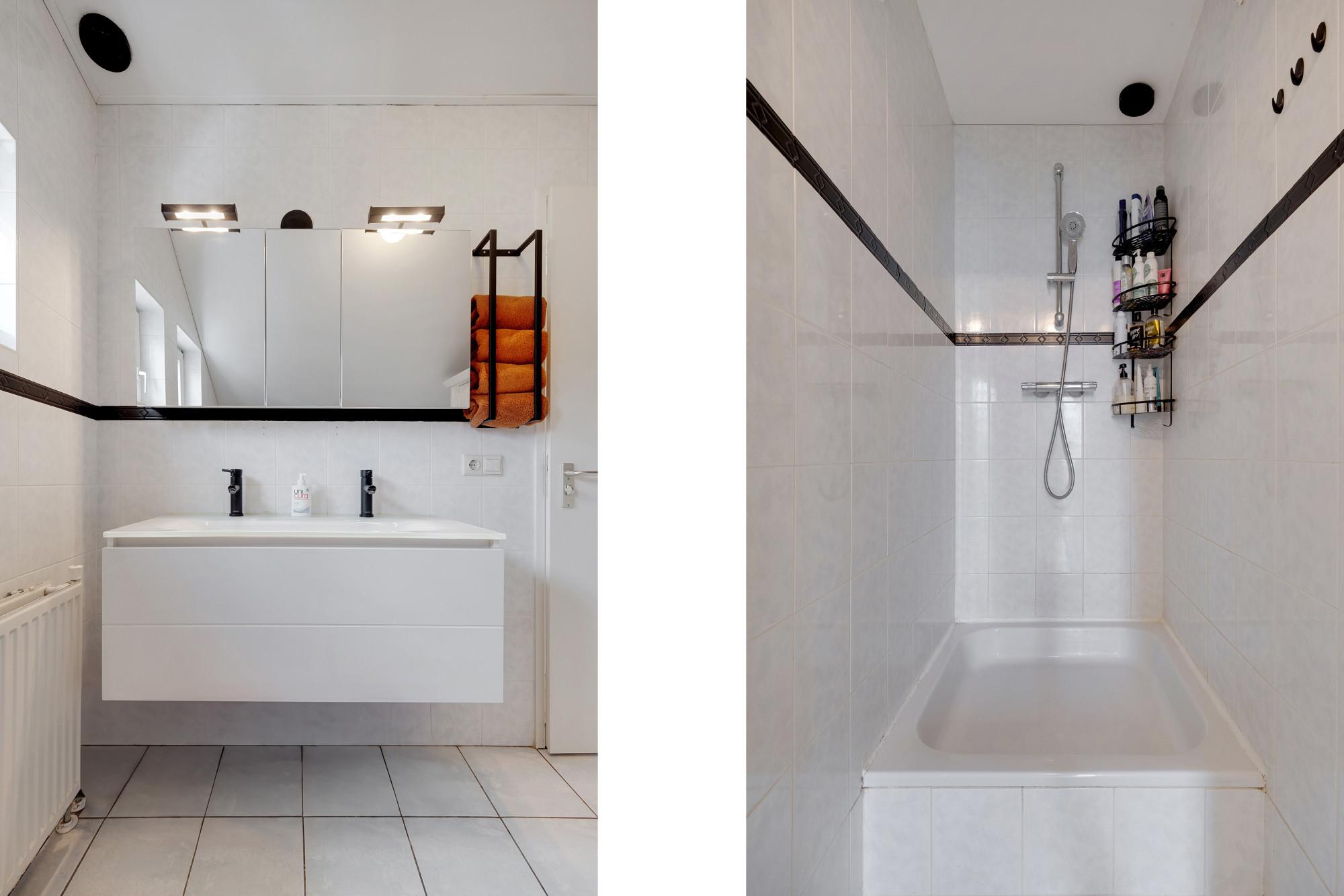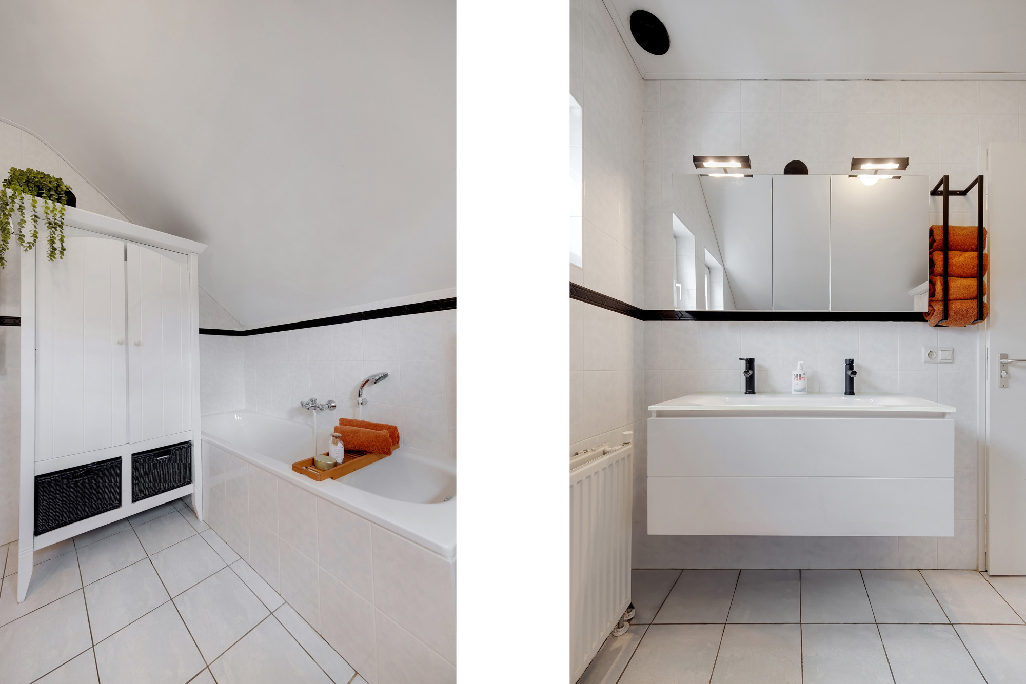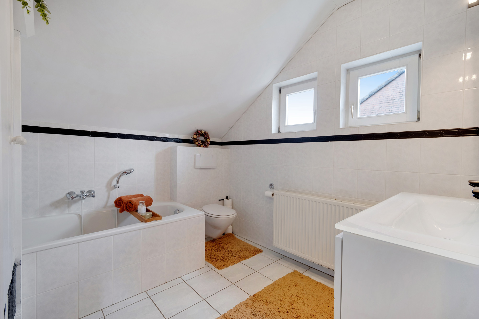 Middels een mooie trappartij komt u op de overloop, waaraan 3 slaapkamers, een badkamer en een separate douche grenzen. 2 slaapkamers hebben hoge plafonds, waardoor deze zeer ruimtelijk ogen. De badkamer is voorzien van een ligbad, 2de toilet en badmeubel met dubbele wastafel en spiegel. Naast de badkamer is er een separate douchegelegenheid. De slaapkamers zijn allen voorzien van een laminaatvloer en zijn ruim van formaat. Ook is er airco aanwezig, waar u de gehele bovenverdieping mee kunt koelen of verwarmen:
