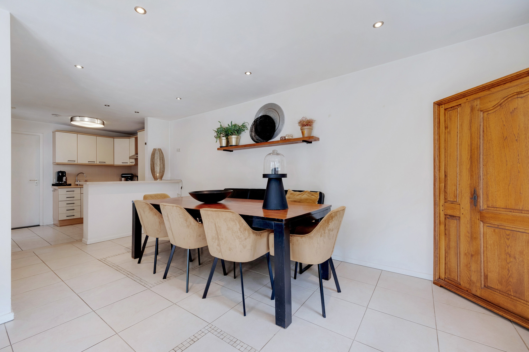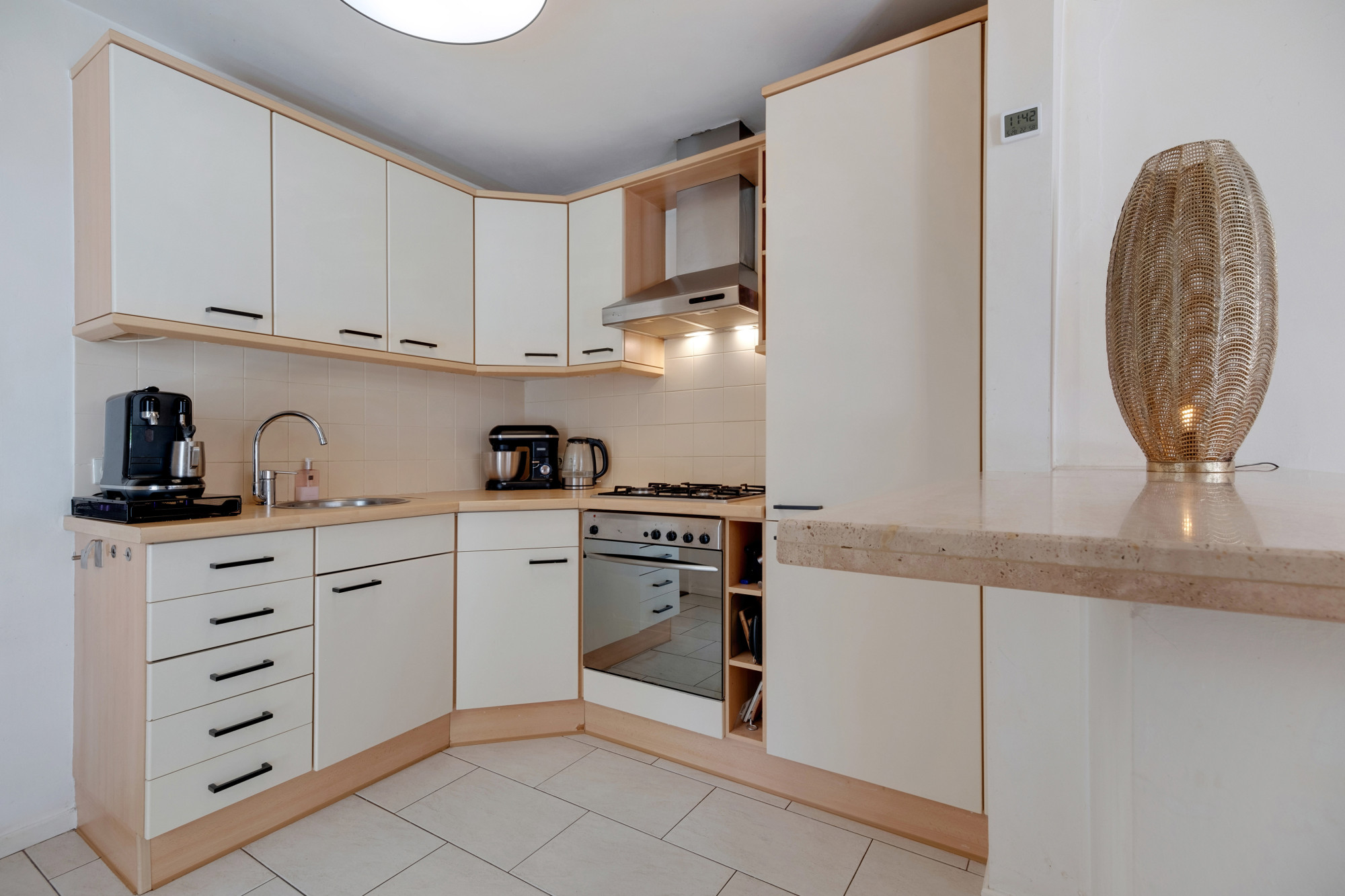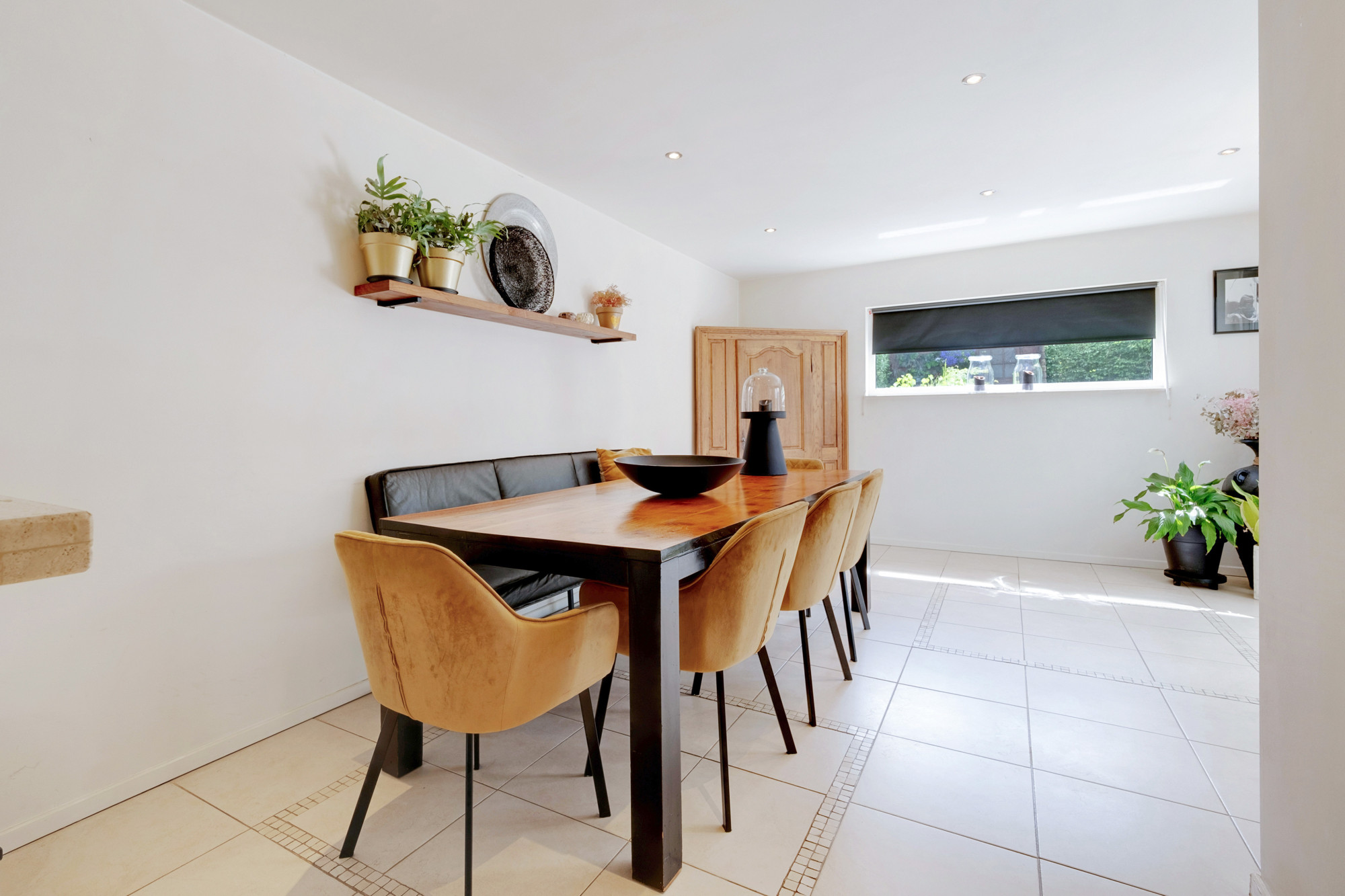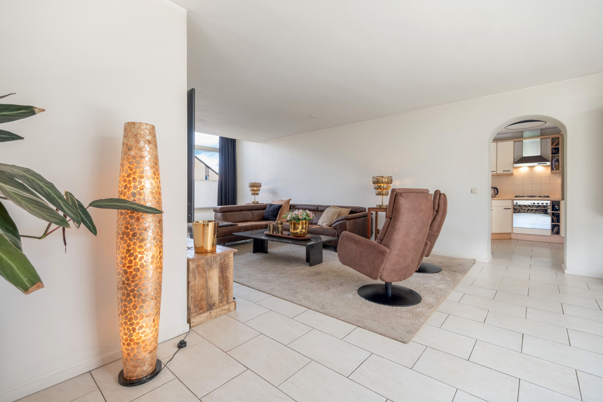 De living staat in verbinding met de royale leefkeuken (ca. 28 m2) en is geschikt voor bijvoorbeeld levensloopbestendig wonen / atelier / hobbyruimte of gewoon als eetkamer. Ook in de leefkeuken heeft u tuincontact middels openslaande deuren. Achter de keuken bevindt zich de bijkeuken, waar tevens de witgoedaansluitingen zijn. Een aantal treden omlaag is de CV-installatie (Radson, bj. 1998 eigendom) met voorraadkasten.