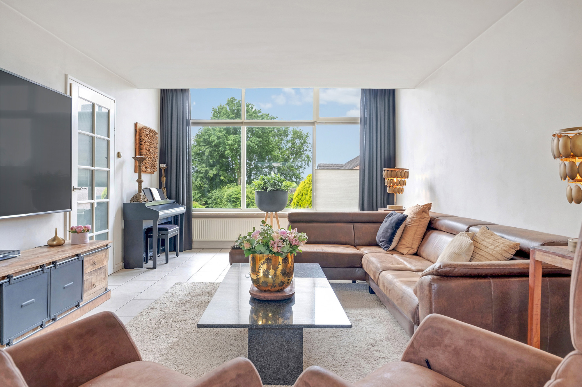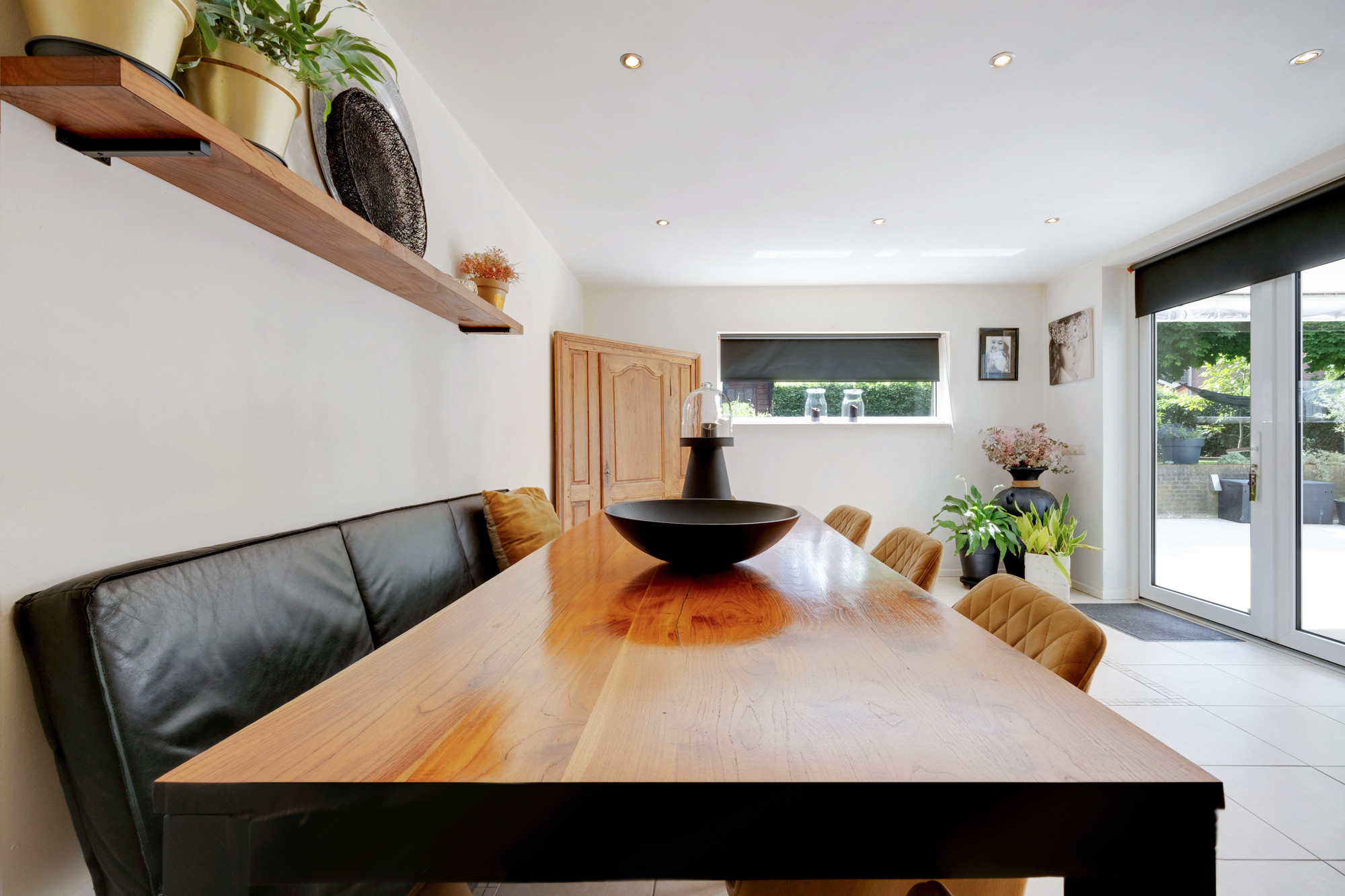 In de ruime hal/entree bevindt zich een modern toilet met fonteintje en de meterkast en heeft u toegang tot de living. Deze bijzonder lichte living is voorzien van een sfeervolle houthaard, vloerverwarming (nagenoeg gehele begane grond) en airconditioning. De schuifpui naar het overdekt terras zorgt voor een optimaal tuincontact.