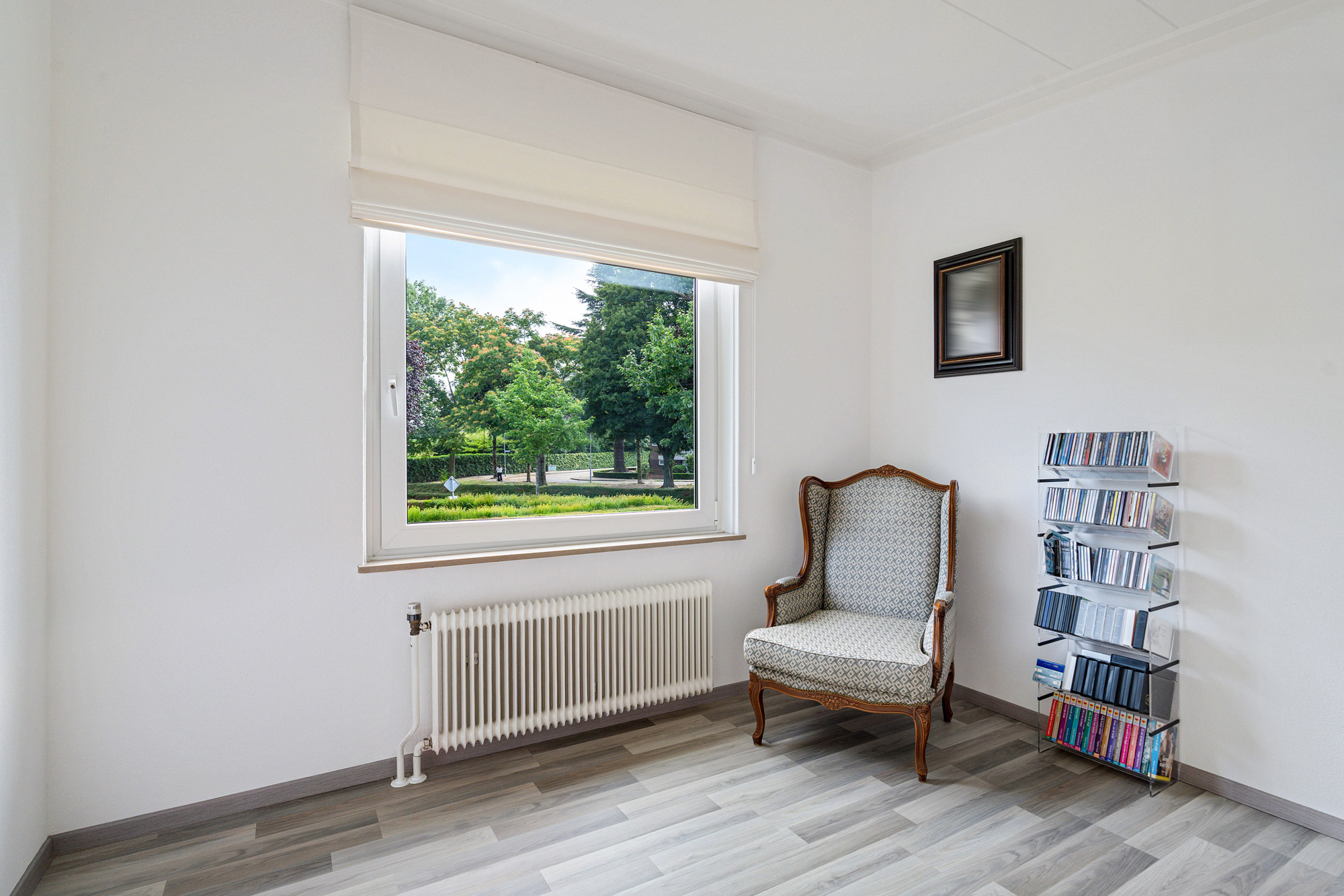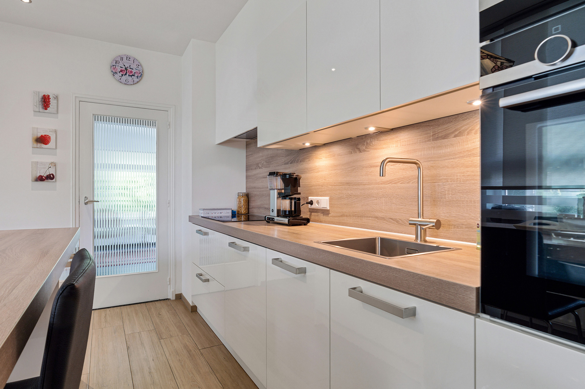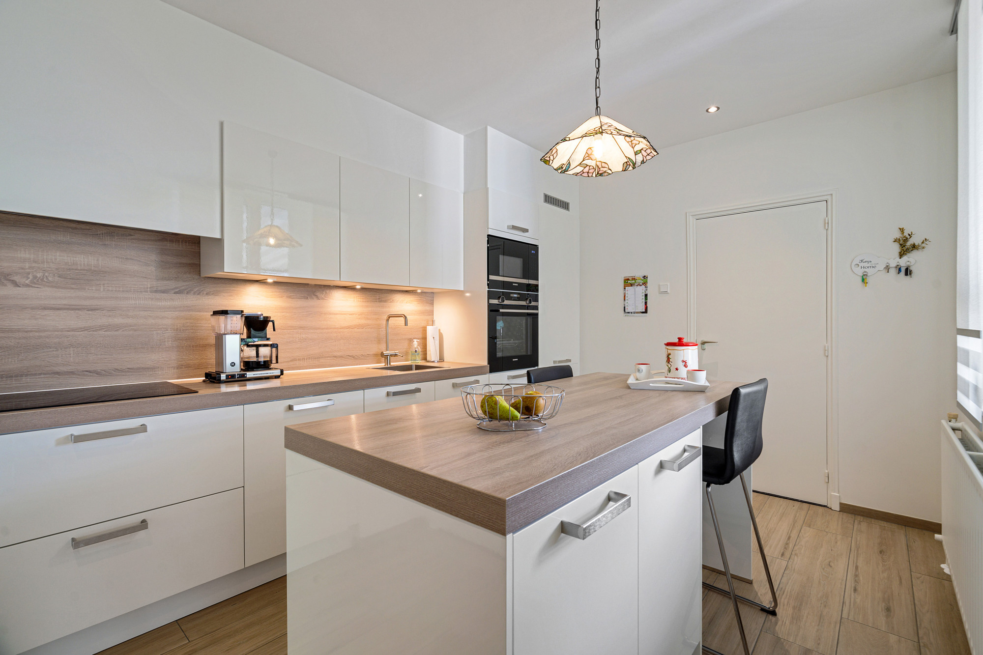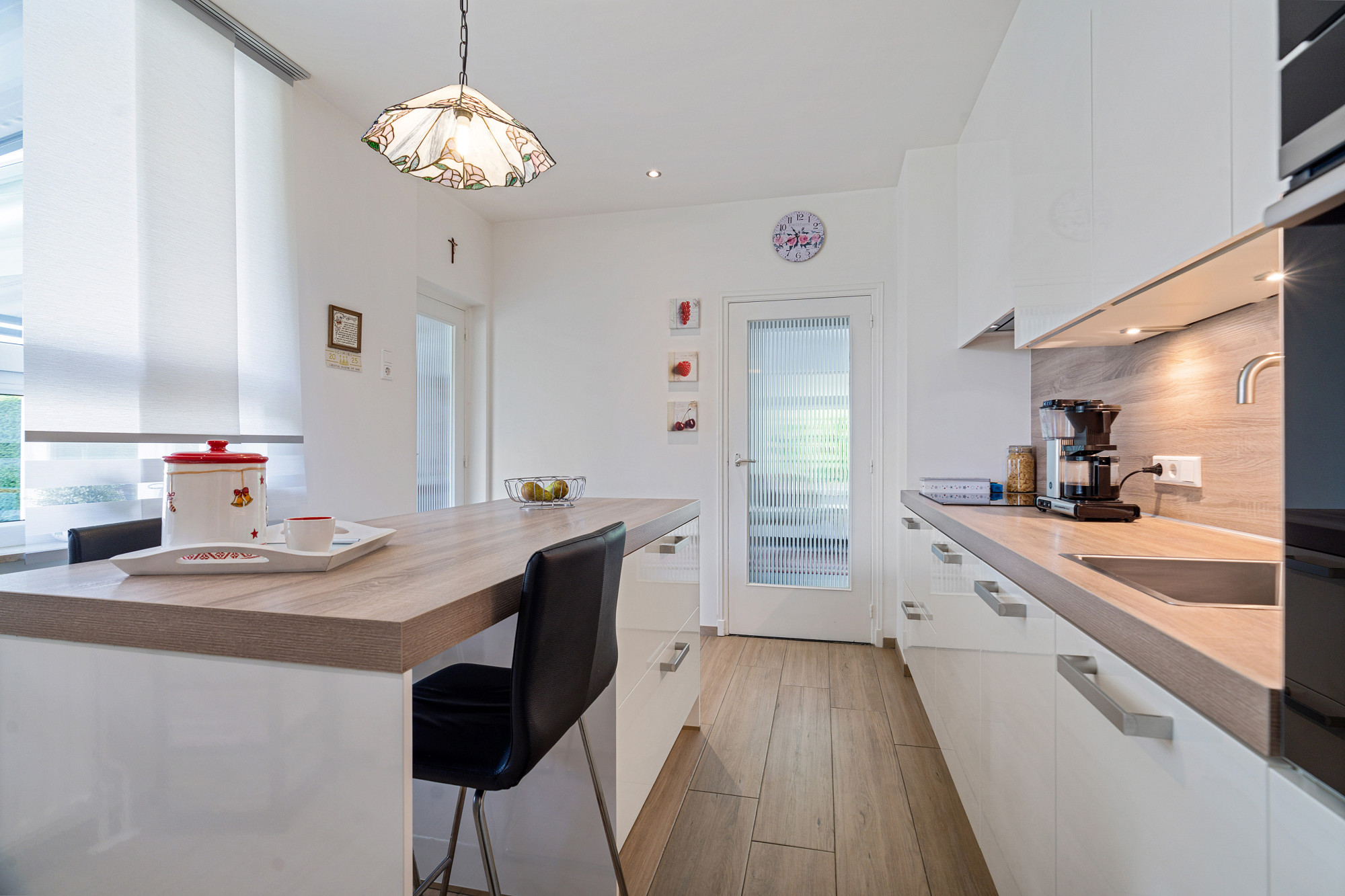 De ruime living valt op door de grote raampartijen die zorgen voor een overvloed aan natuurlijk licht, een stijlvolle parketvloer en staat in directe verbinding met de moderne keuken, die is voorzien van een kookeiland met zitgelegenheid en een elegante wandkast. De keuken is verder uitgerust met hoogwaardige inbouwapparatuur (Siemens) waaronder een inductiekookplaat, oven, magnetron, een koelkast, afzuigsysteem en vaatwasser