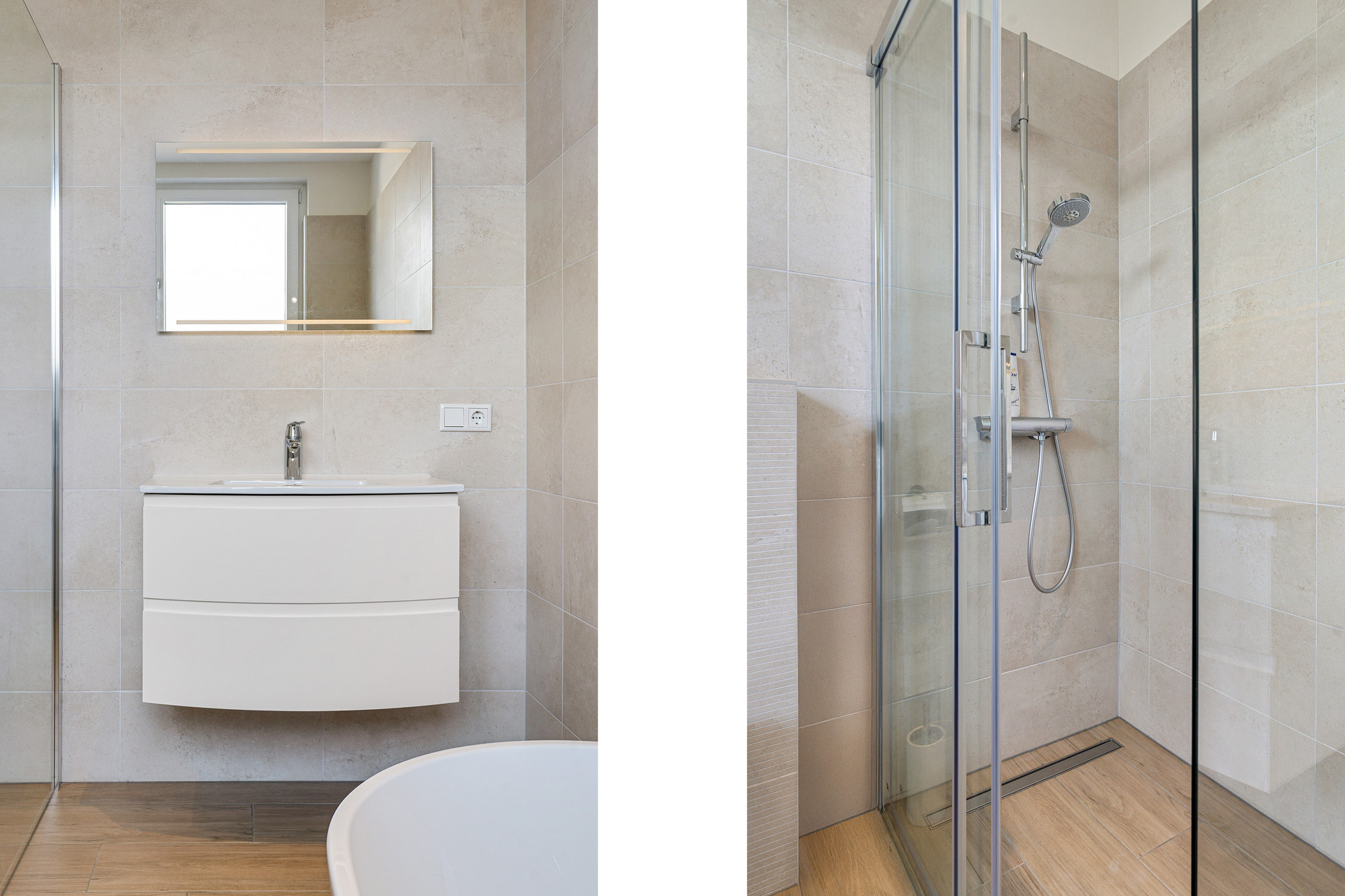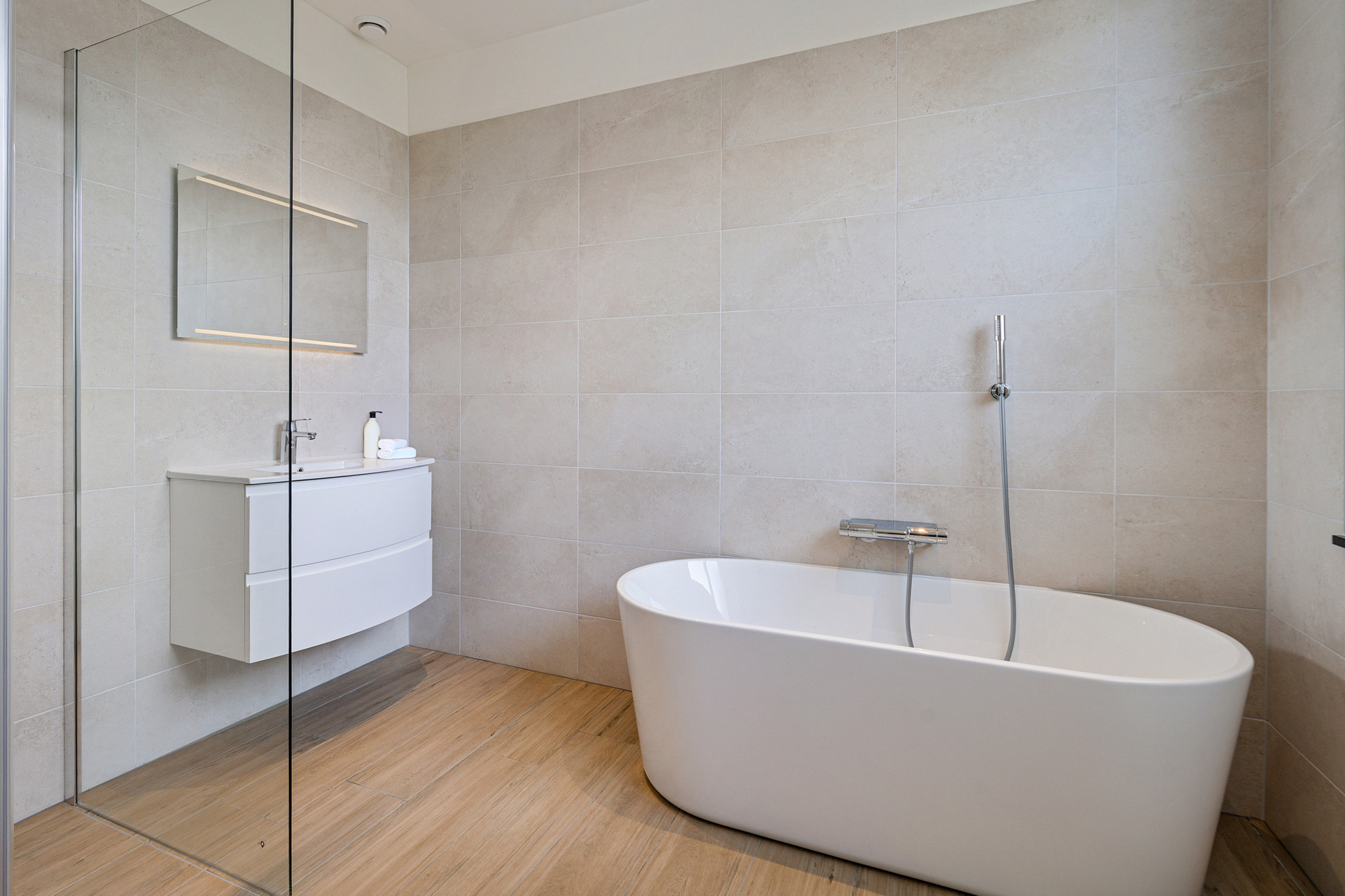 Vanuit een tweede tussenhal is de kelder, eerste verdieping en badkamer met toilet, inloopdouche, badmeubel en ligbad bereikbaar.