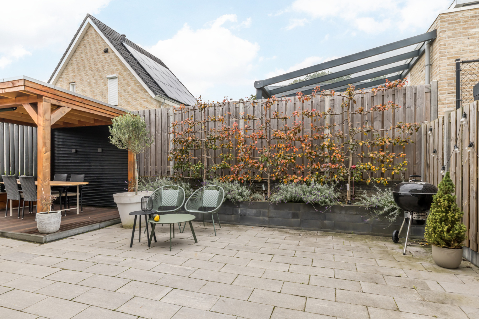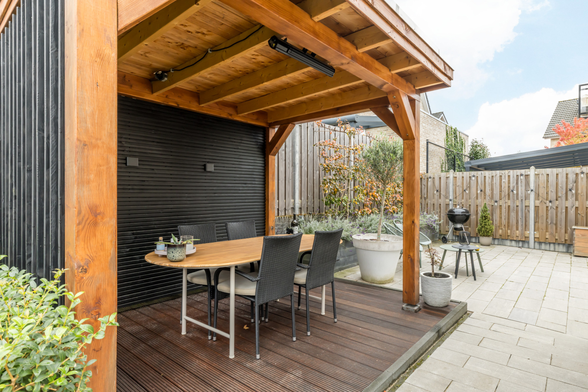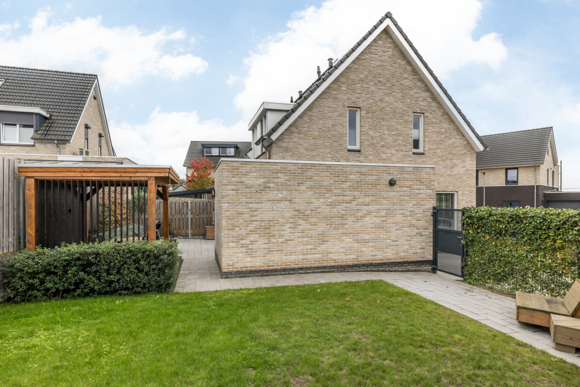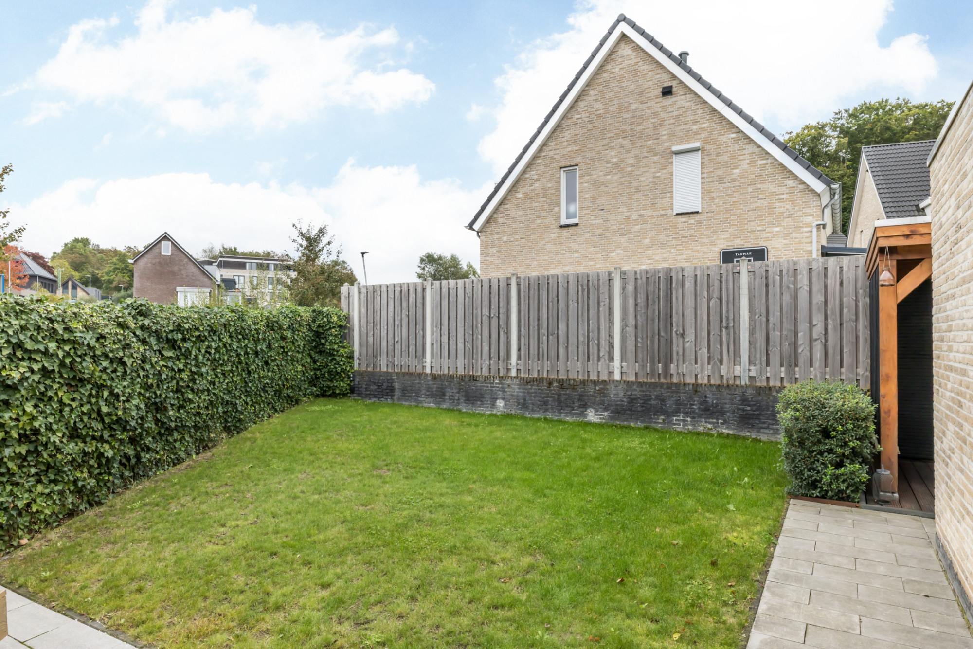 De keurig onderhouden tuin is v.v. een sfeervol overdekt terras (3,13 m x 2,60 m) en aan de zijkant gelegen grasweide. Tevens heeft men toegang tot de garage en middels poort is de tuin achterom bereikbaar.