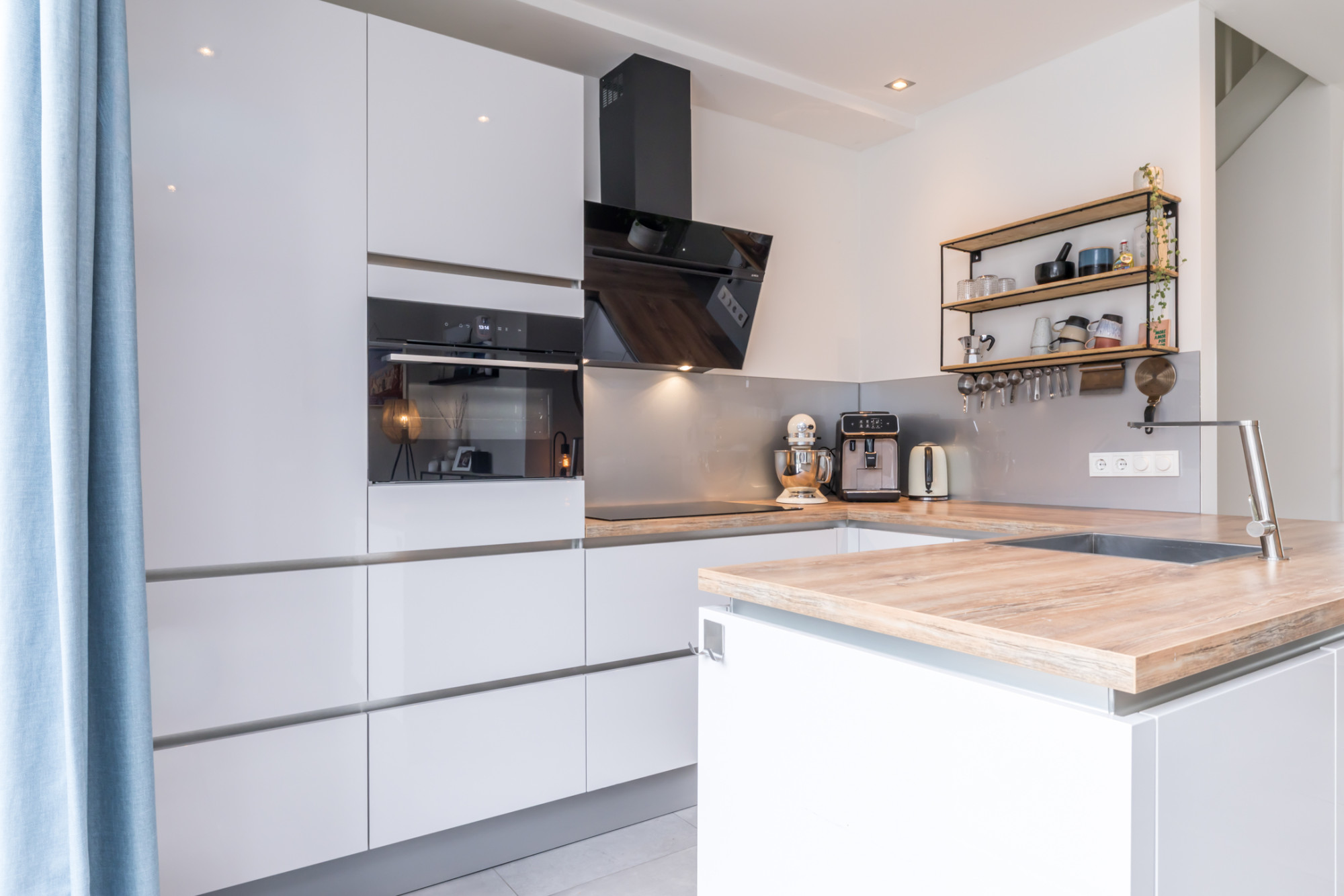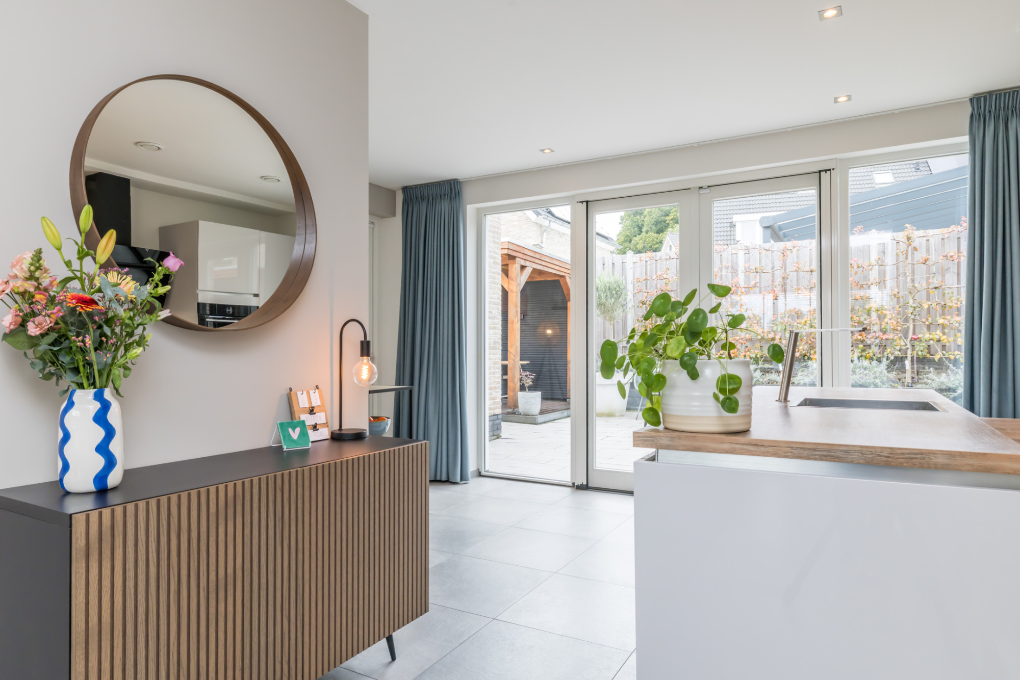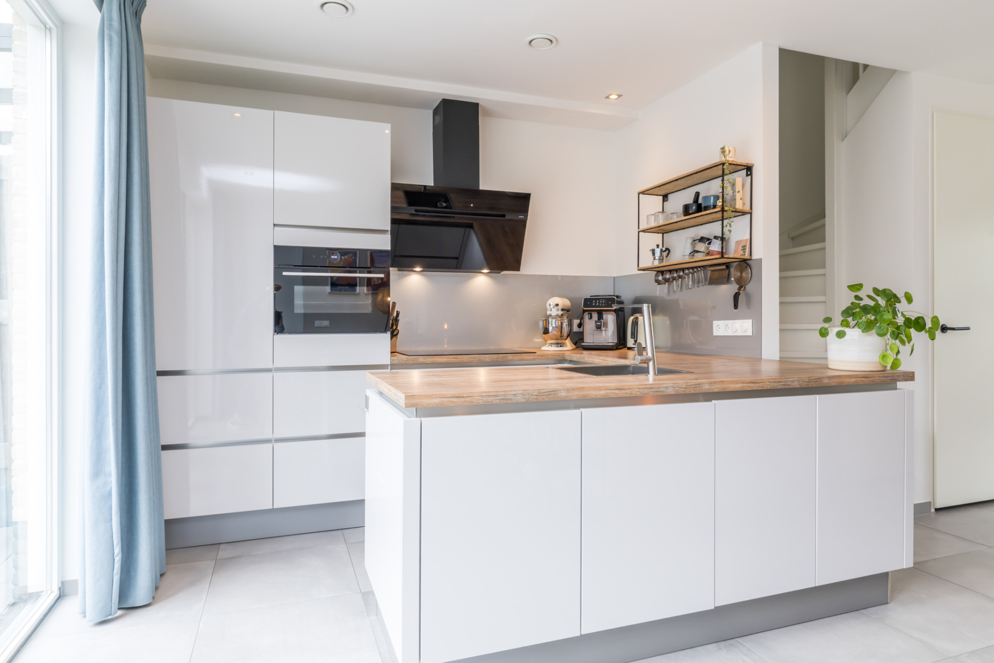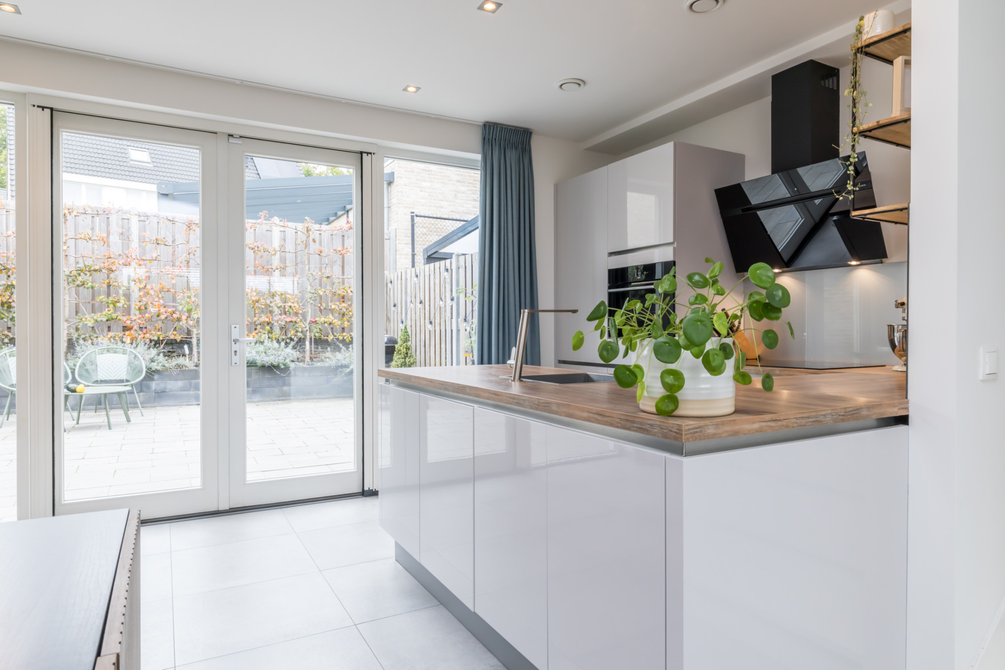 Moderne open leefkeuken (5,50 m x 2,99 m) met installatie en apparatuur t.w.: oven (2024), 4 pits inductiekookplaat, afzuigkap, vaatwasser en koelkast. De dubbele openslaande deuren, beide voorzien van plissé hordeur zorgen voor het ideale tuincontact. Inpandig vanuit keuken te bereiken garage, tevens gebruikt als opslag en bijkeuken (5,99 m x 3,40 m) is v.v. aanrecht met wasbak en een deur naar de tuin.