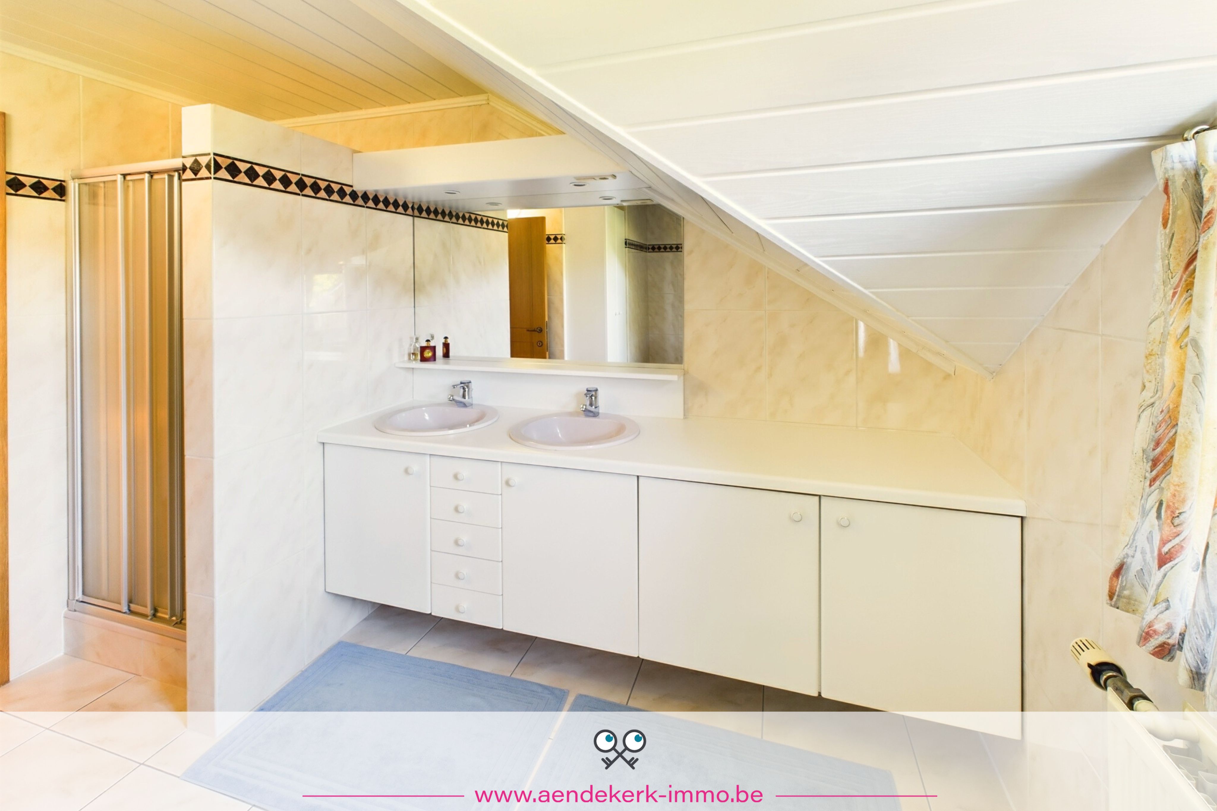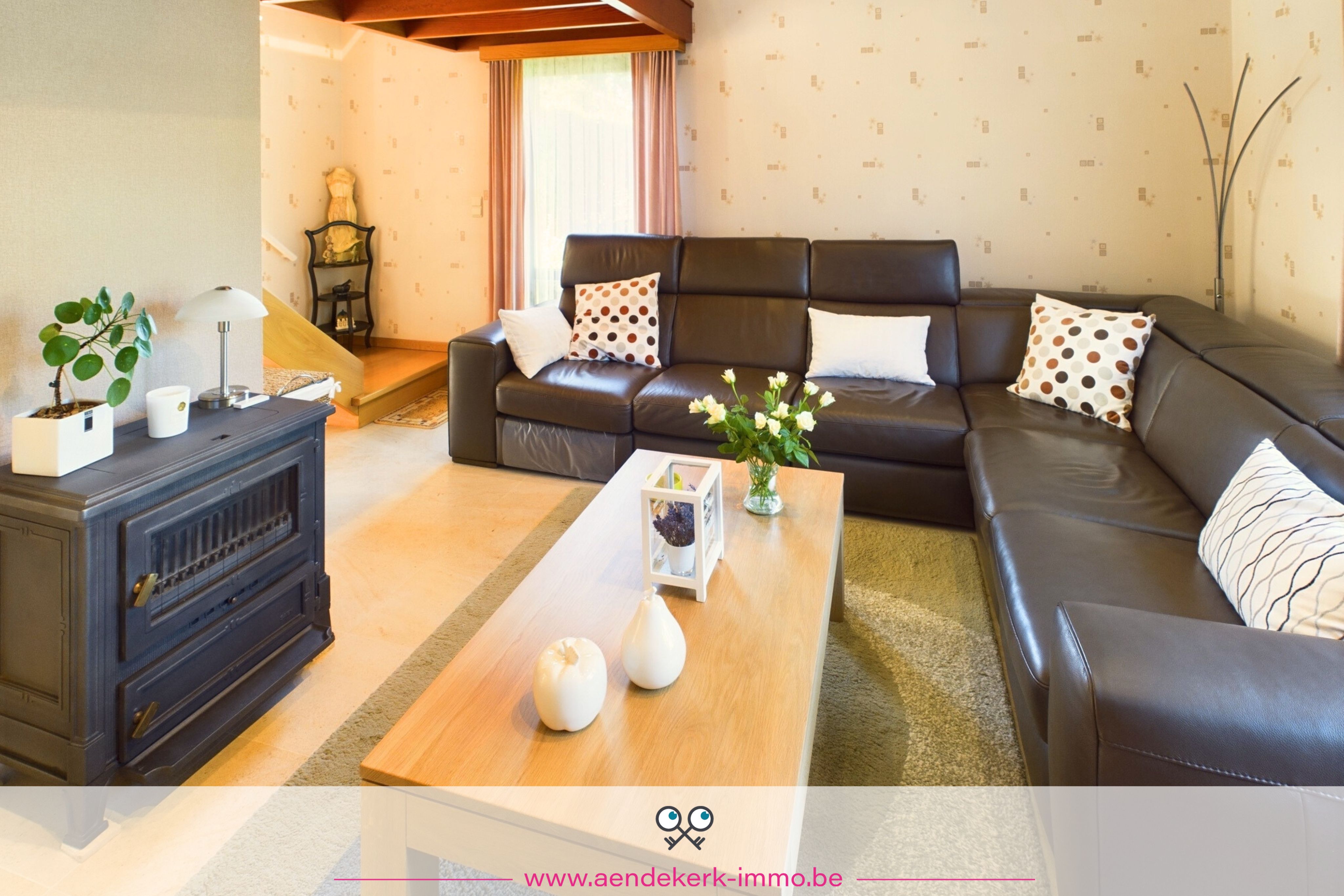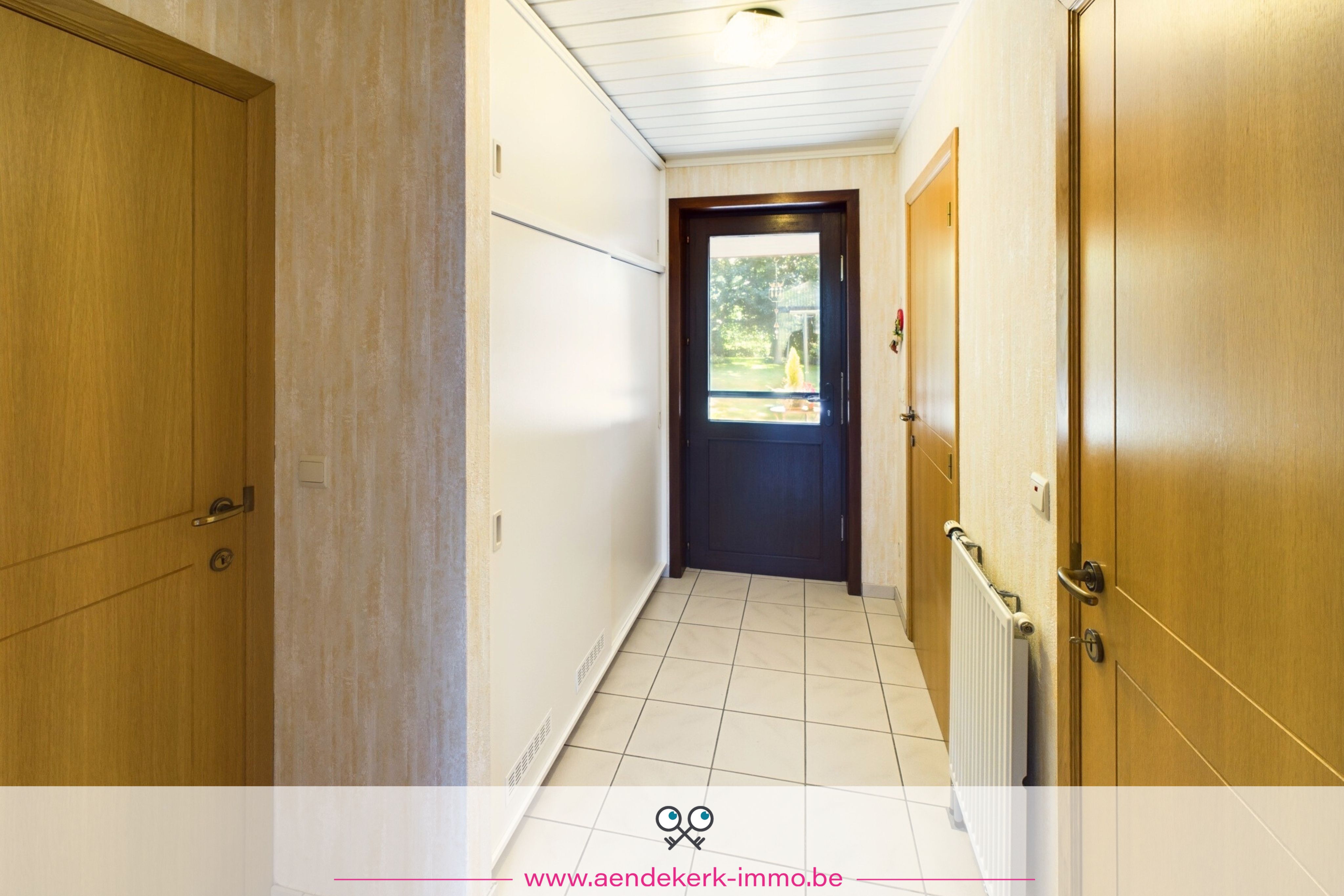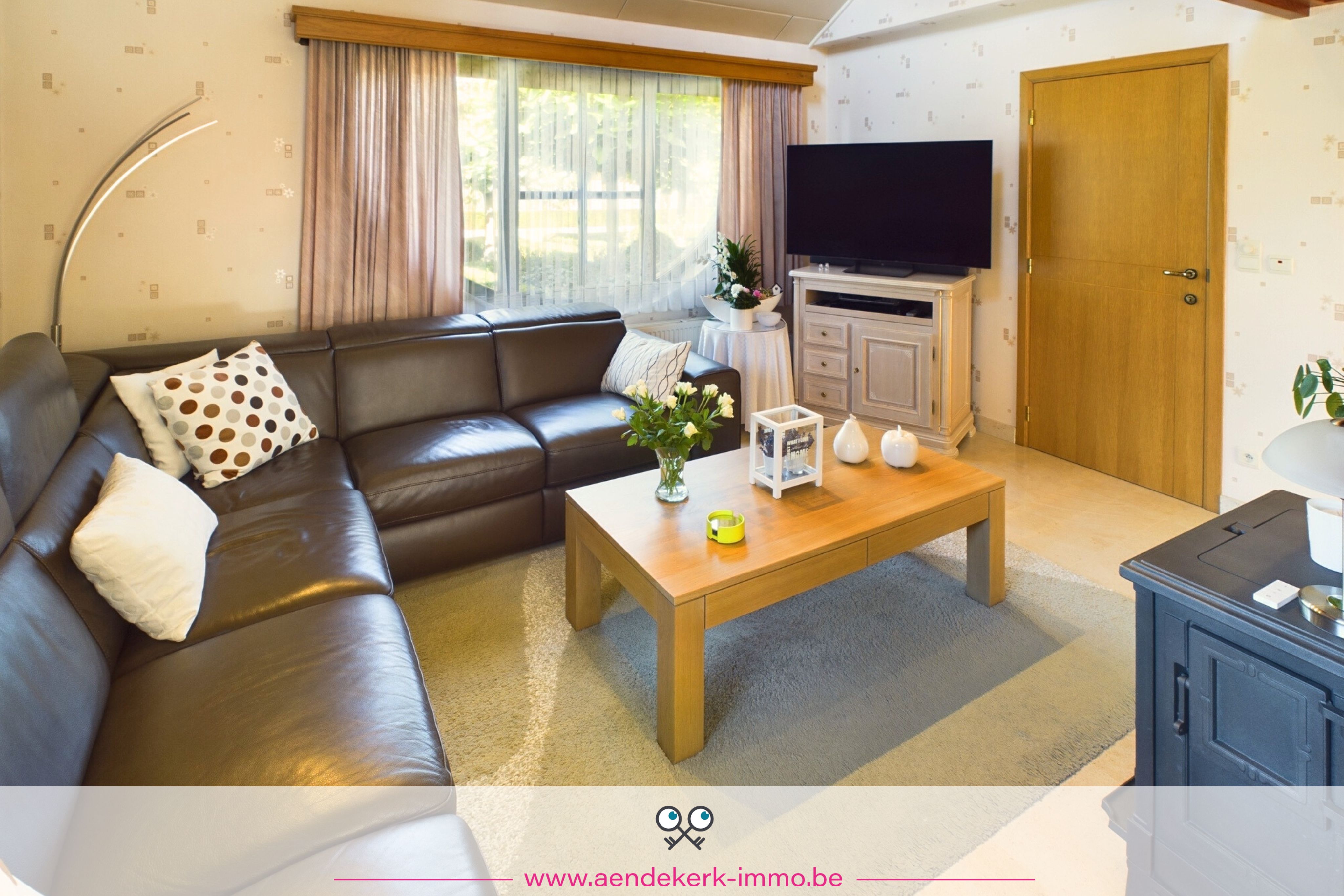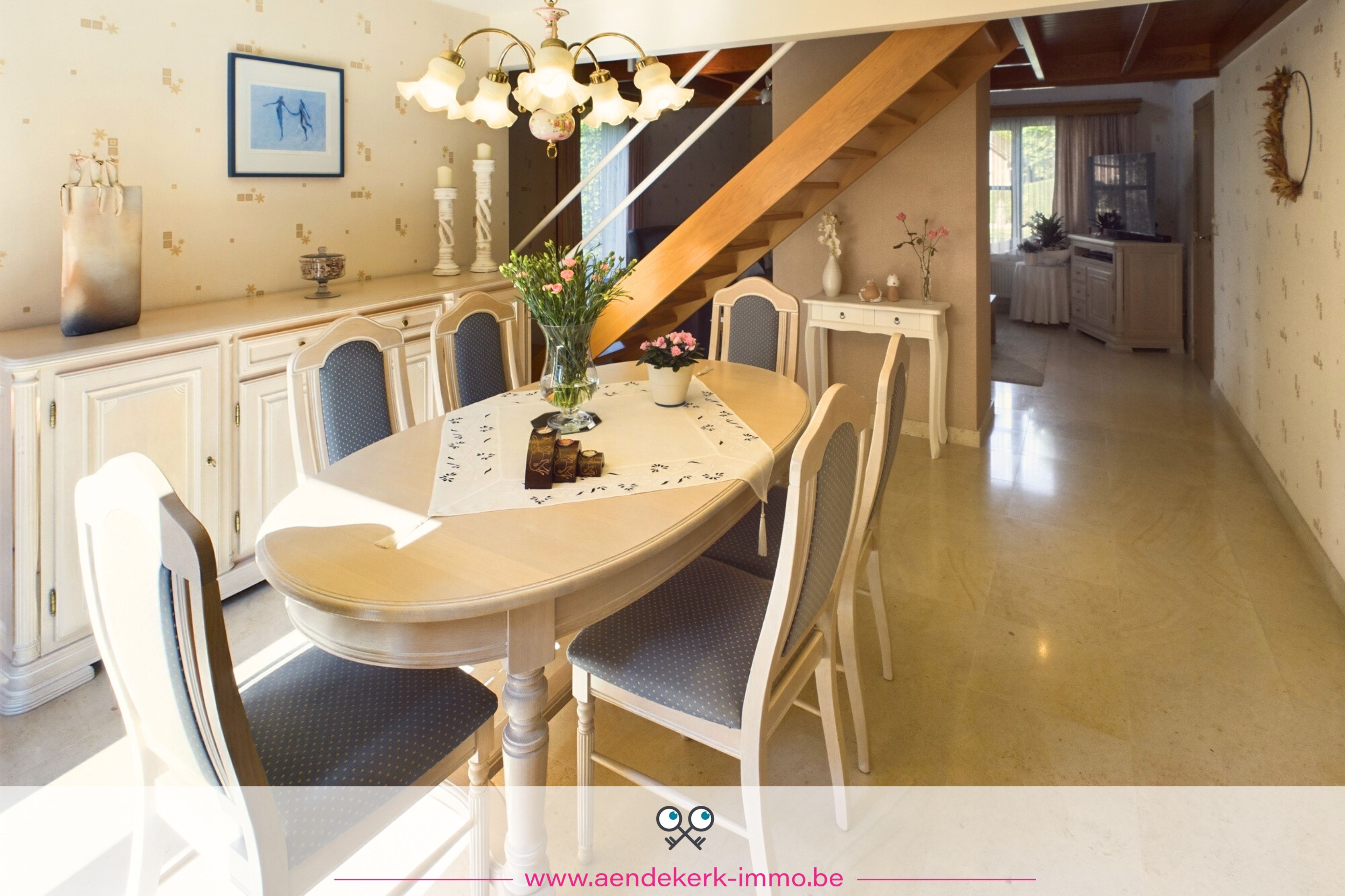 Bij het binnenkomen betreed je een ruime inkomhal die toegang biedt tot de verschillende leefruimtes. De woonkamer is royaal opgezet en baadt in het daglicht dankzij de grote ramen, die meteen een verbinding met de groene tuin geven. Hier is het fijn vertoeven voor een gezellig samenzijn of een avondje ontspannen.