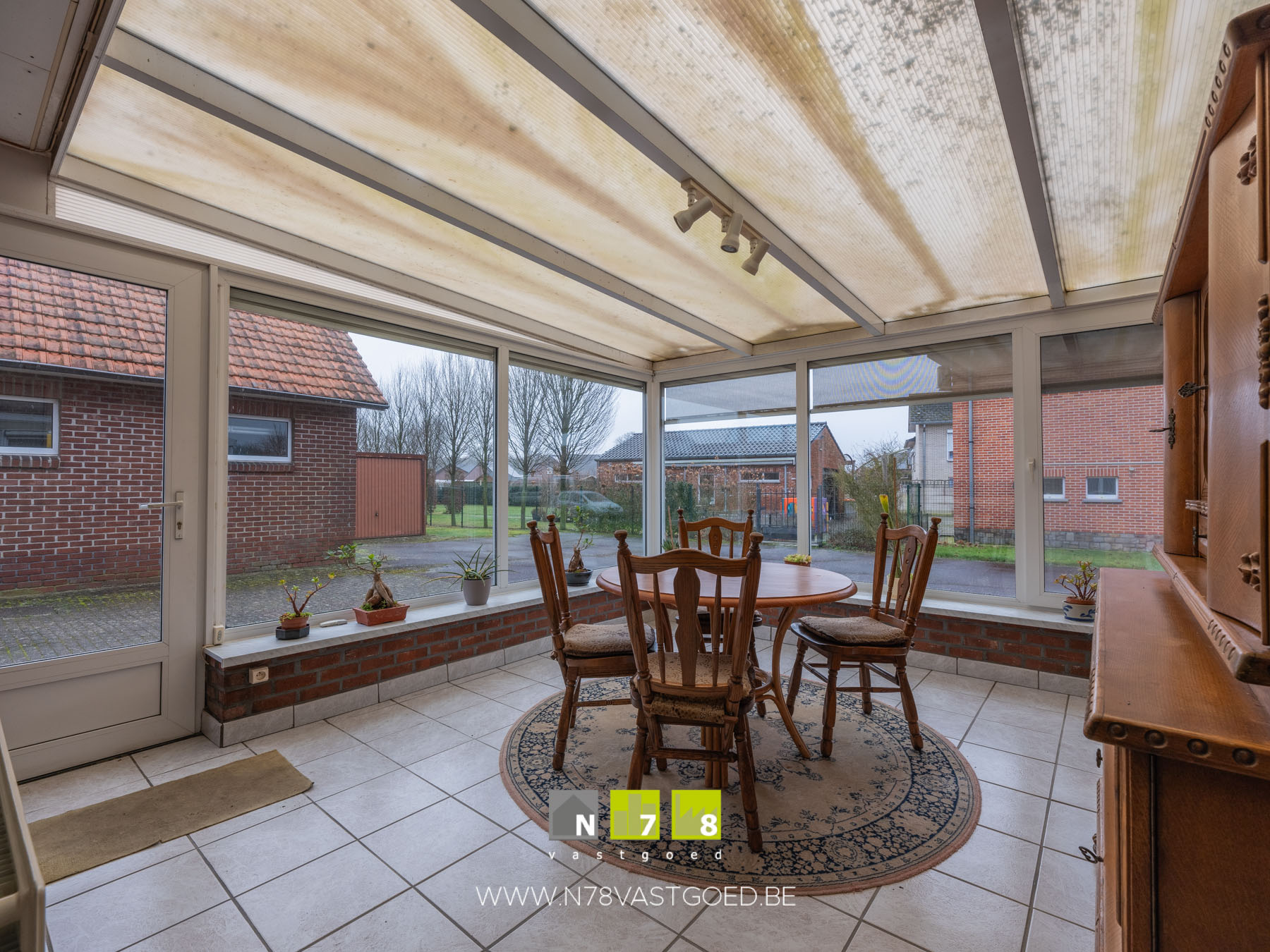 - Veranda (3,73m x 3,73m = 13,91m²): radiator, automatische screens, tegelvloer.