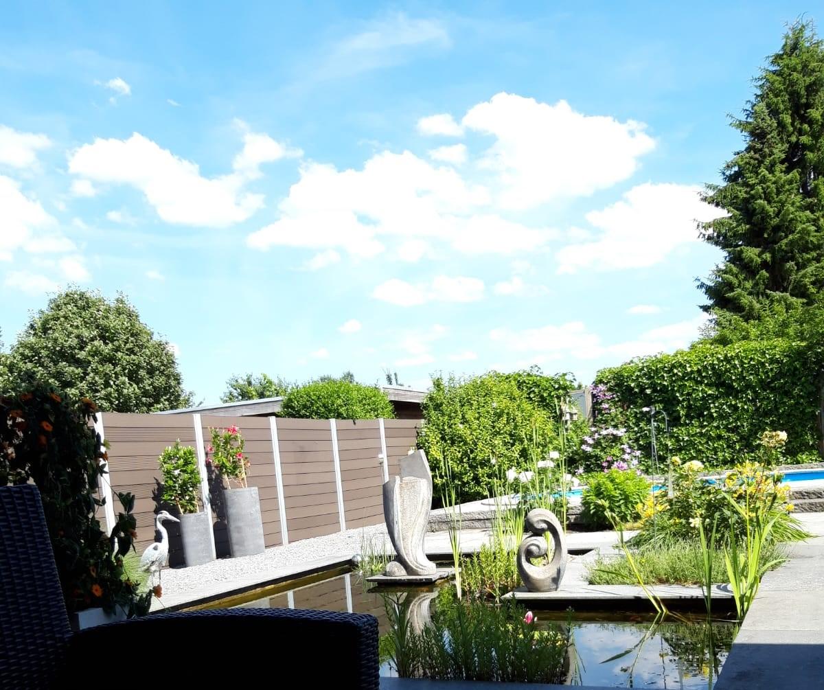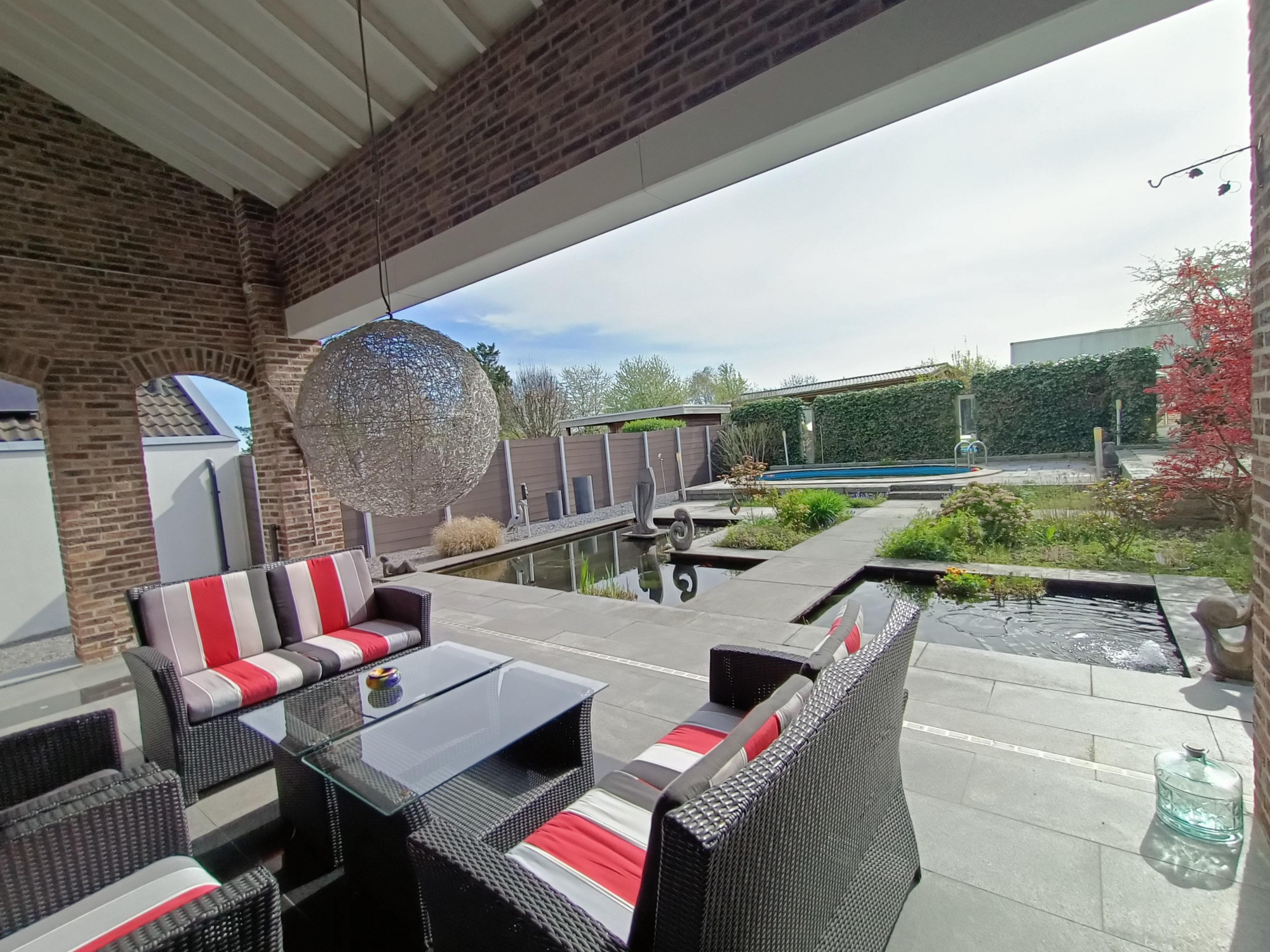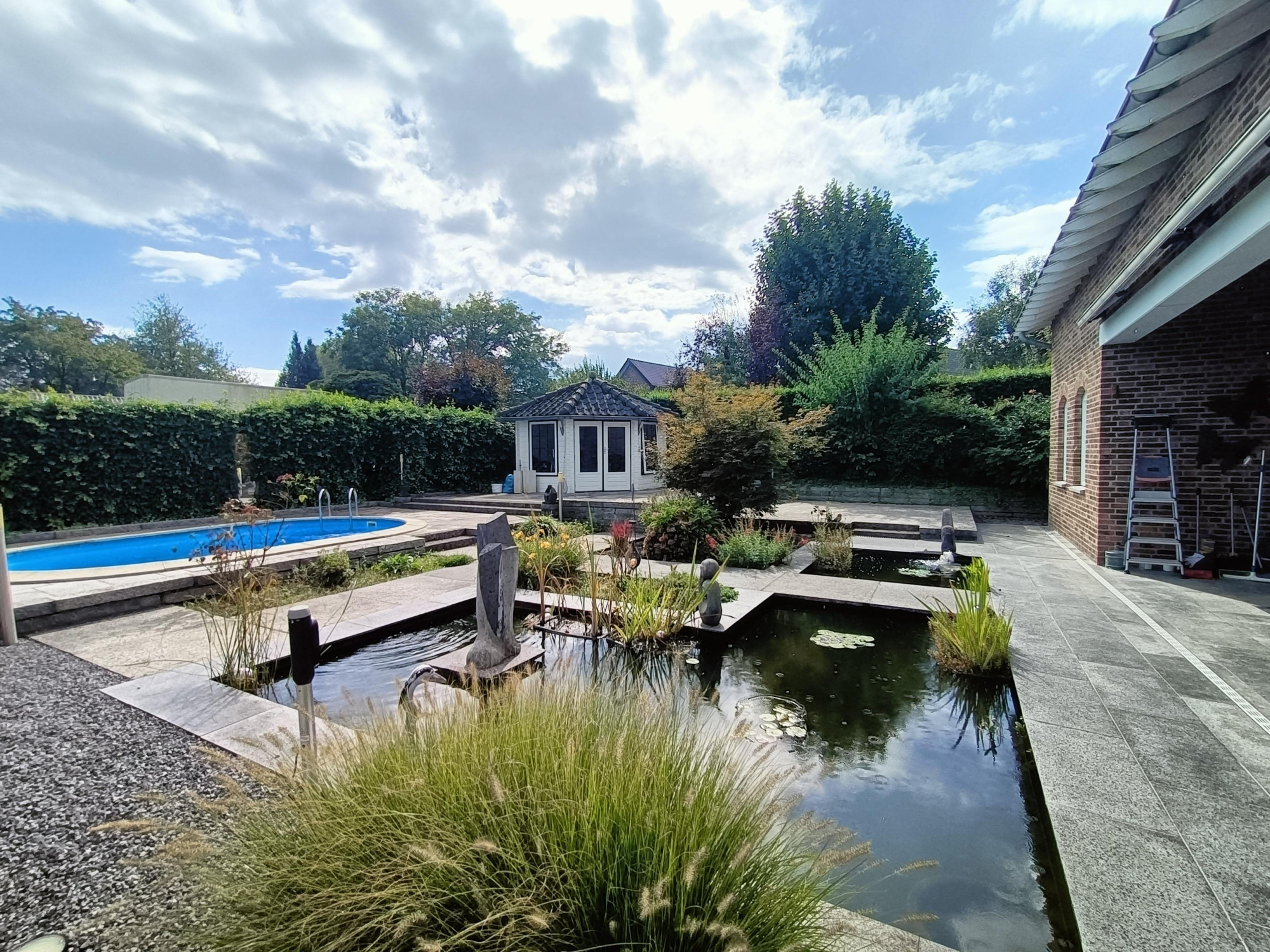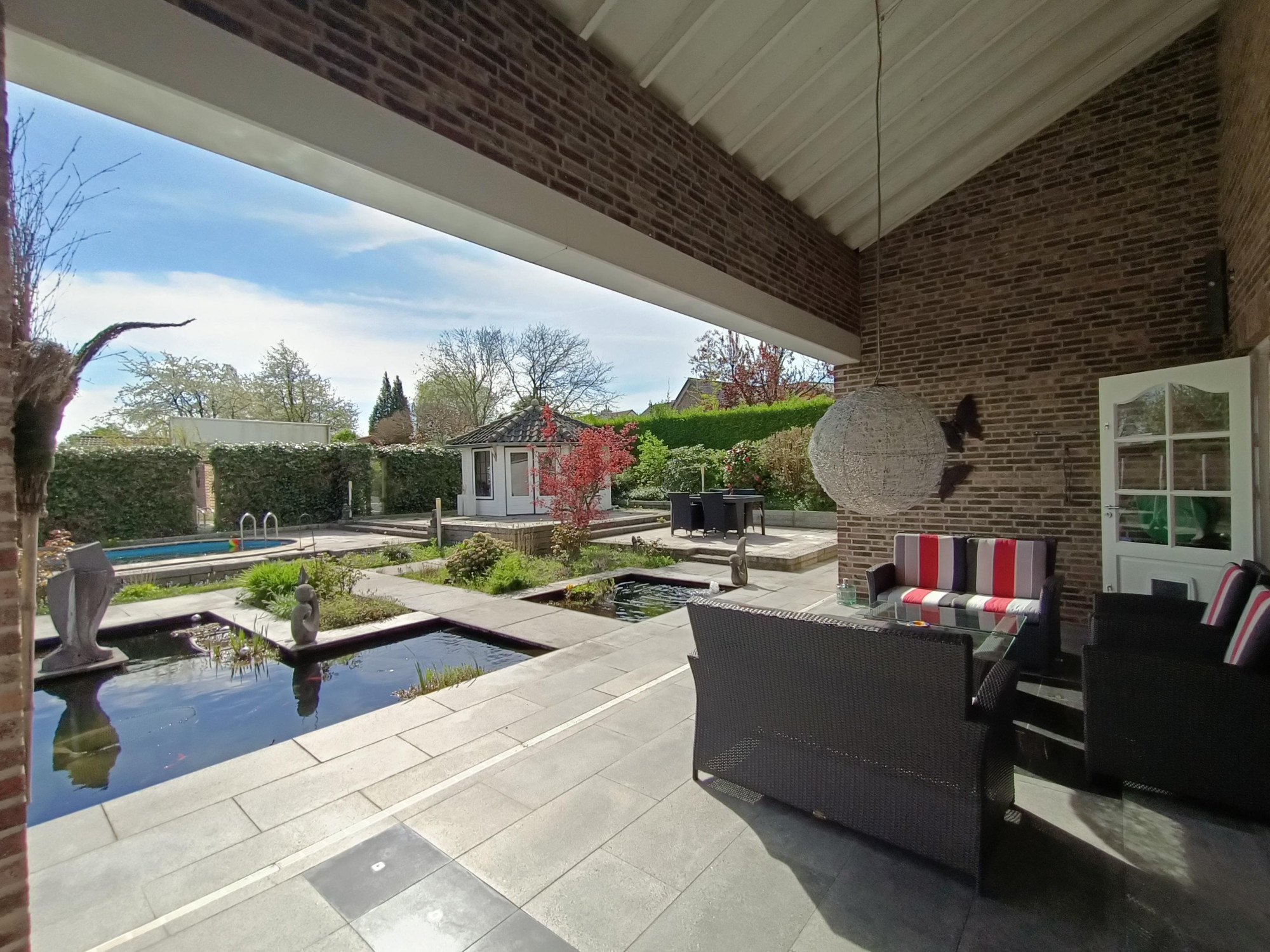 Naast mogelijkheid te genieten van zon en zwembad, biedt deze tuin een overdekt terras (ca. 19,7 m²) met granieten vloer en zicht op een strakke vijverpartij. Vloerspots en tuinverlichting zorgen voor een sfeervolle ambiance, waardoor dit terras de ideale plek wordt voor gezellige avonden.