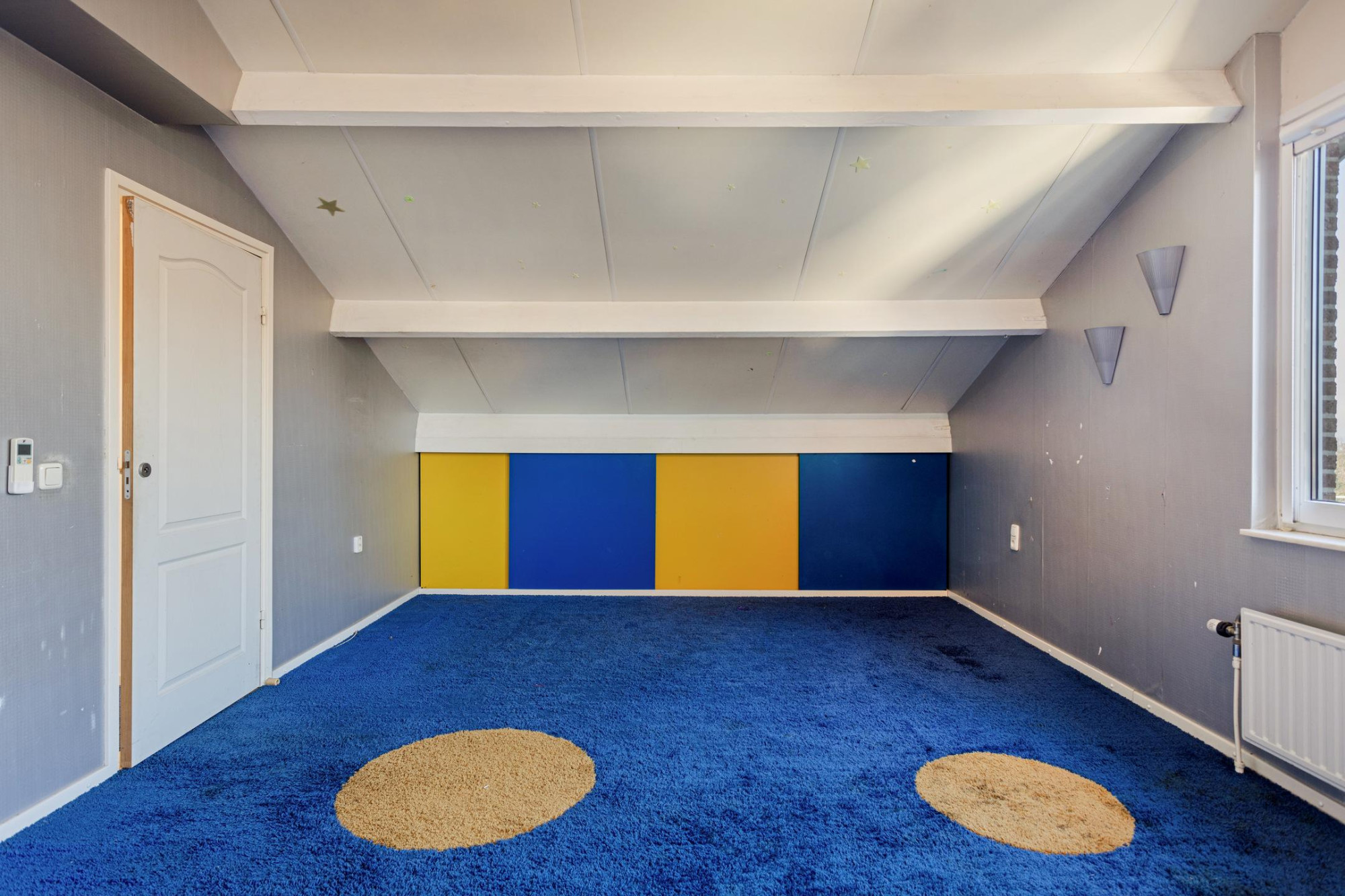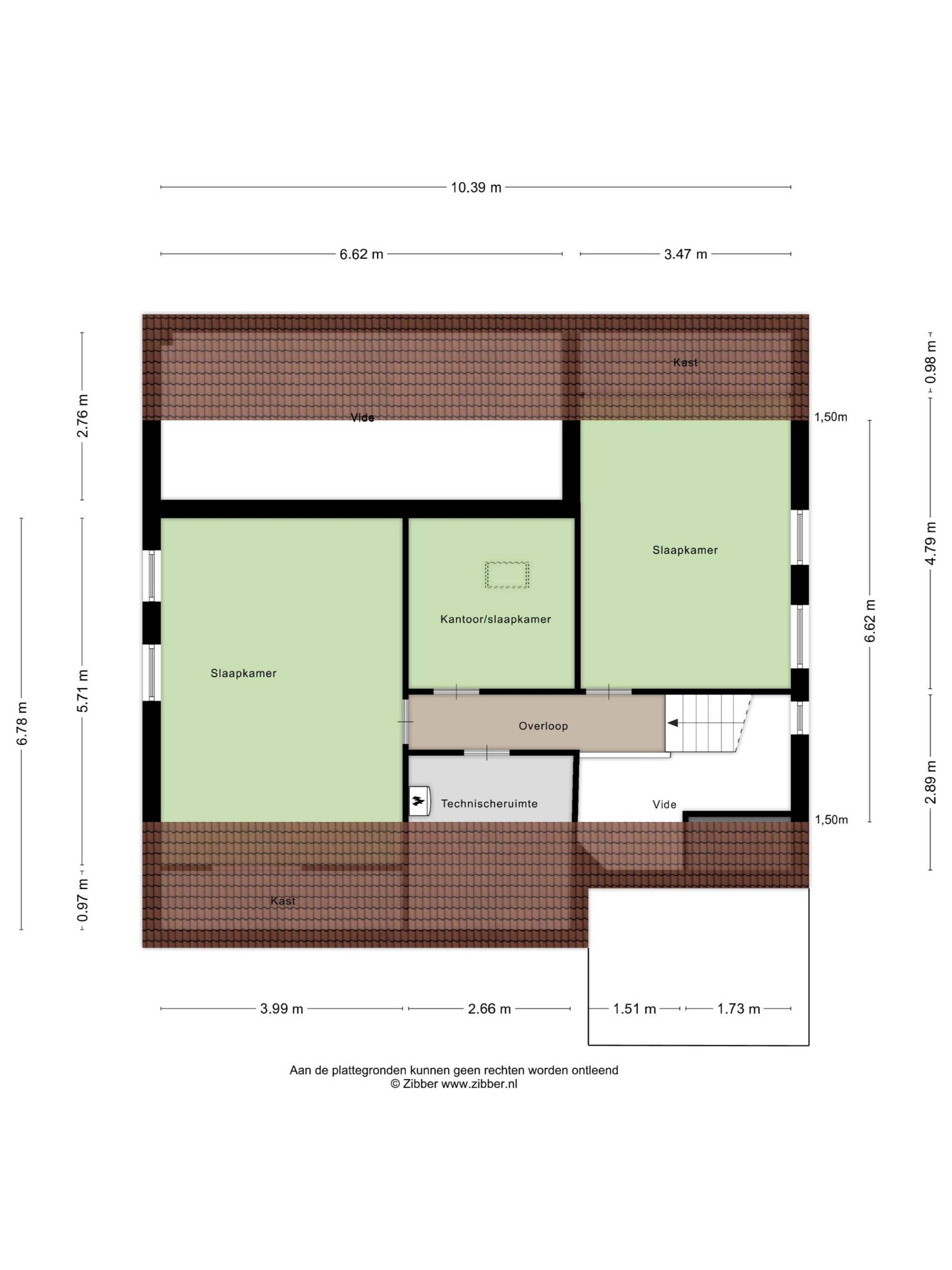 Gang met toegang tot drie slaapkamers (resp. ca. 21,2 m², ca. 15,5 m² en ca. 7,3 m²). De grootste twee slaapkamers hebben een hoge nok, zijn voorzien van tapijt, airconditioning (met mogelijkheid tot zowel koelen als verwarmen) en beschikken over volop bergruimte dankzij de diepe muurkasten onder de schuine kant van het dak. De overige slaapkamer is momenteel in gebruik als kantoor en beschikt over een laminaatvloer.