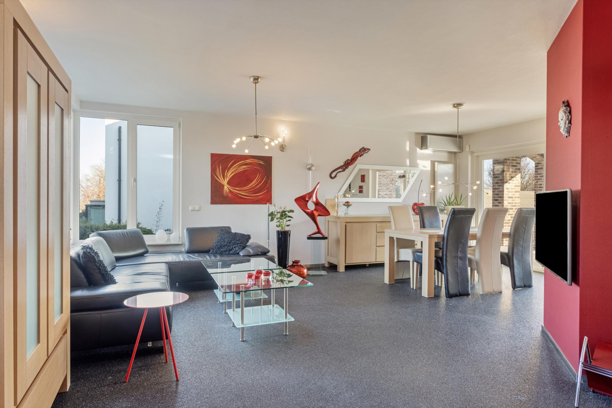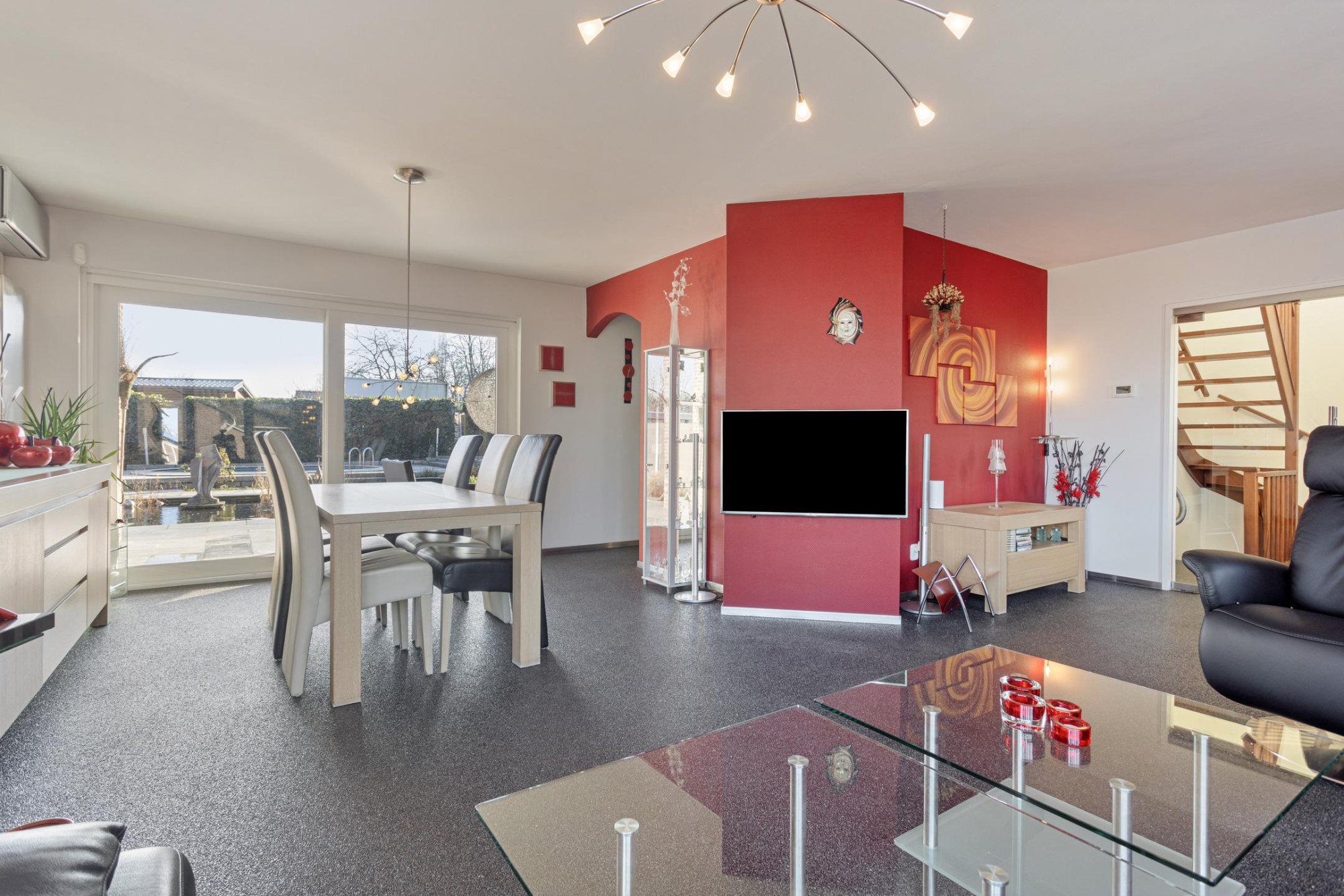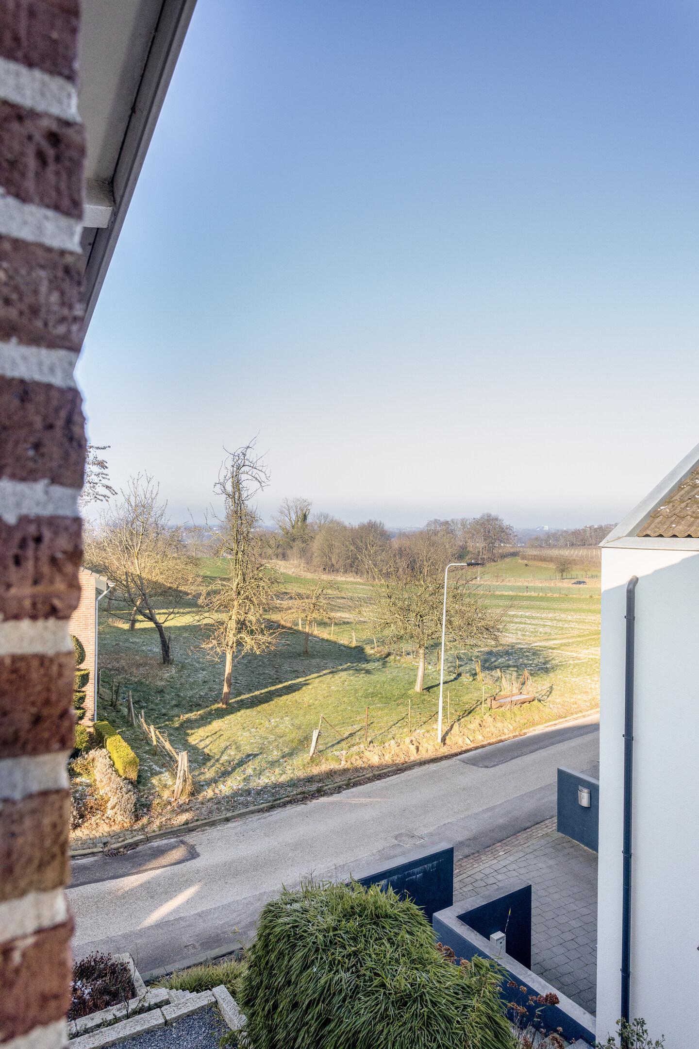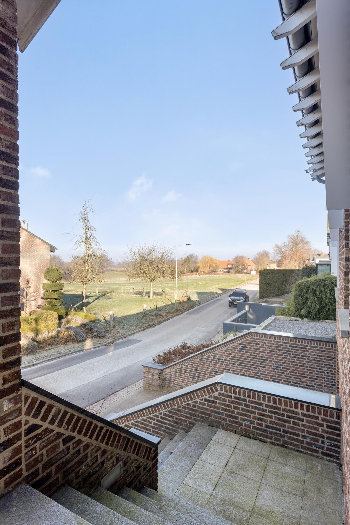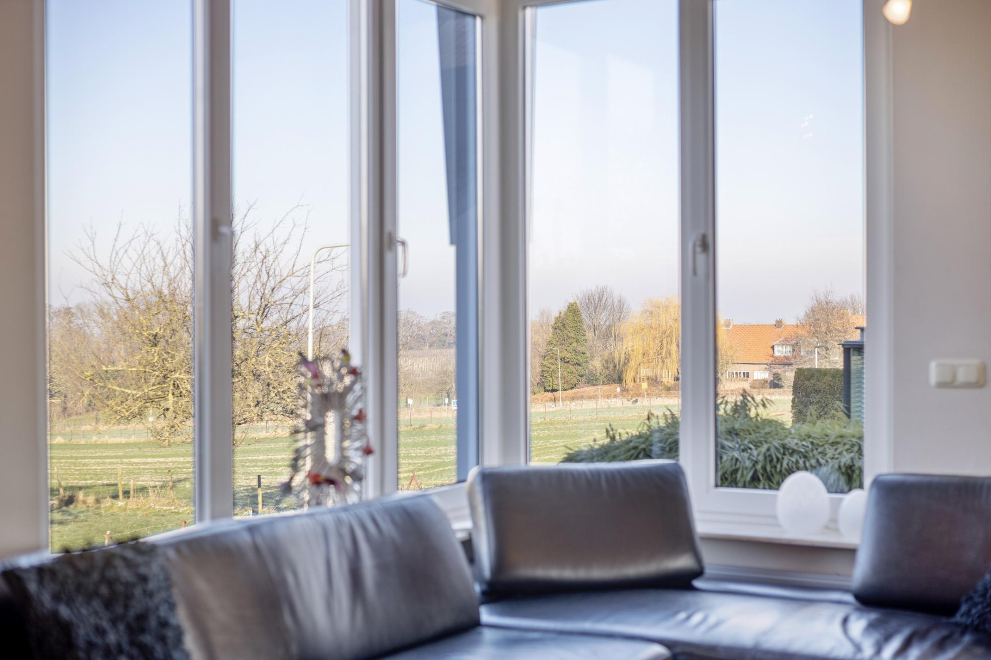 De ruime en lichte woonkamer (ca. 38 m²) biedt aan de voorzijde een prachtig uitzicht over de landerijen en aan de achterzijde, middels een brede, glazen schuifpui, rechtstreekse toegang tot het terras en de tuin. De ramen zijn voorzien van elektrisch bedienbare zonwering en de airconditioning kan de ruimte zowel koelen als verwarmen. Plaatsing van een (gas)haard is mogelijk.