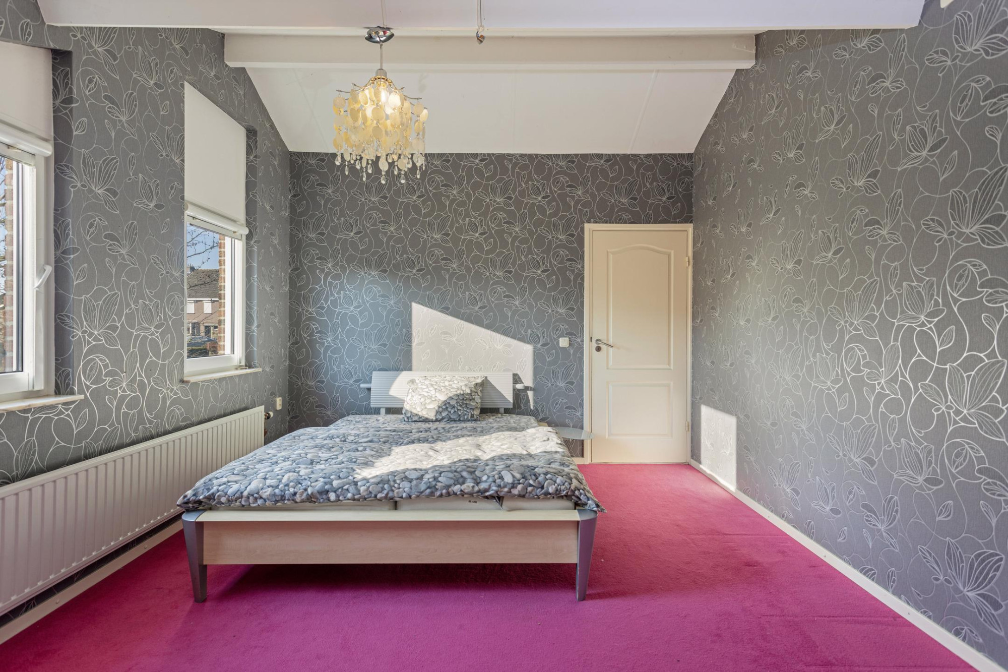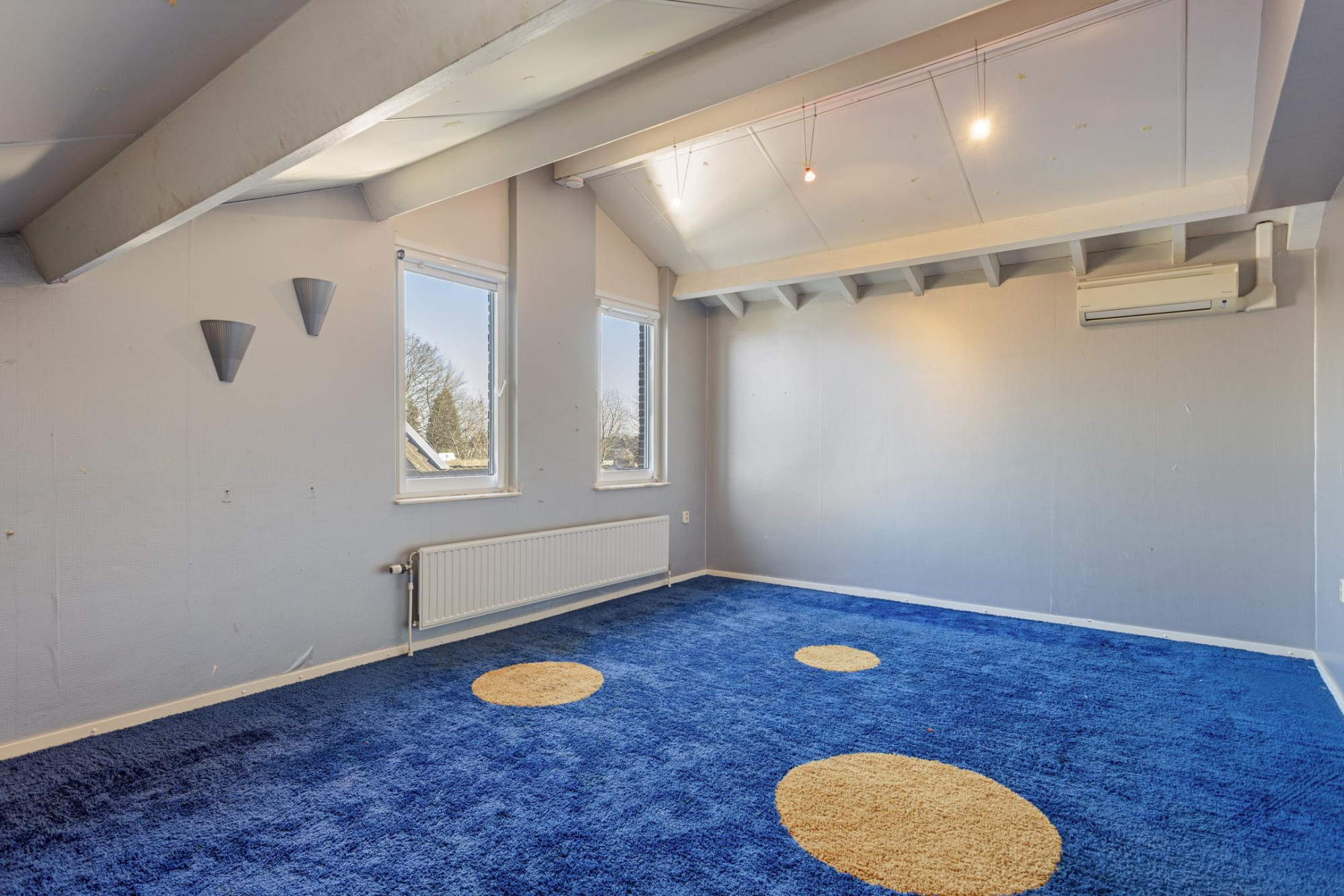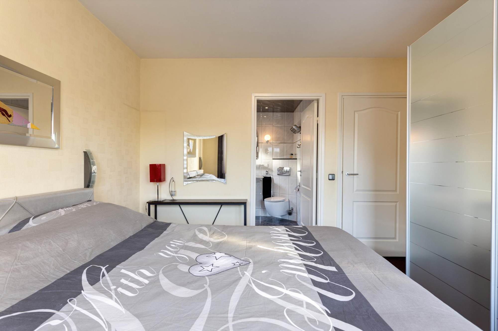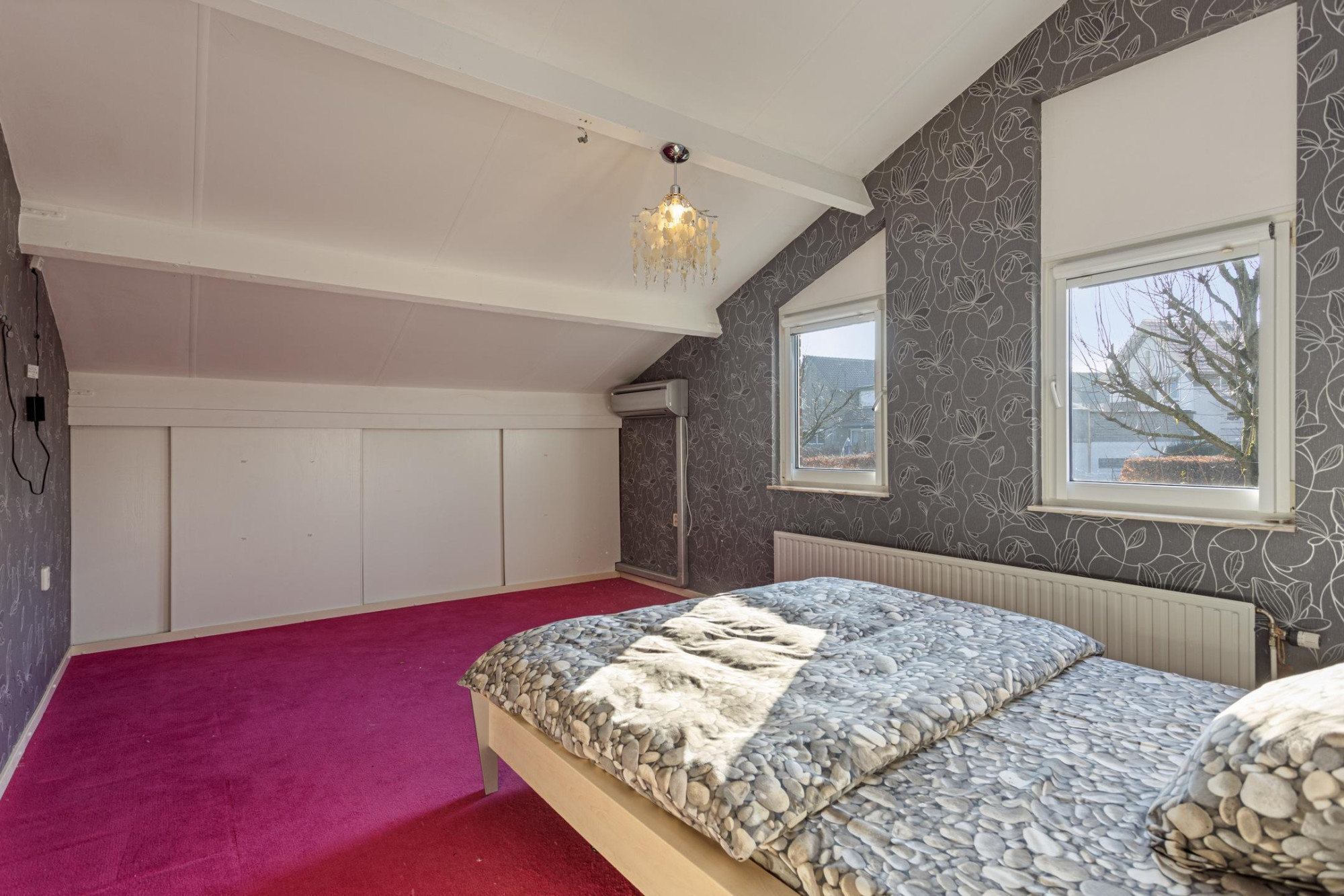 Slaapkamer (ca. 13 m²), gelegen aan de zijde van de achtertuin en voorzien van een Artcool Gallery Airco-Set.
