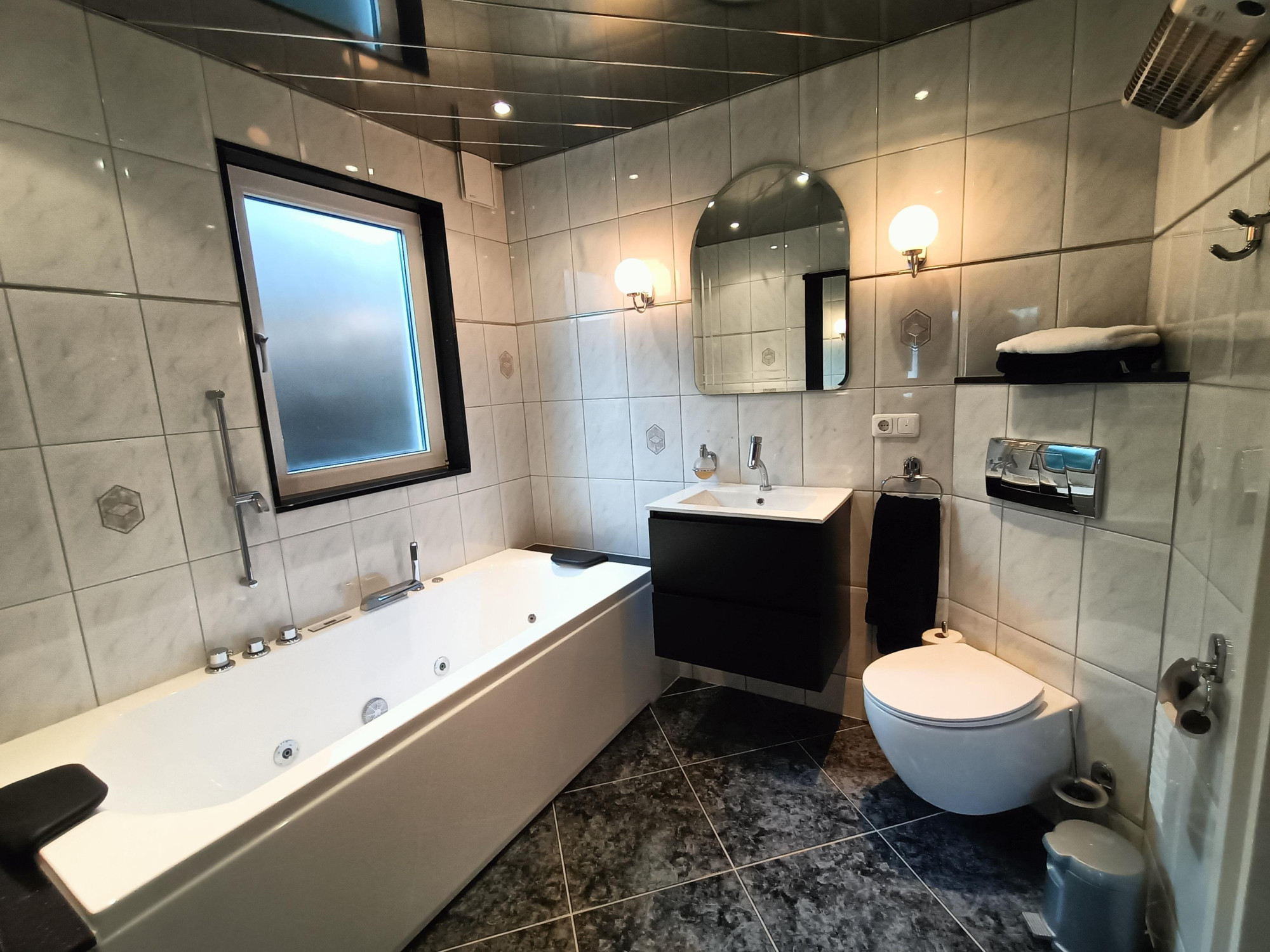 Aan slaapkamer grenzende badkamer, voorzien van een gloednieuw bubbelbad, wastafel, toilet en designradiator.