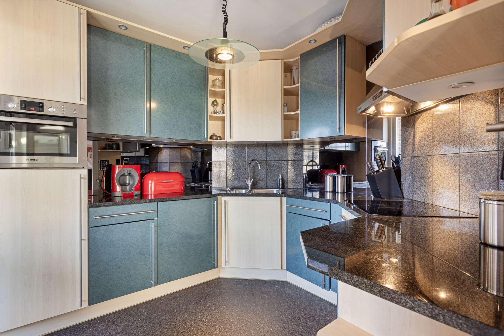 De keuken (ca. 7 m²) is hoogwaardig afgewerkt met een granieten werkblad en is o.a. voorzien van een inductie kookplaat met wasemkap, koelkast, vaatwasser en combi-magnetron (apparatuur o.a. Bosch en Siemens). Ook de keuken biedt rechtstreekse toegang tot de achtertuin.
