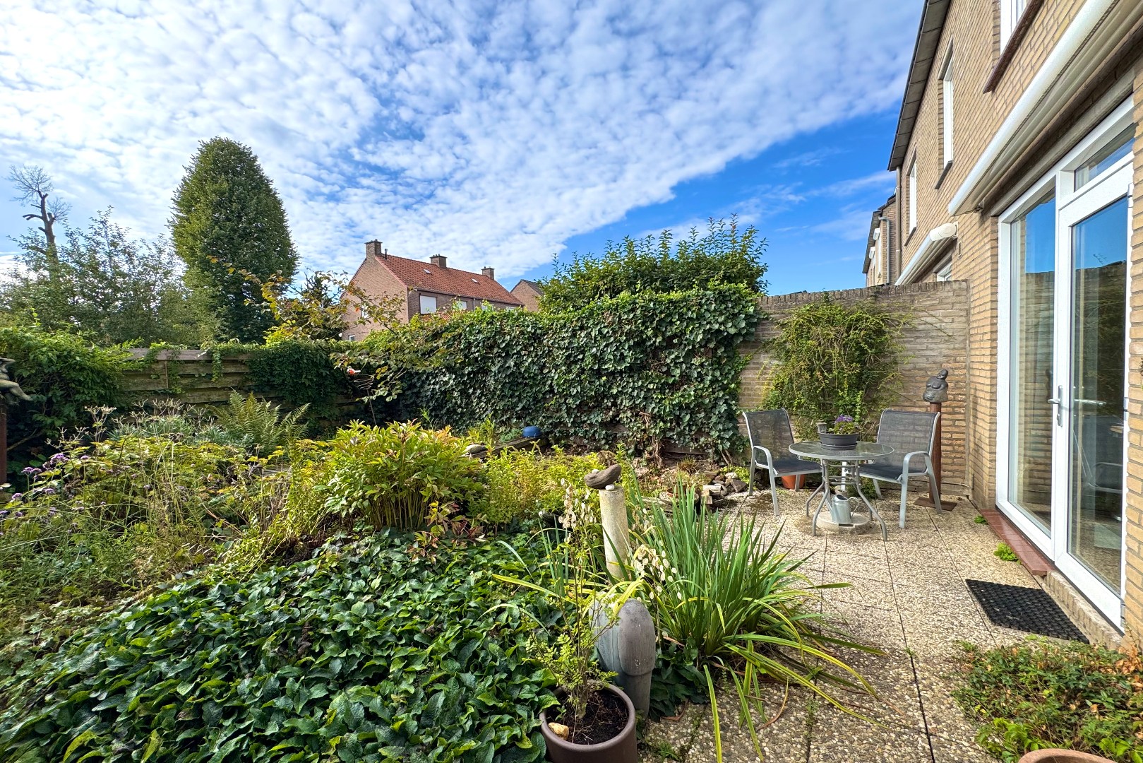De achtergelegen tuin, die men bereikt via zowel de woonkamer als de functionele ruimte, is gesitueerd op het zuidoosten. Deze tuin beschikt over een terras en borders. Tevens is er een zonnescherm aanwezig.