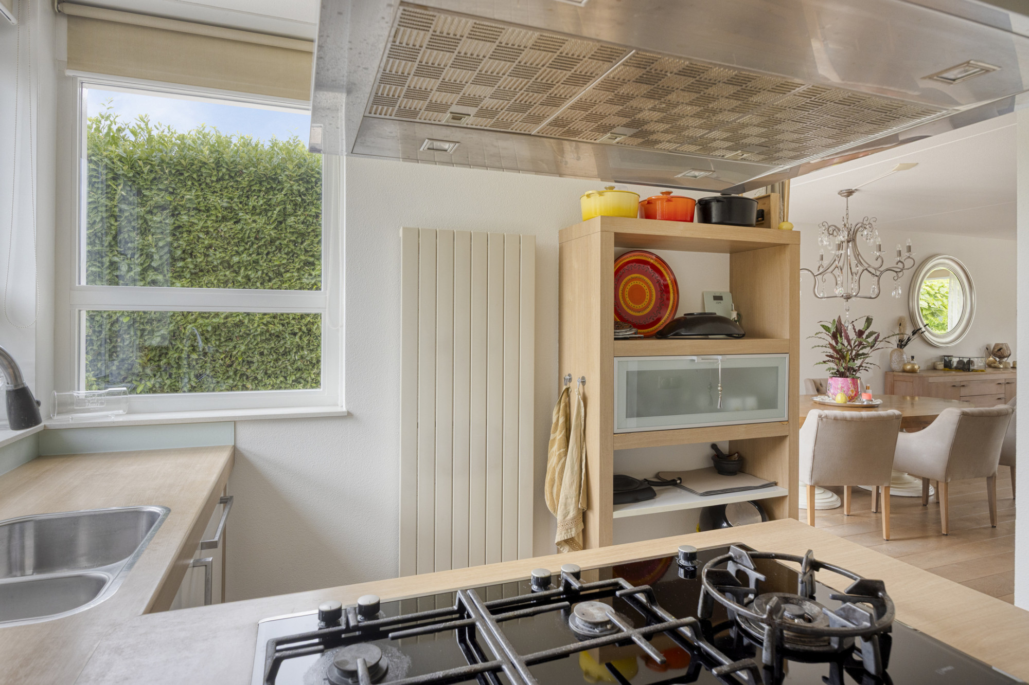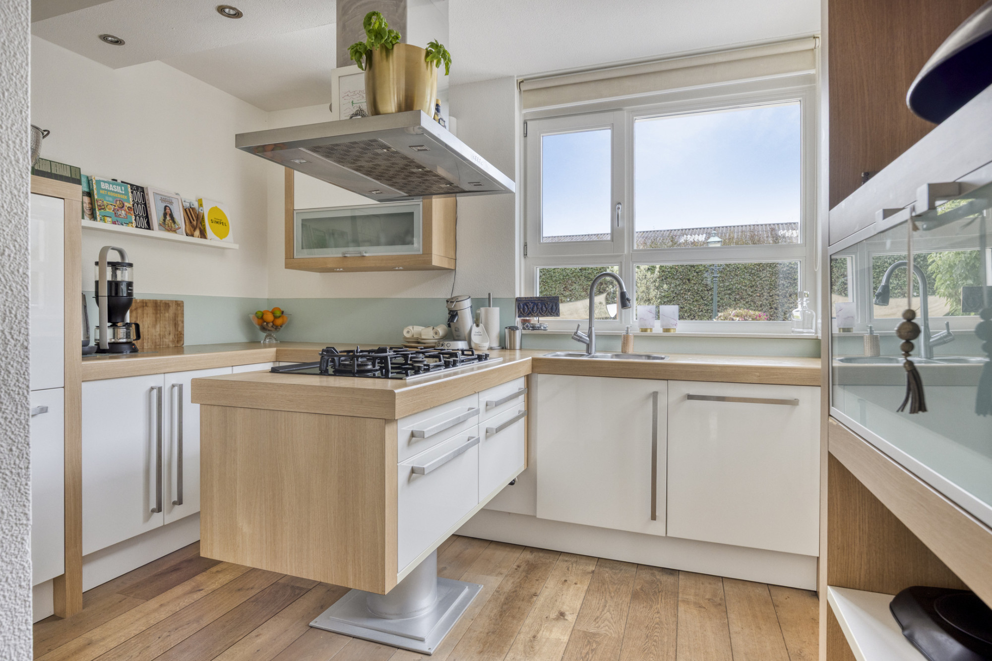 Open keuken, voorzien van diverse inbouwapparatuur zoals een afzuigkap, combi-oven, koelkast, vaatwasser en gaskookplaat.