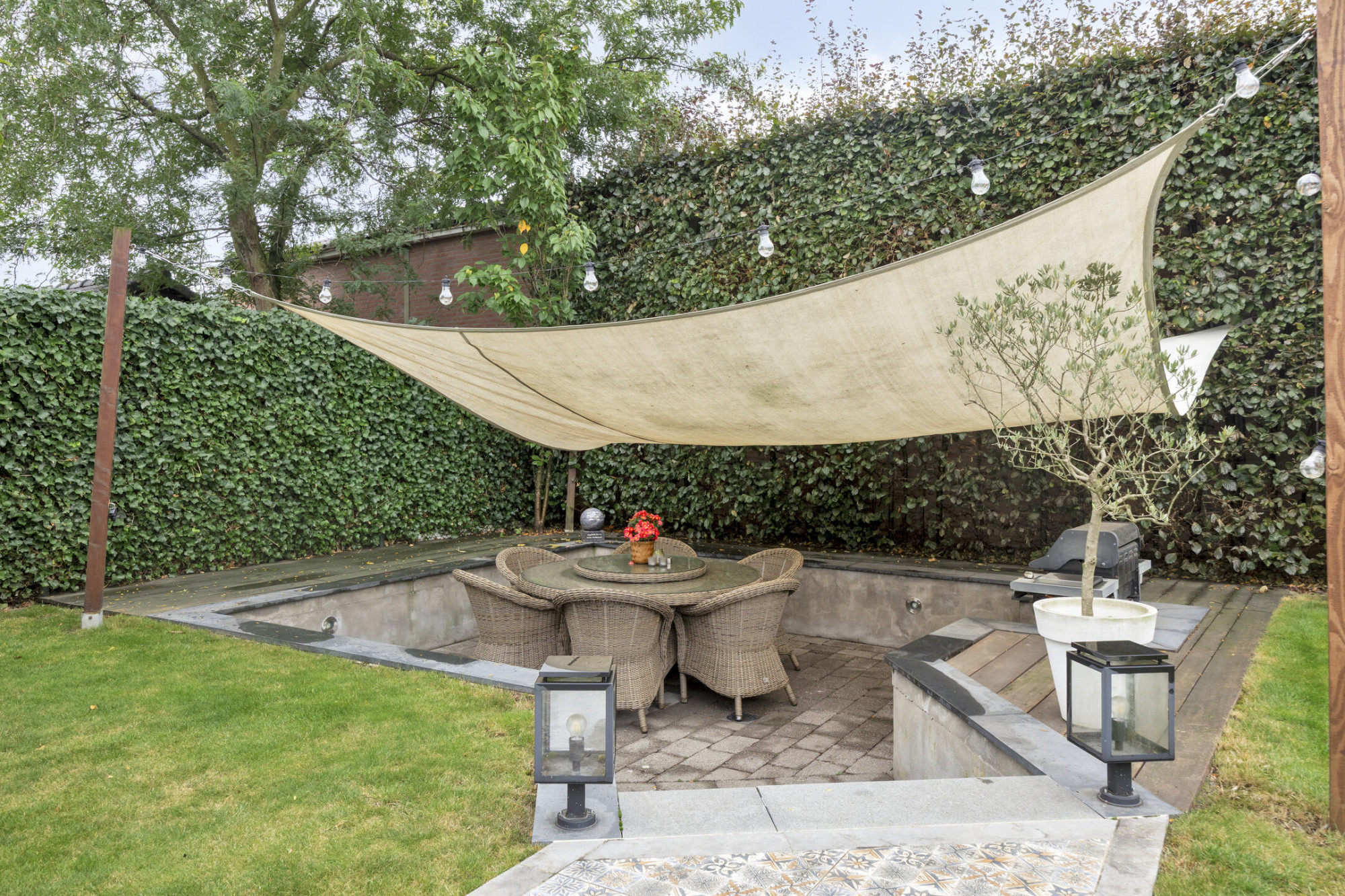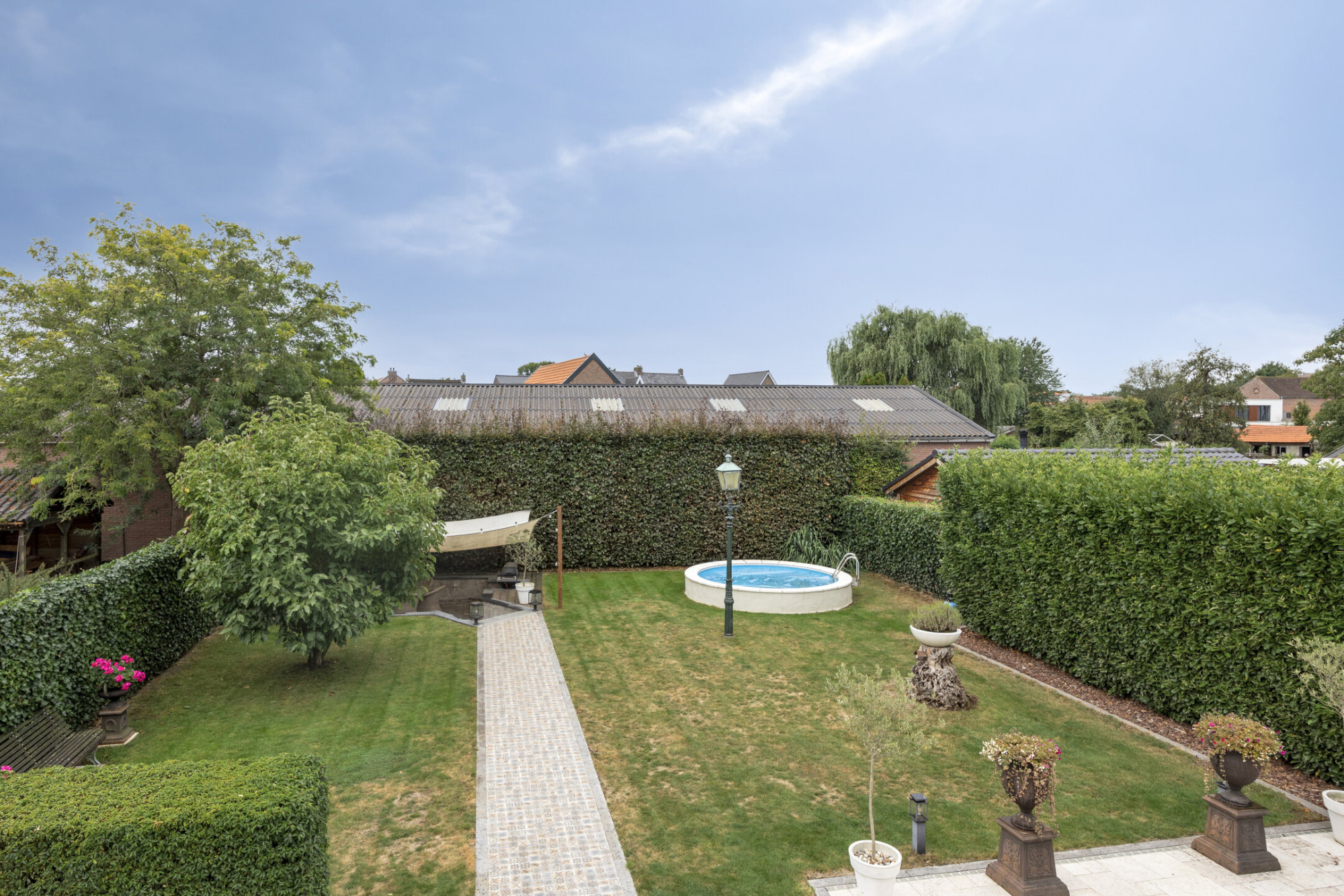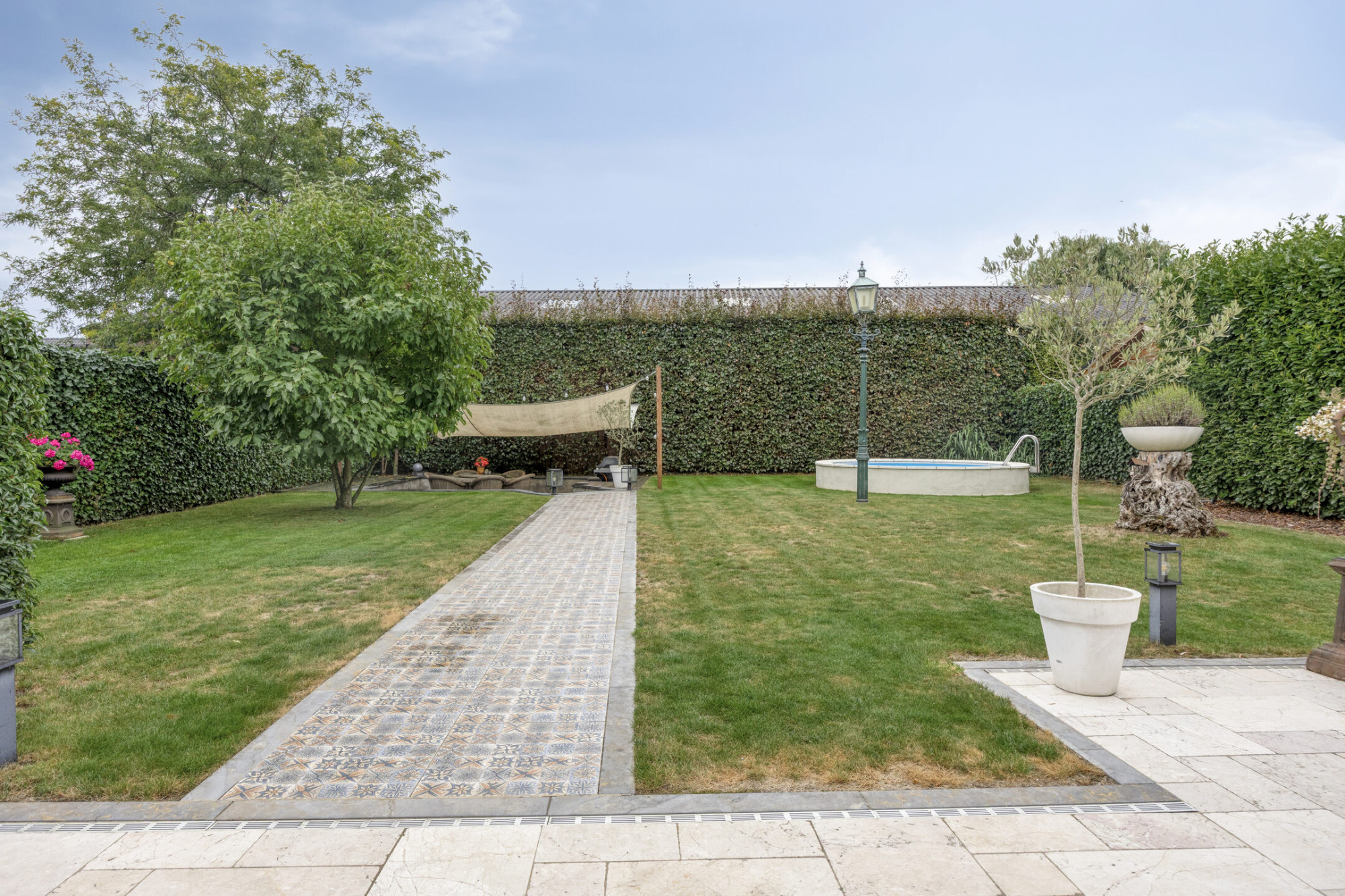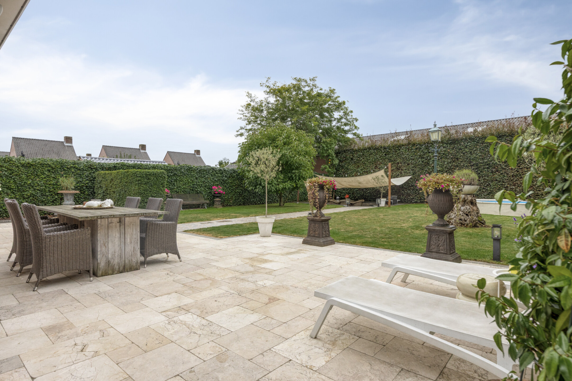 Prachtige tuin met een buitenzwembad en een terras, ideaal voor zomerse dagen.