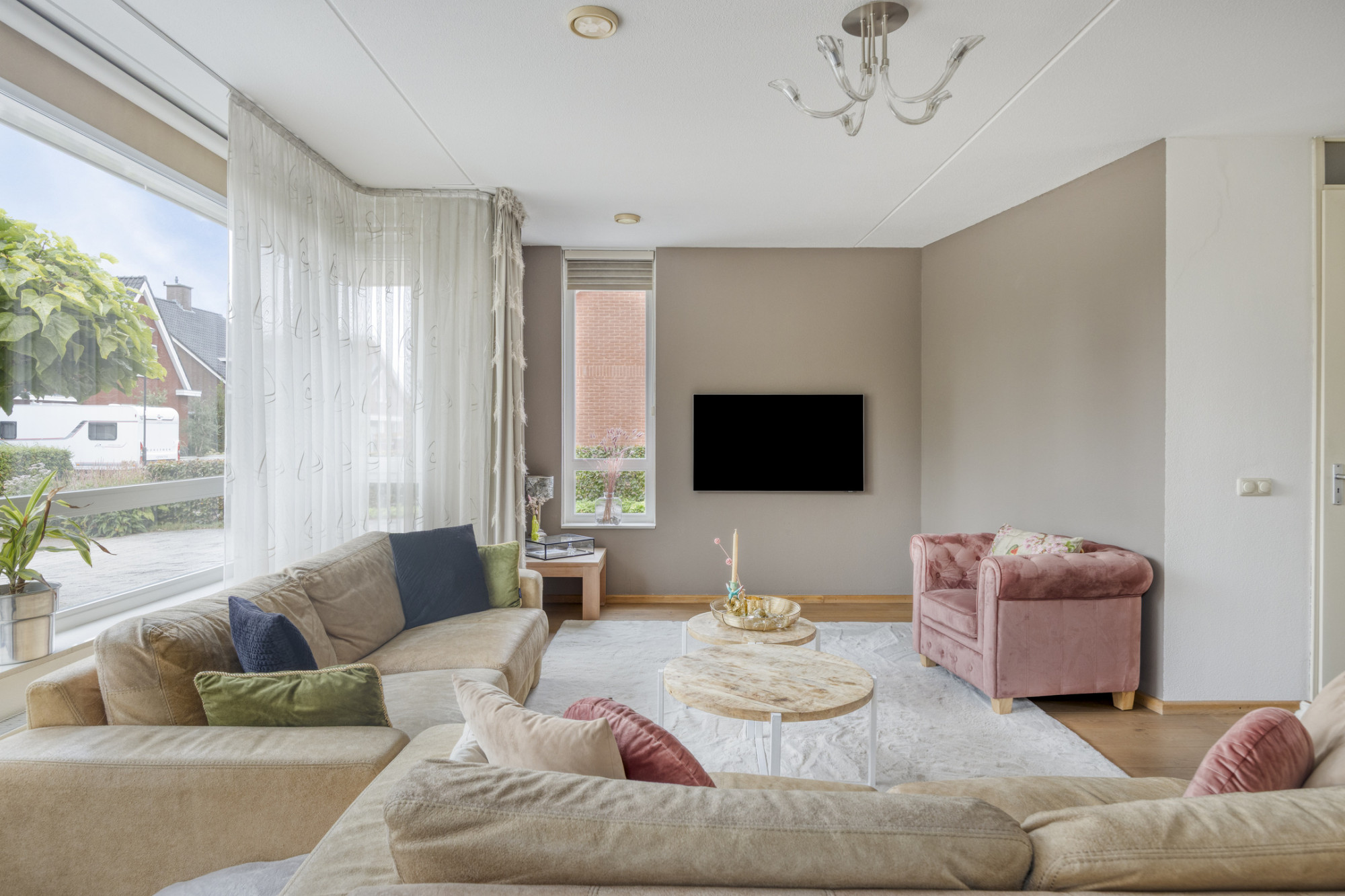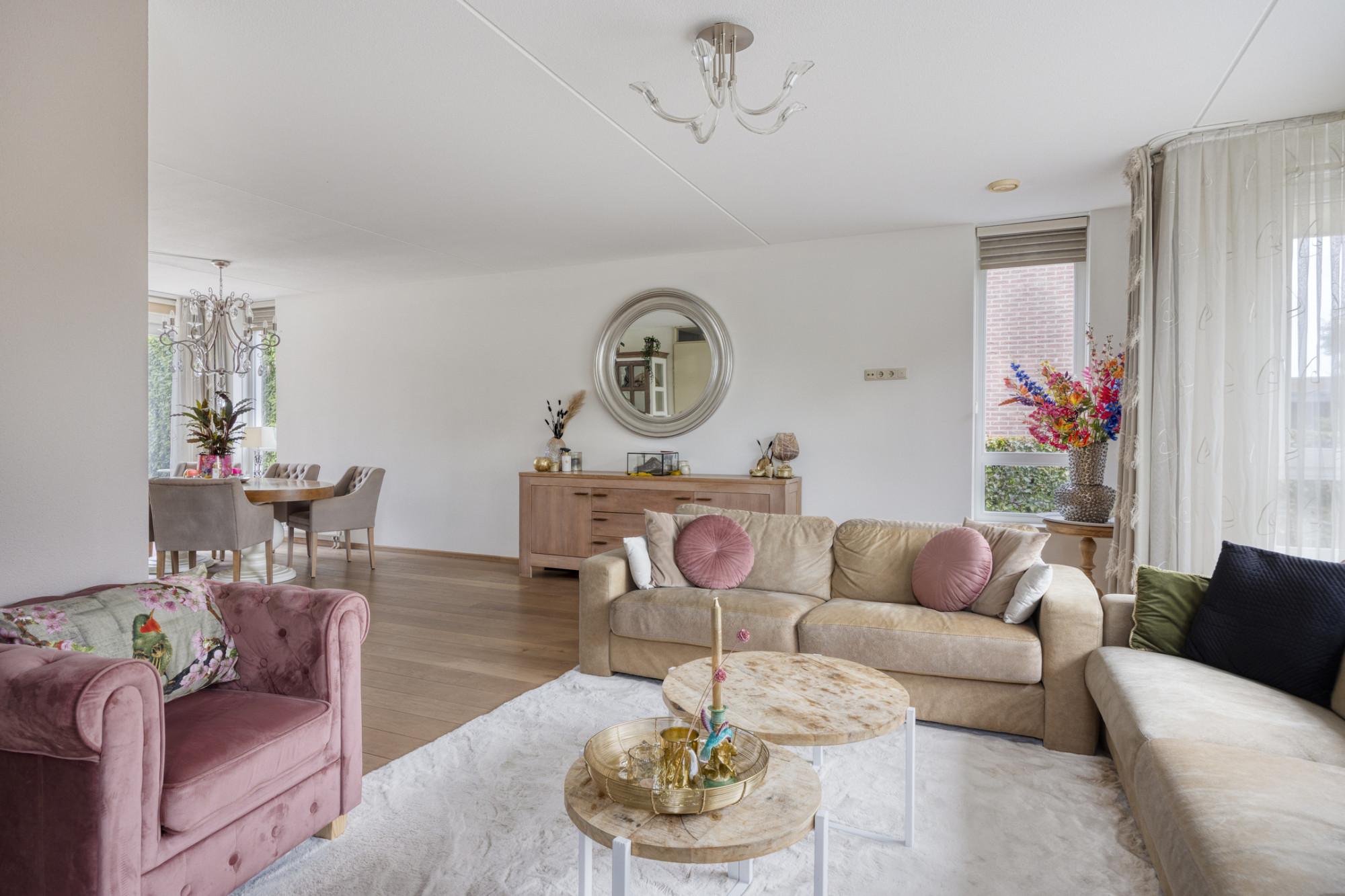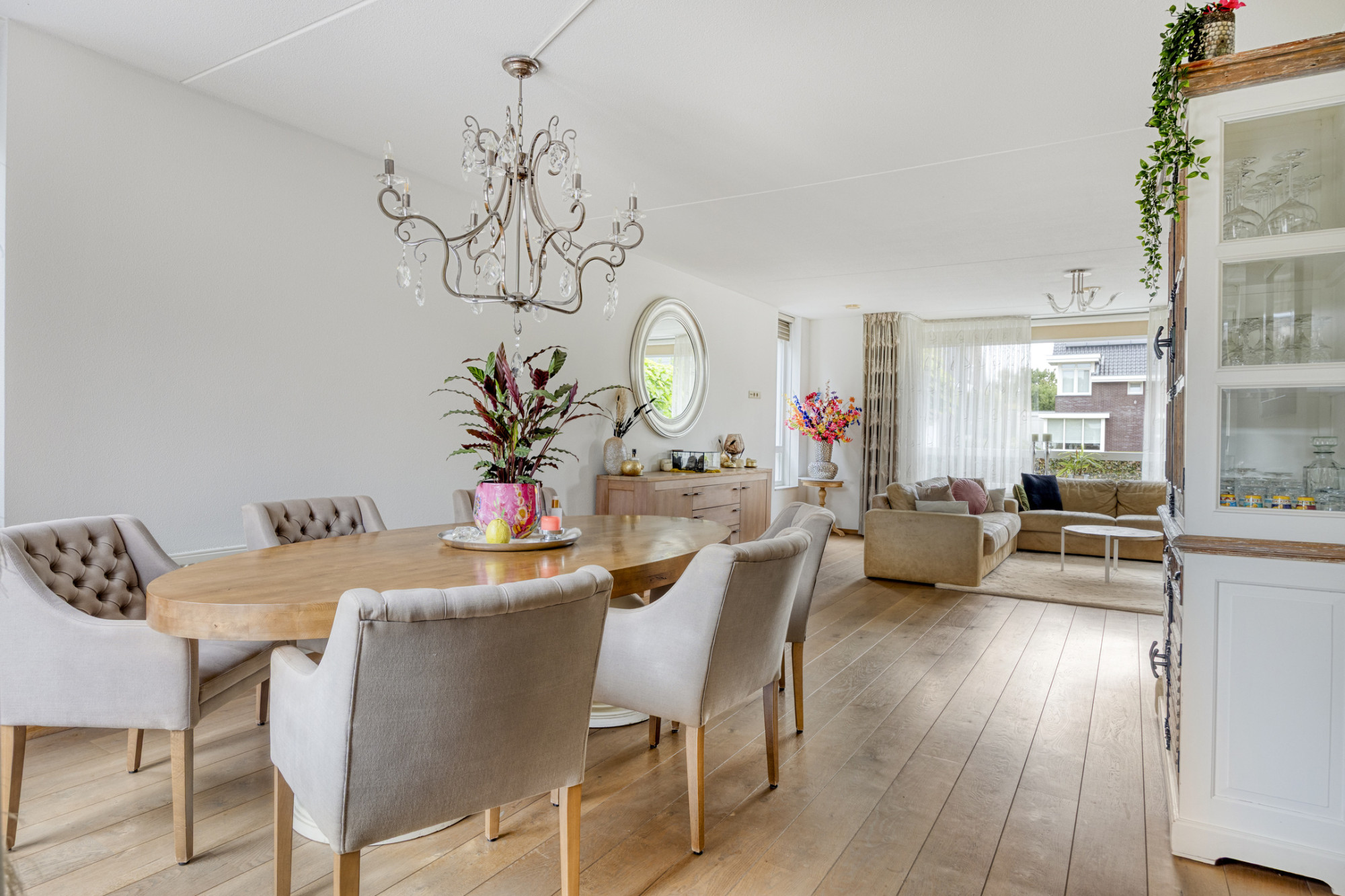 Royale woonkamer met een prachtige houten parketvloer, ideaal voor gezellige momenten met familie en vrienden.