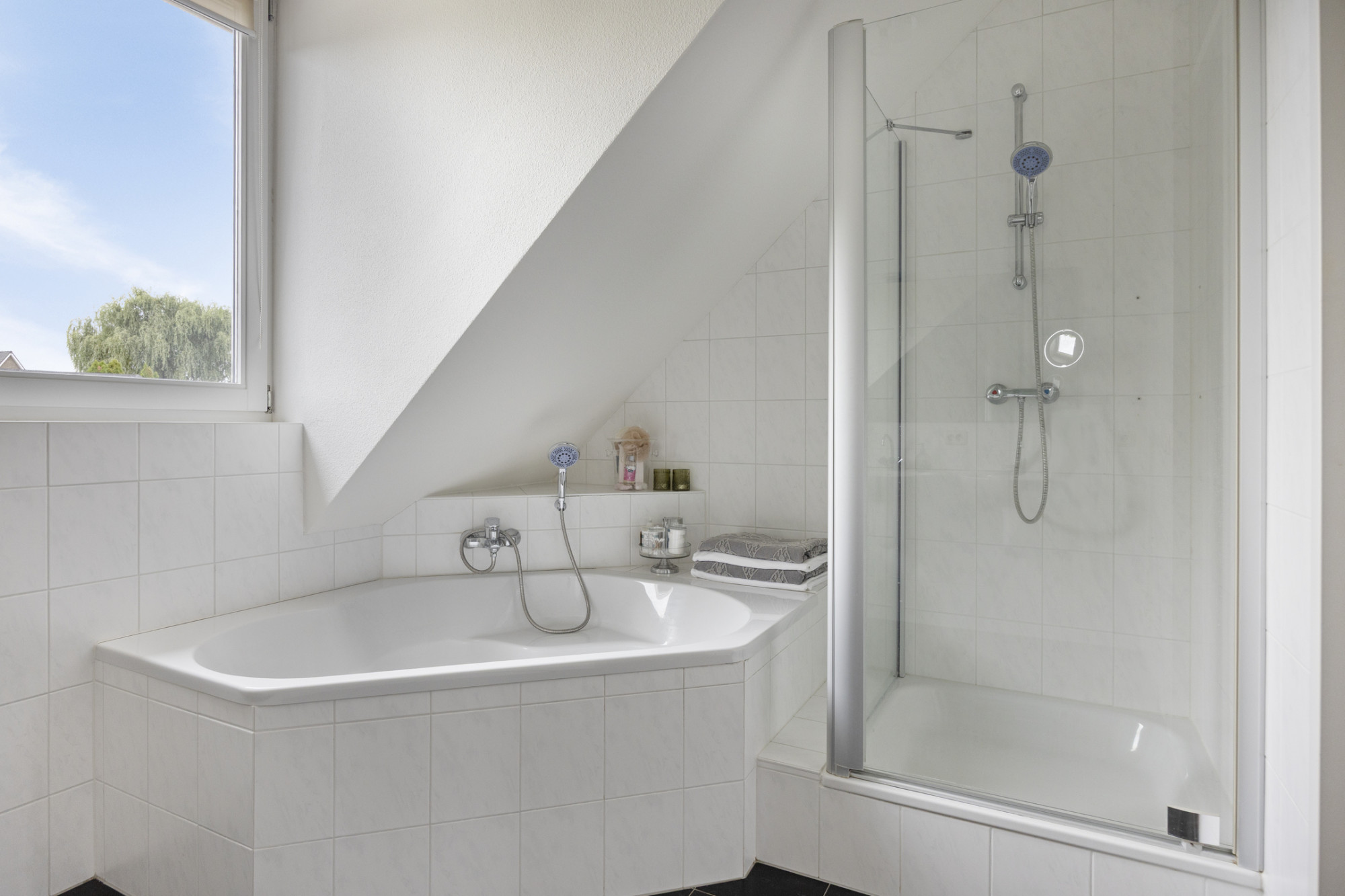 Moderne badkamer met luxe voorzieningen: een heerlijk hoekbad, een inloopdouche en een dubbele vaste wastafel.