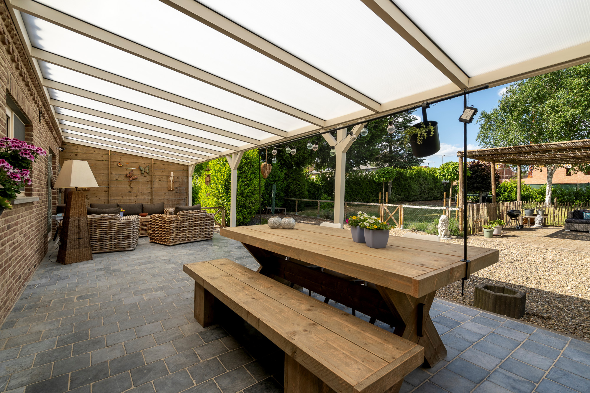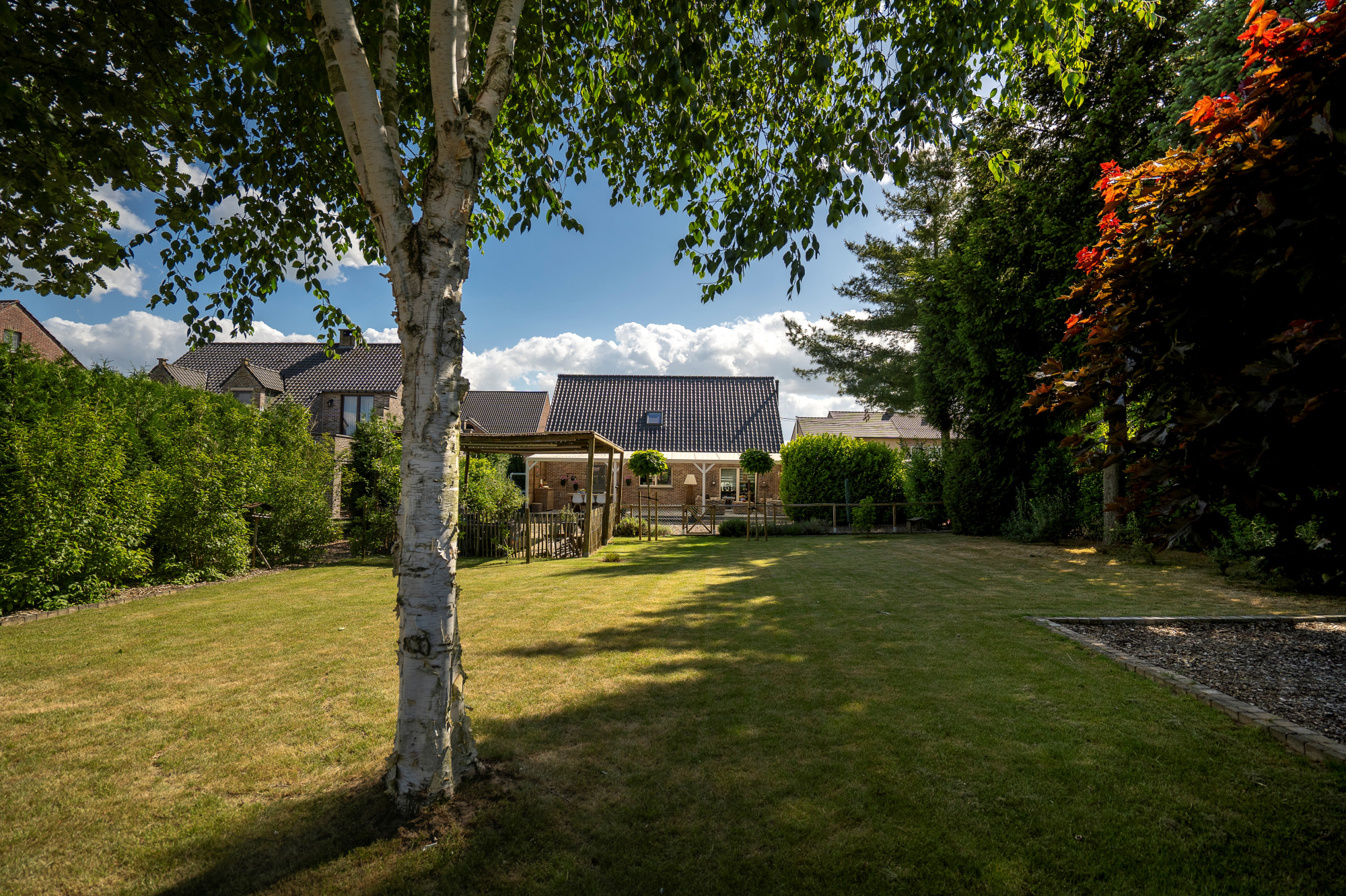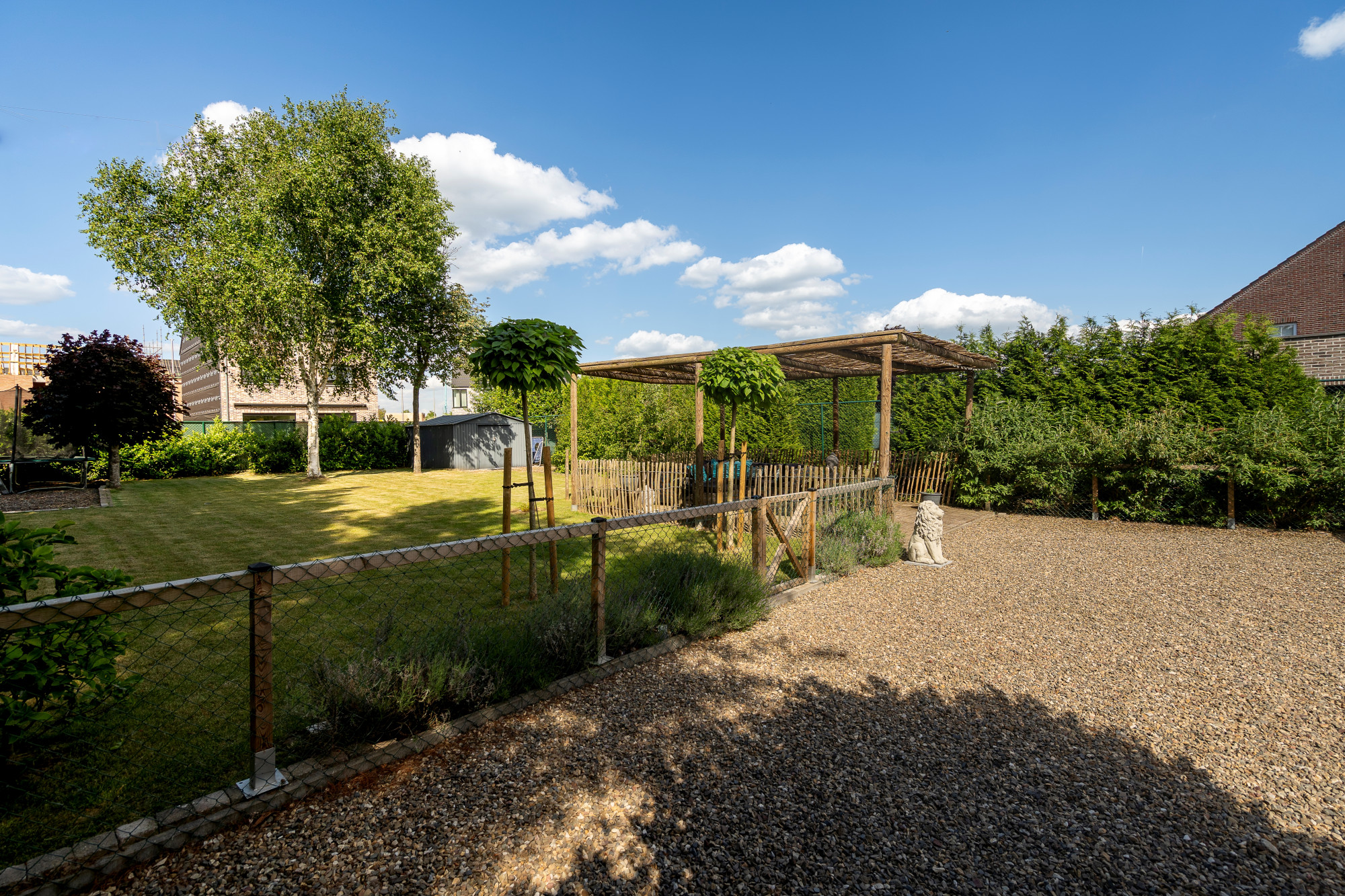 Through the spacious entrance hall with guest toilet and vestibule, there is access to the living room, closed living kitchen, intermediate hall including washbasin and exterior door, 1st bathroom and bedroom 1/polyvalent room. The fully fenced and landscaped outdoor area features a driveway, outdoor parking, covered terrace and lounge, garden shed, paving (natural stone, concrete bricks, pebble deck), lawn and various mature plantings.