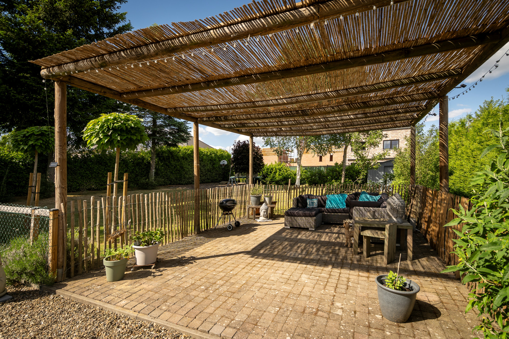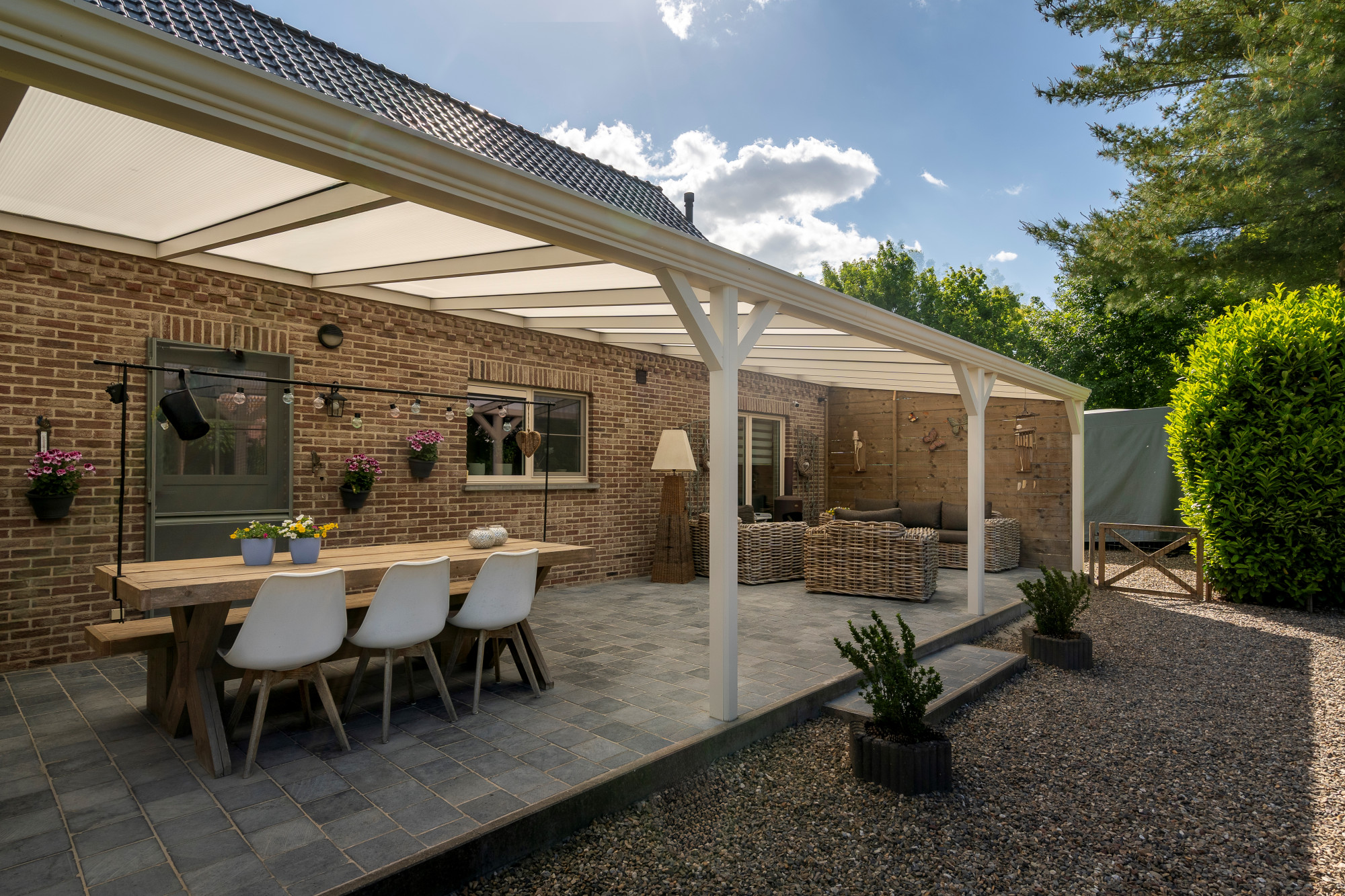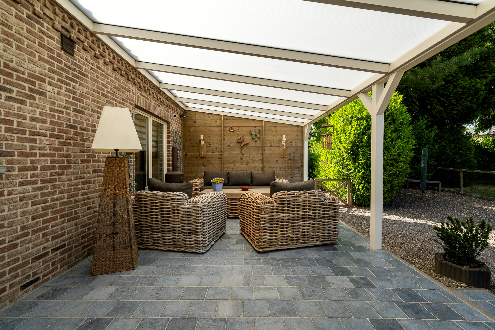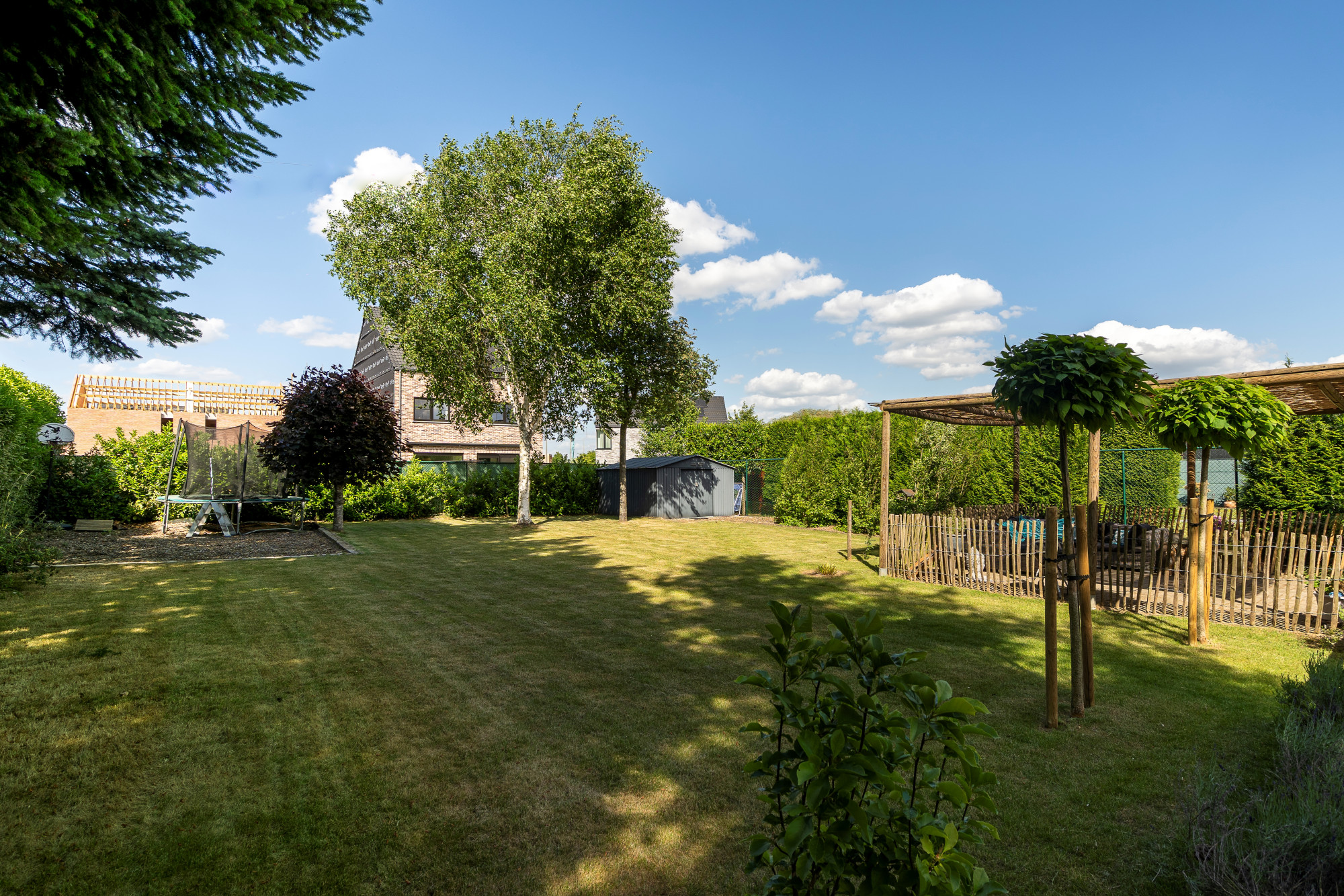 Through the spacious entrance hall with guest toilet and vestibule, there is access to the living room, closed living kitchen, intermediate hall including washbasin and exterior door, 1st bathroom and bedroom 1/polyvalent room. The fully fenced and landscaped outdoor area features a driveway, outdoor parking, covered terrace and lounge, garden shed, paving (natural stone, concrete bricks, pebble deck), lawn and various mature plantings.