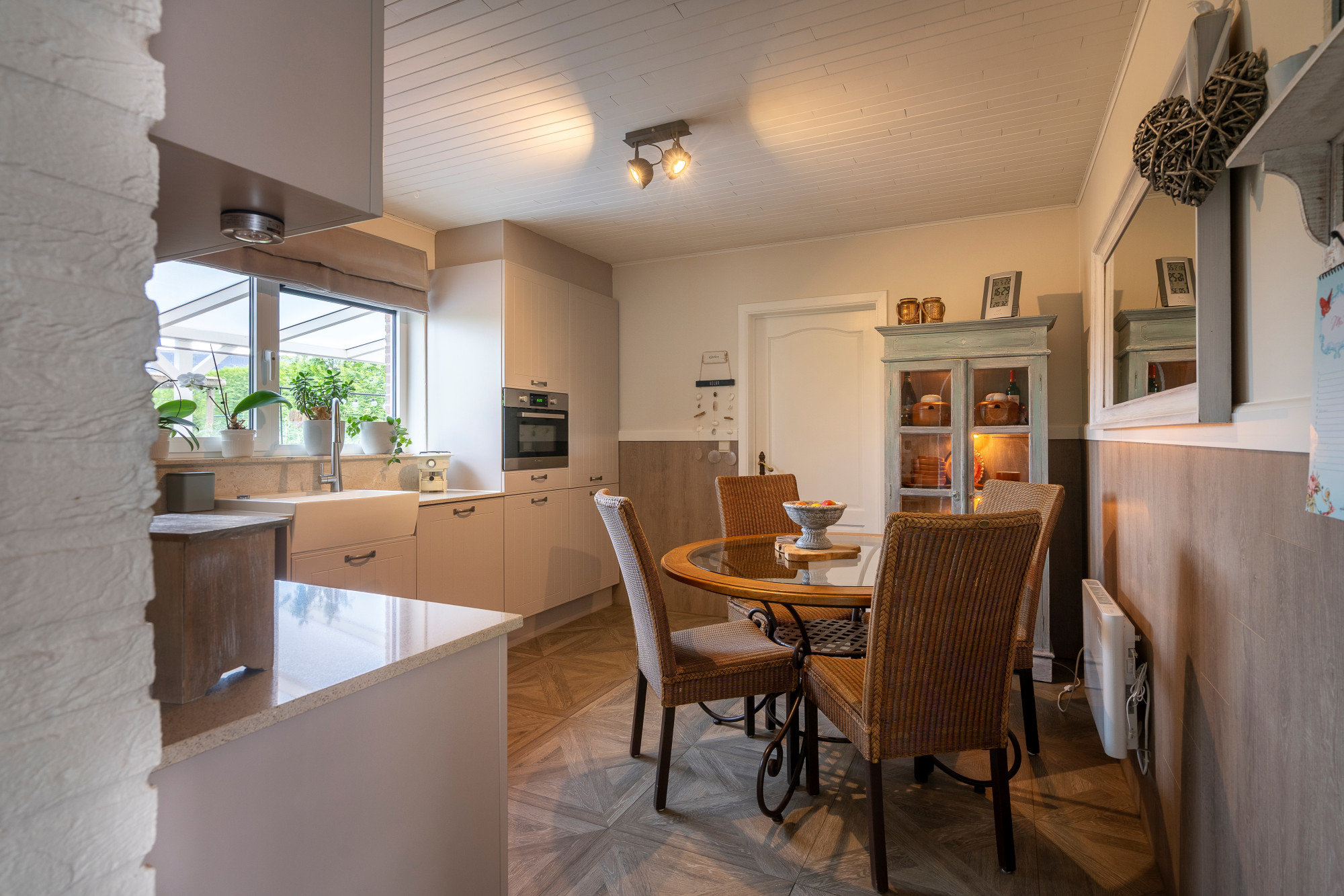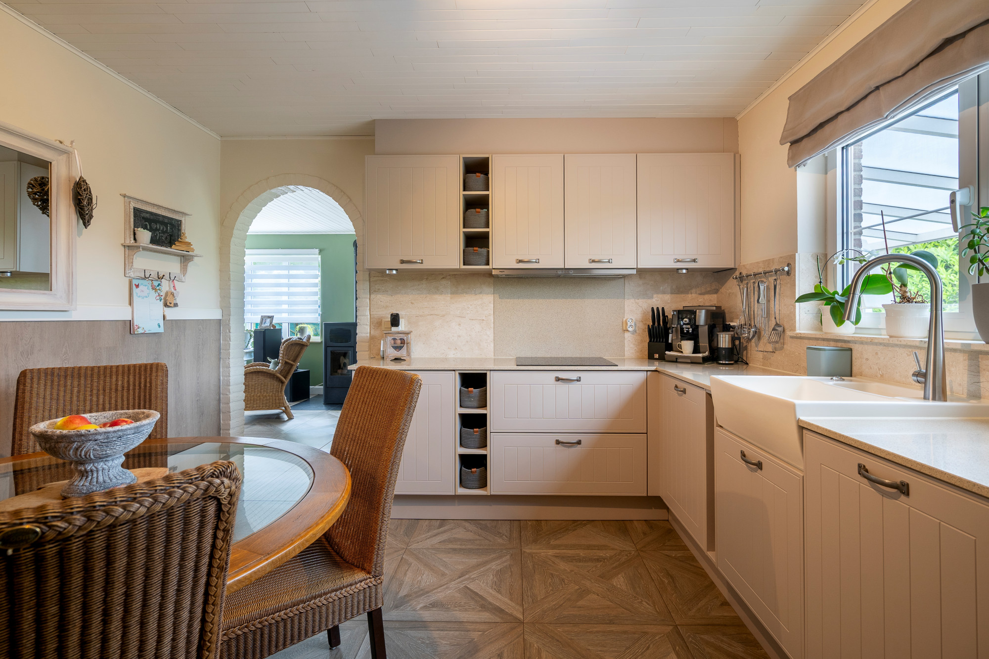 The bespoke kitchen is finished in a set of low and high cabinets with work surfaces in natural stone, A-brand appliances, large sink, induction hob with matching extractor fan, dishwasher, combination oven, fridge, freezer.